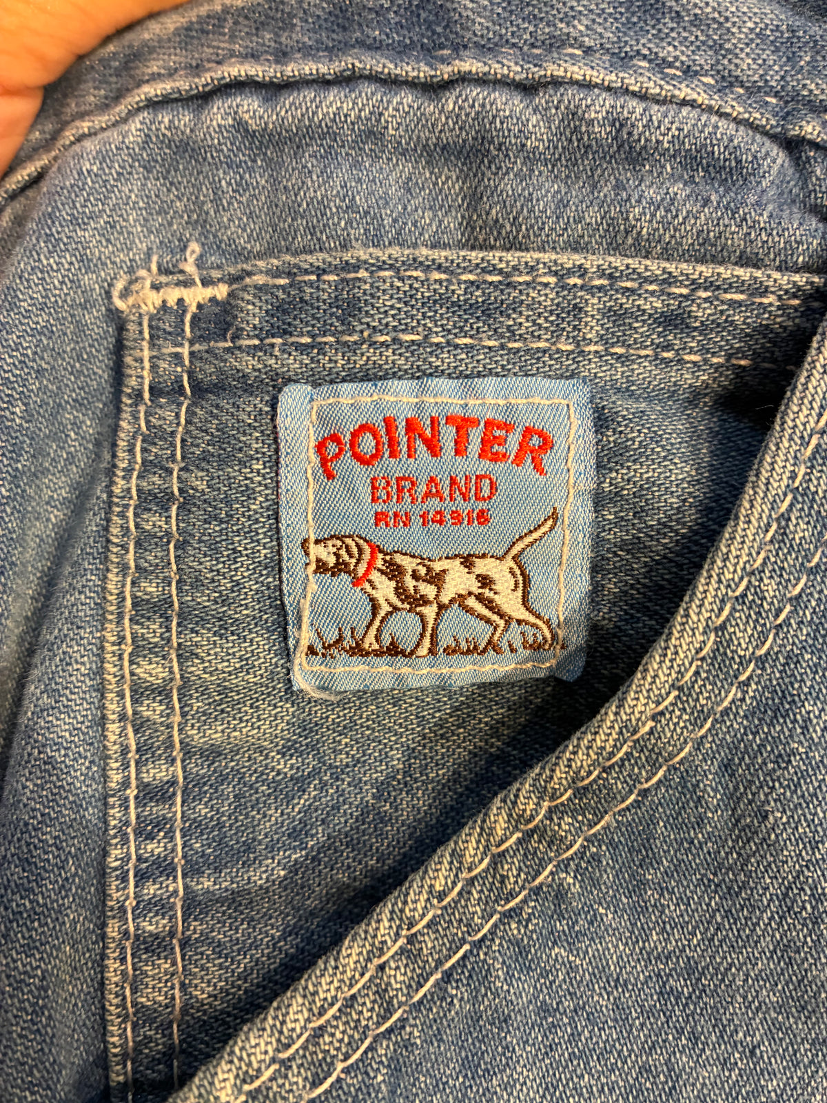 アメリカの老舗ワークウェアブランド〈POINTER BRAND〉による、90年代〜2000年代初頭頃の一本。 象徴的な猟犬と筆記体ロゴのボタンが存在感を放つ、当時のディテールが詰まったUSEDモデルです。 ライトオンスの柔らかなデニム地で、程よいフェード感も魅力。