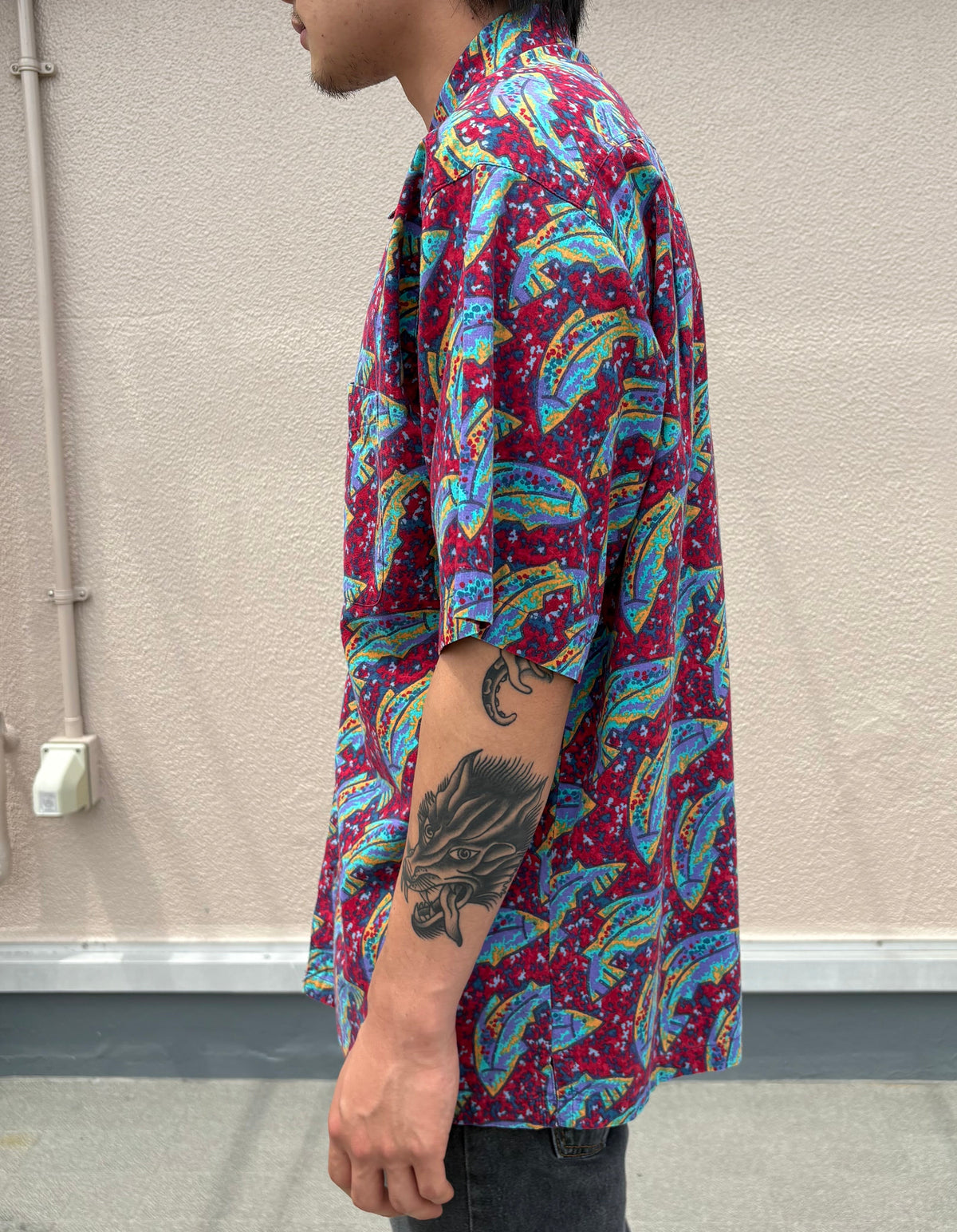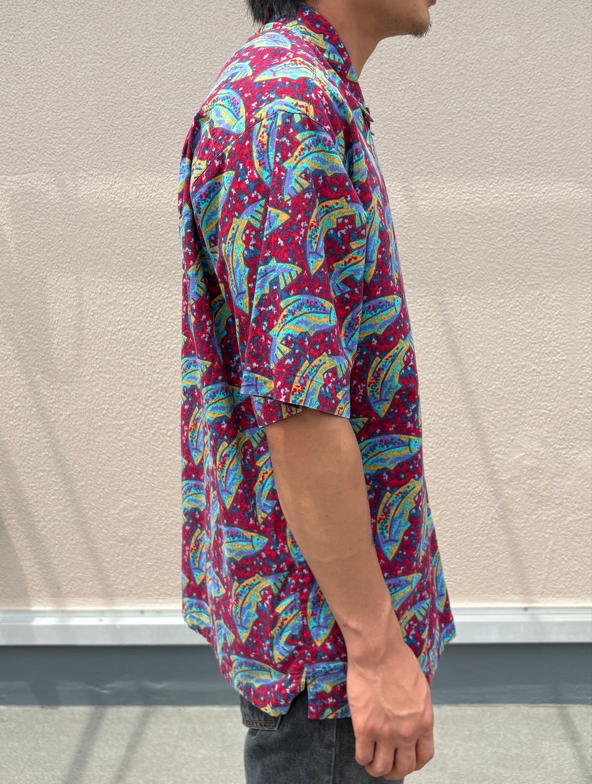 全体的に色鮮やかなカラーリングで、レアなフライングフィッシュパーターンのハワイアン,アロハシャツタイプです。