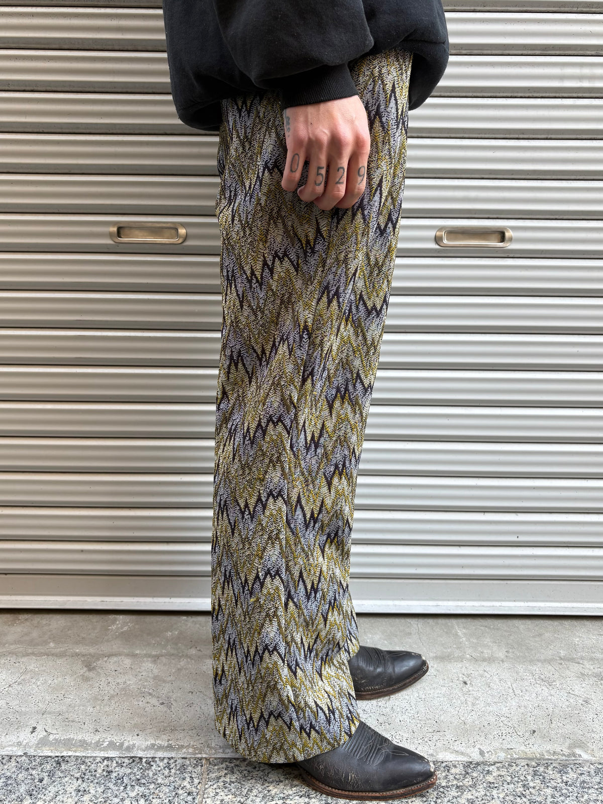 イエロー・ホワイト・ブラックを組み合わせた独特の配色が目を引き、コーディネートの主役として活躍するパンツです。