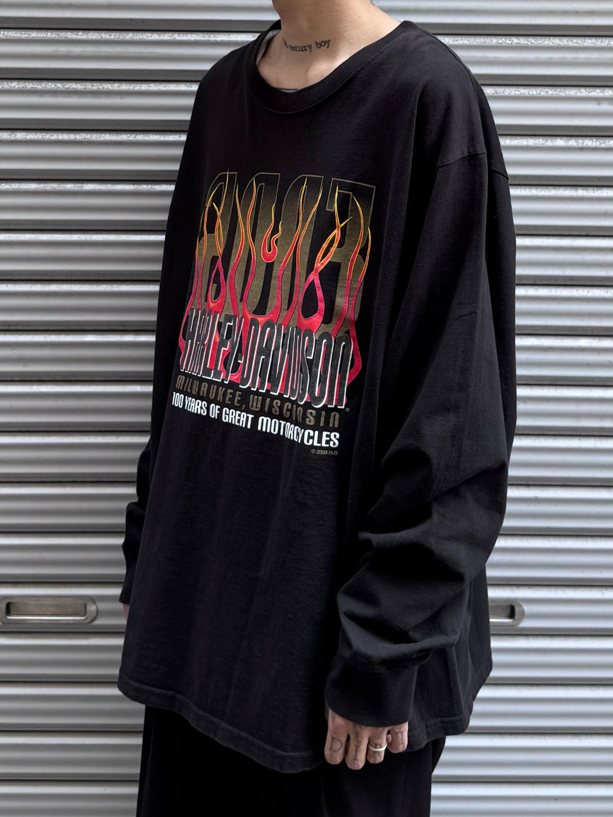 胸元にはブランドロゴと燃え上がるようなファイヤーパターンがプリントされ、アメリカンバイカーのスピリットを象徴する一枚に仕上がっています。
