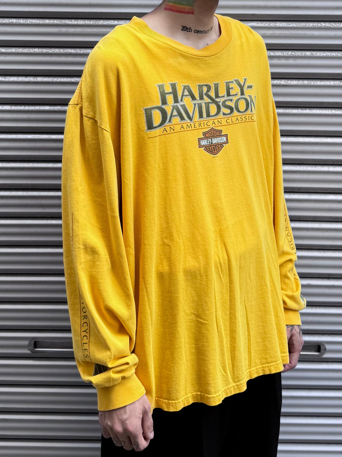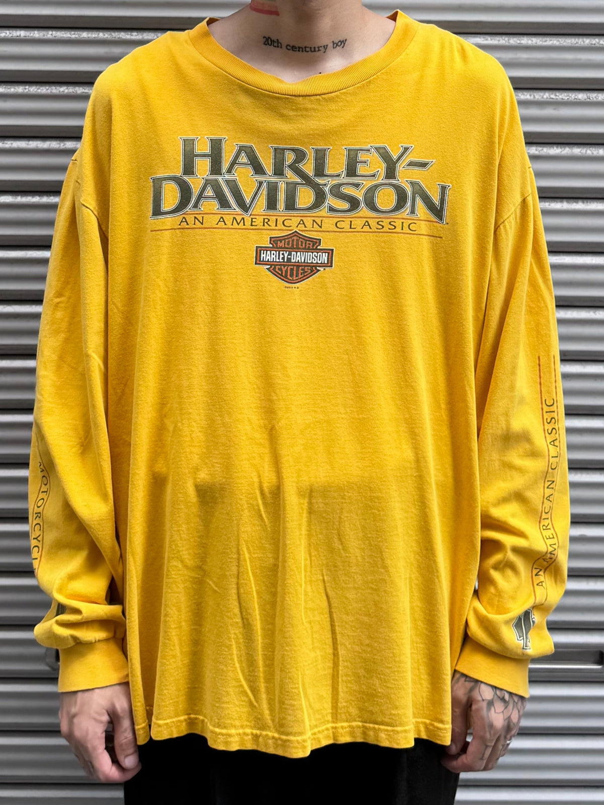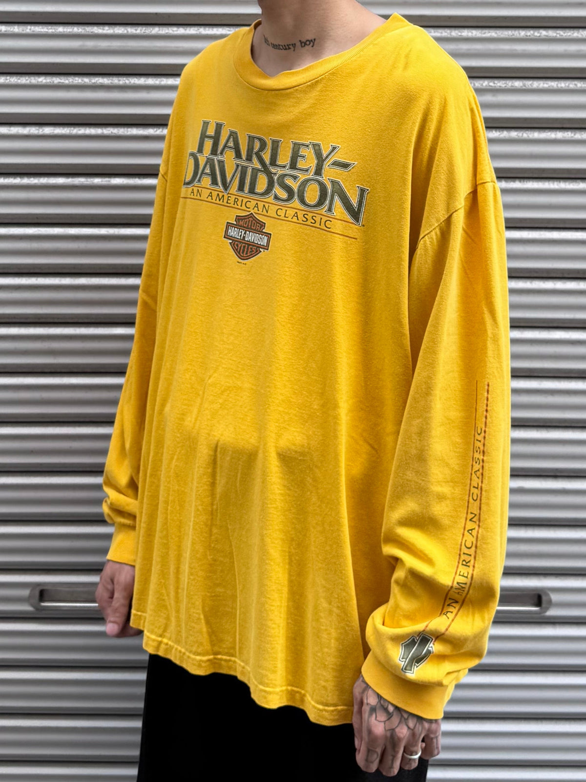 鮮やかなイエローボディが目を引く、ハーレーダビッドソンのロングスリーブTシャツ。