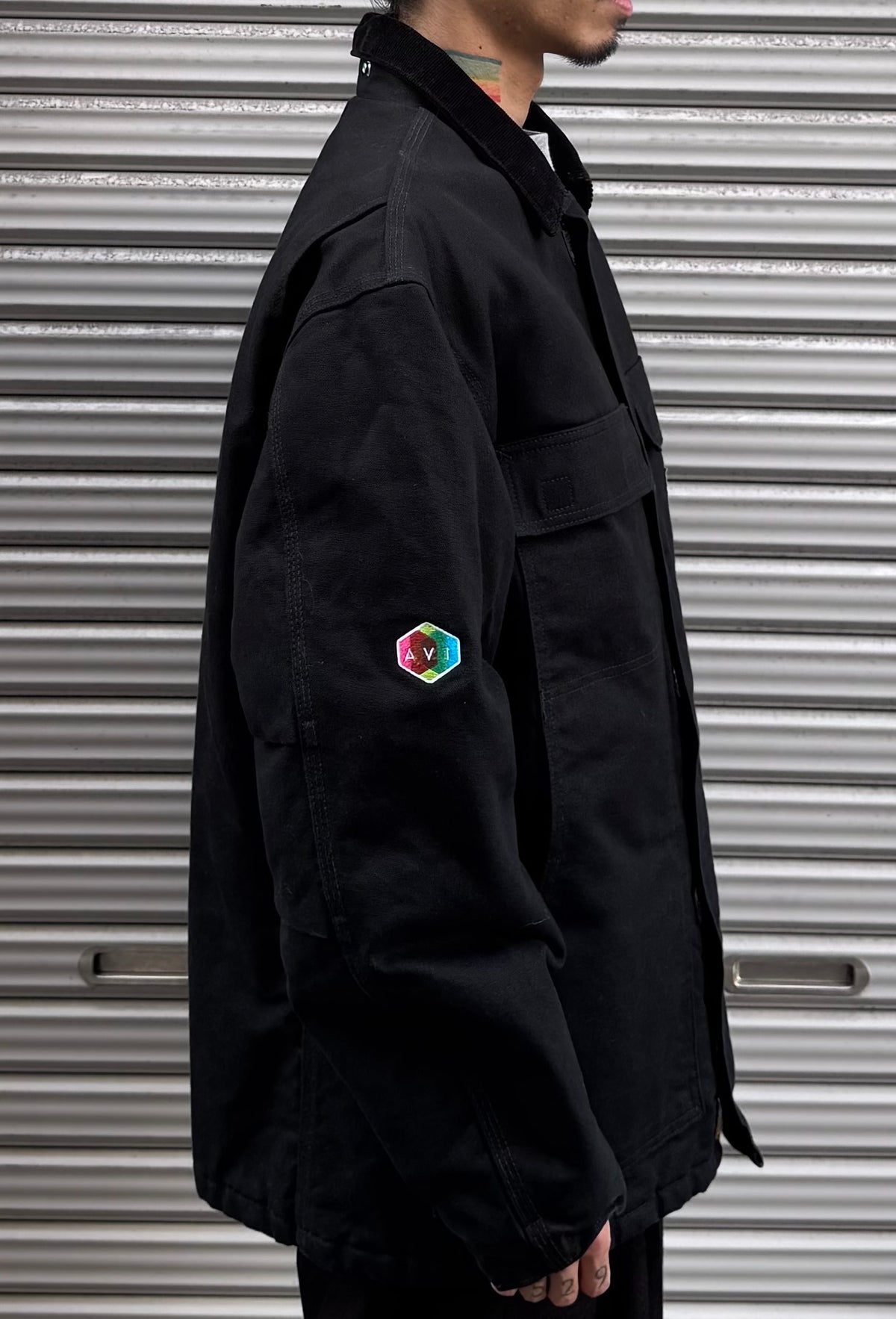 フロントは比翼仕立て、胸ポケットにはブランドのスクエアロゴパッチ、襟はコーデュロイ切り替えでワークらしいクラシックな雰囲気。