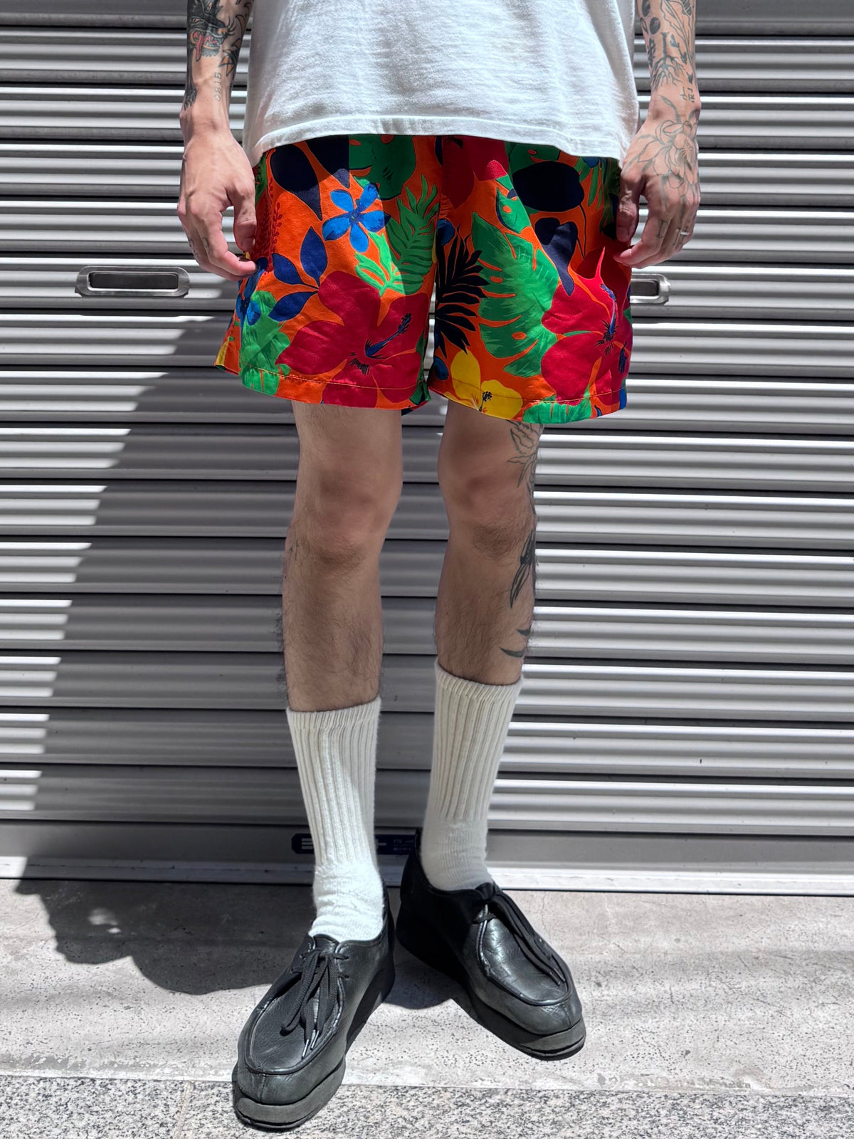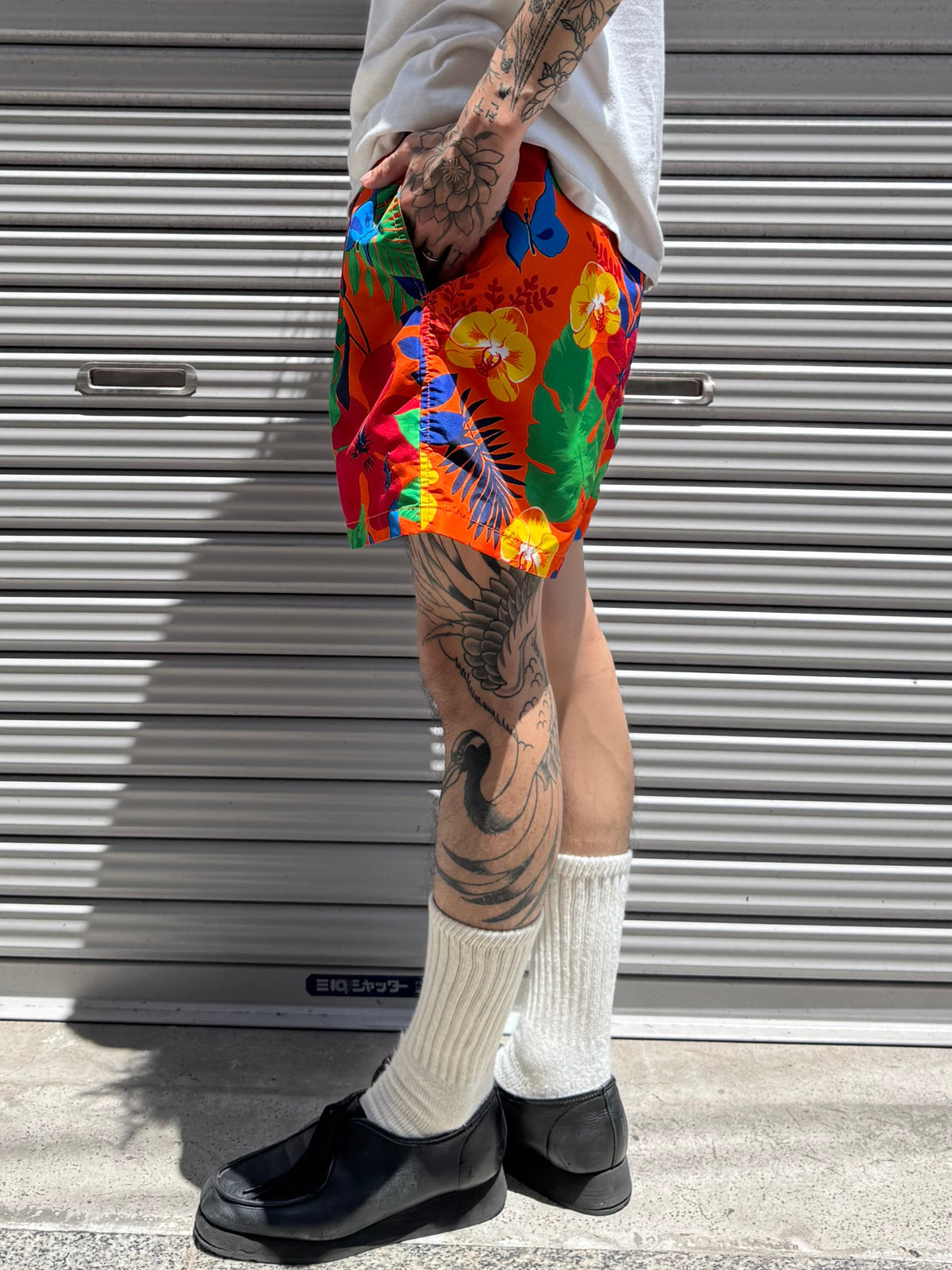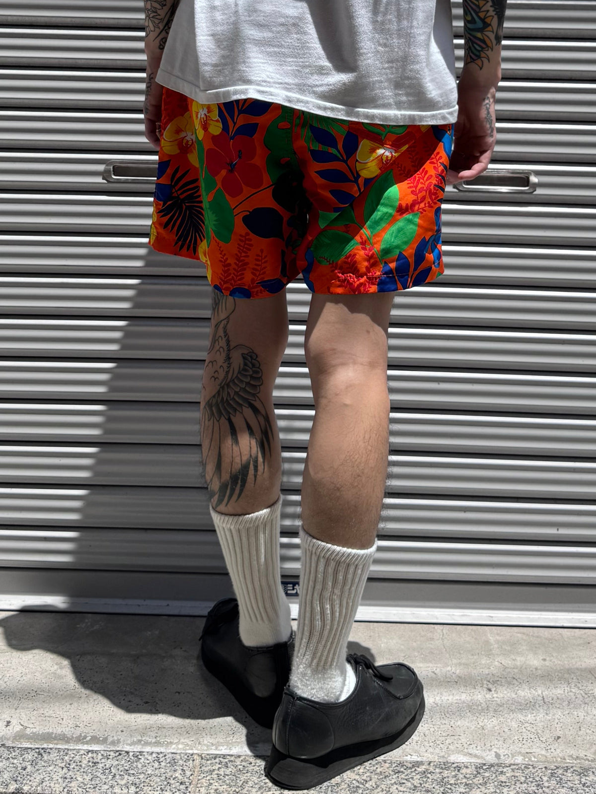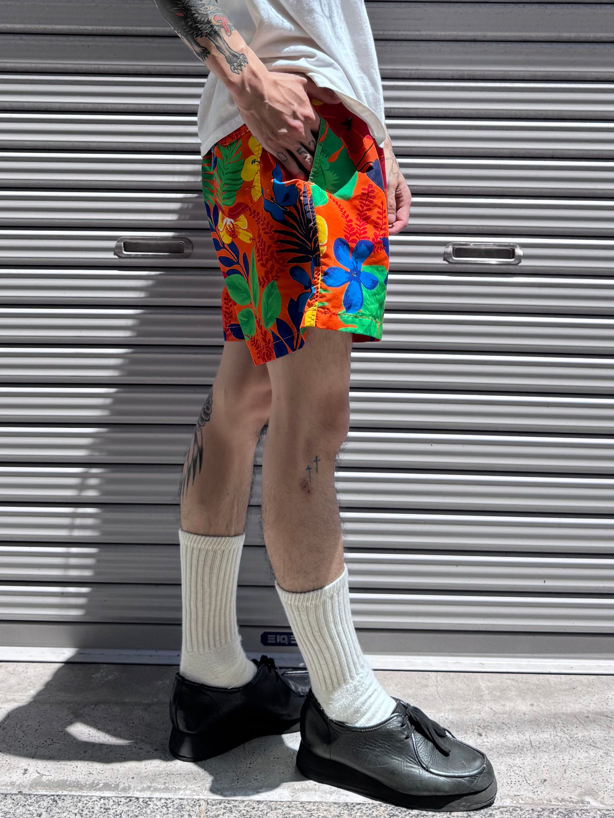 鮮やかなオレンジを基調に、夏らしい柄を全面にあしらったスイムショーツ。