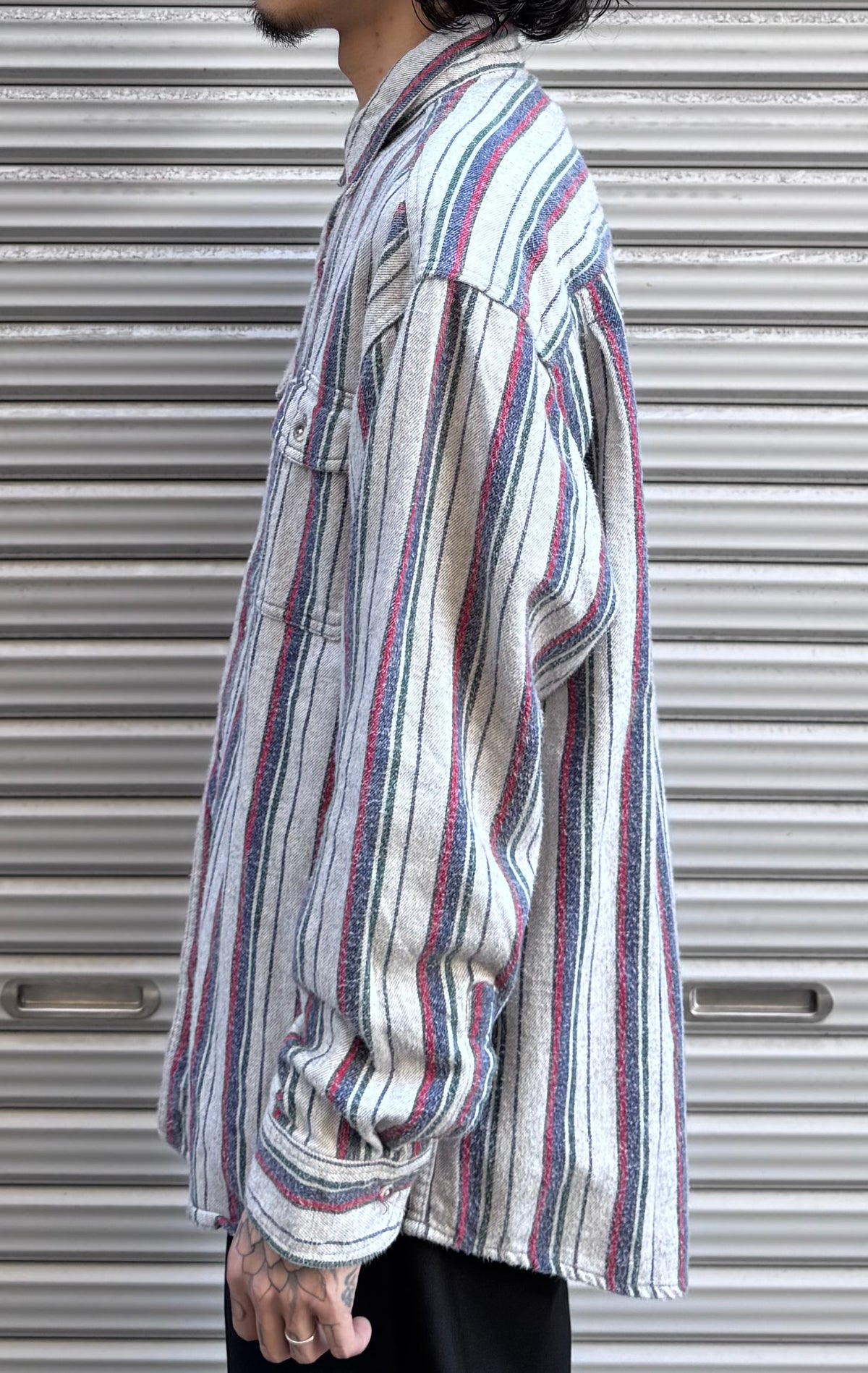 赤×ネイビー×グレーの縦ストライプがクラシカルで、どこかアウトドアブランドらしい落ち着いた印象を演出します。
