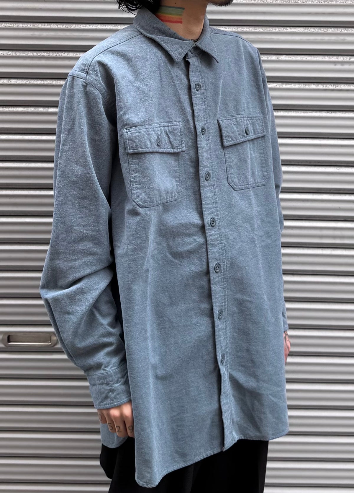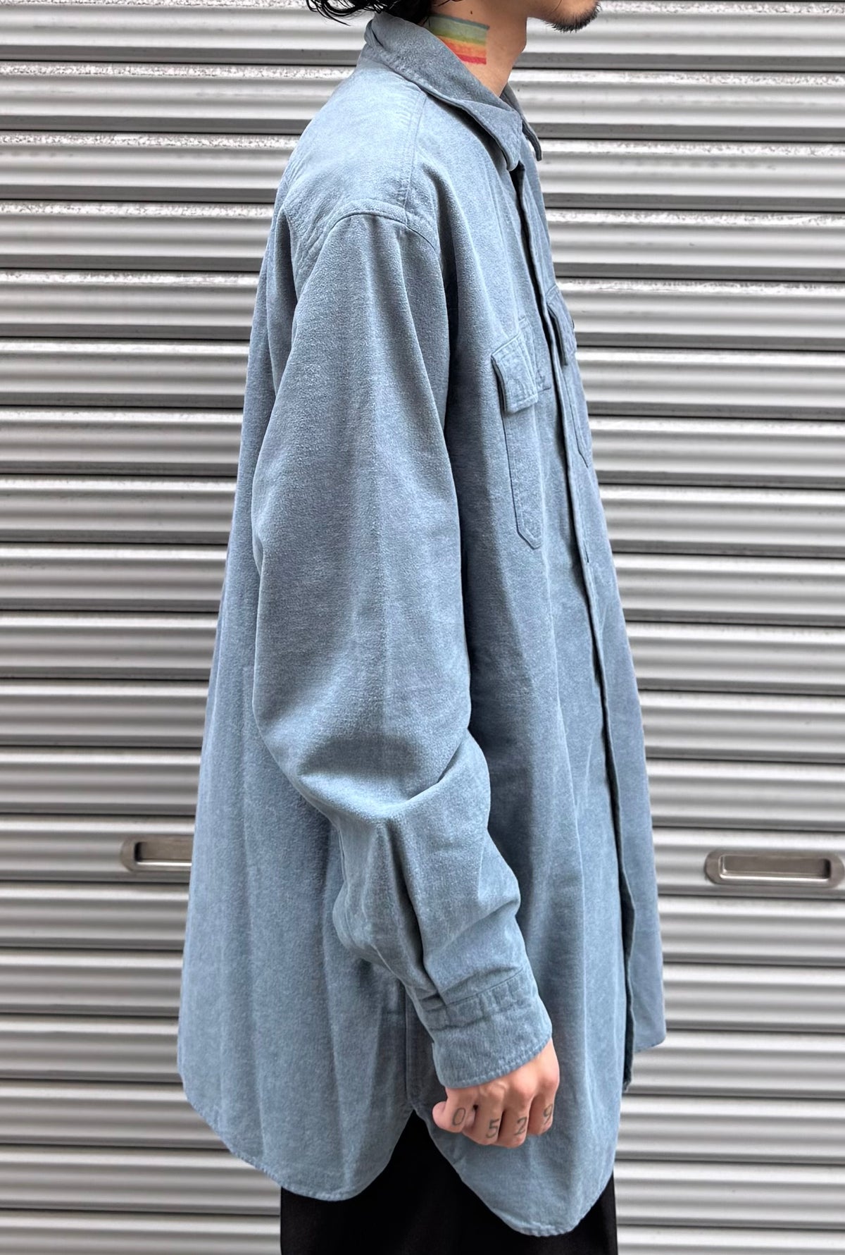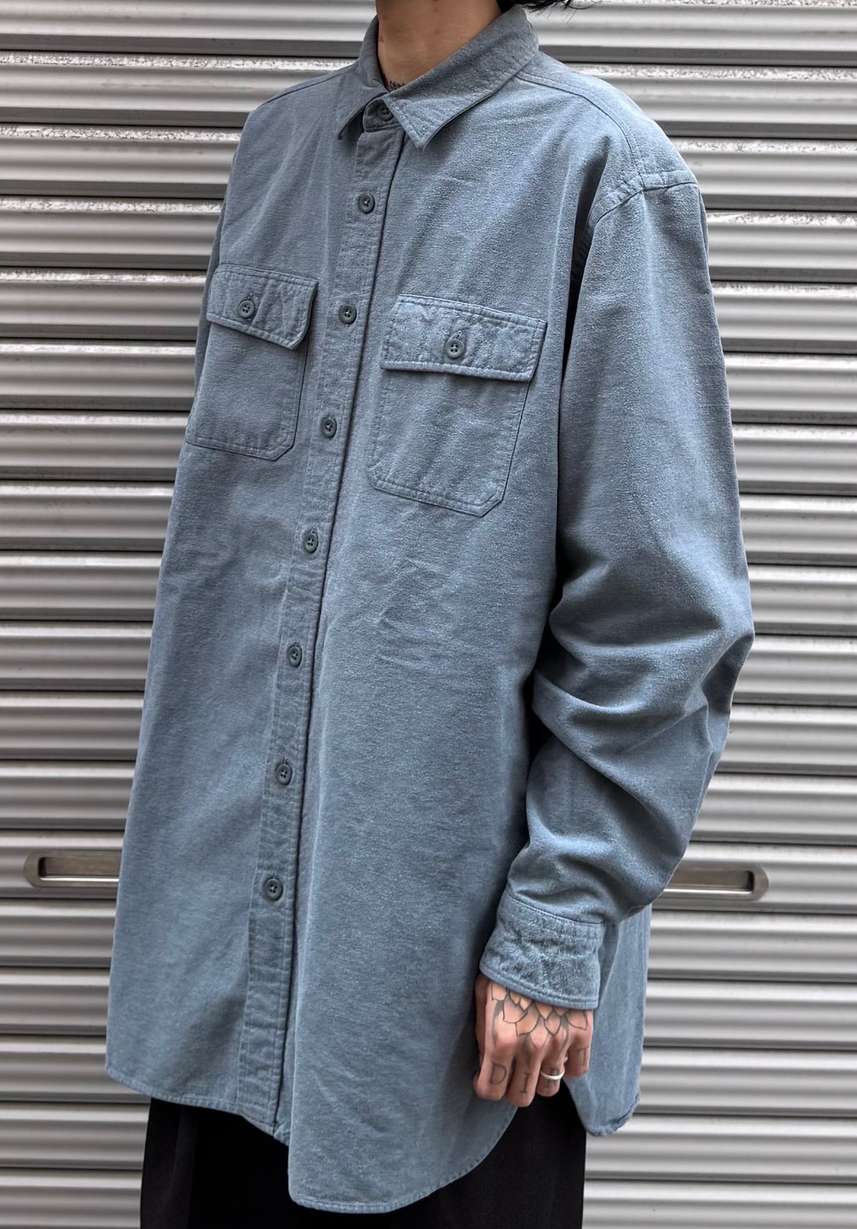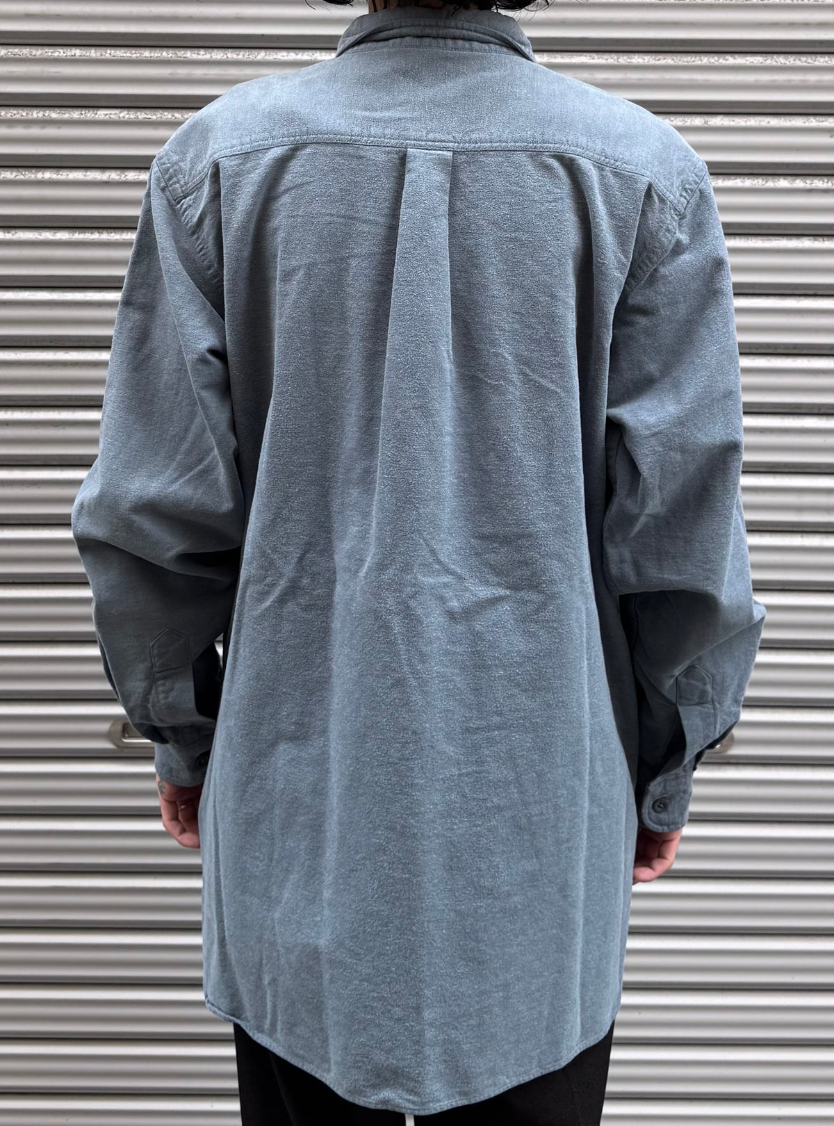 しっかりとしたコットンネル生地に、落ち着いた無地のグレーのようなブルーが映える一枚。