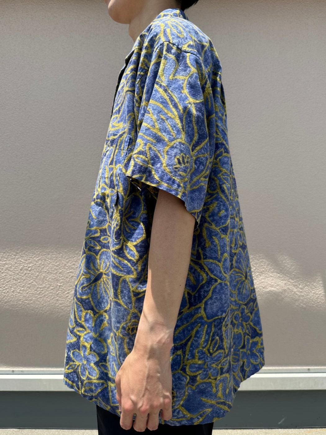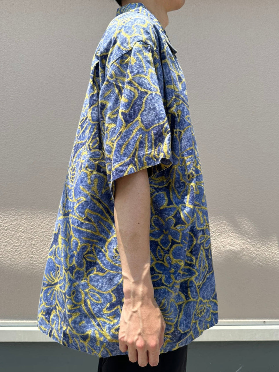 ブルー×イエローの大胆なフラワーパターンが特徴で、インクを擦ったような独特の風合いが特徴です。
