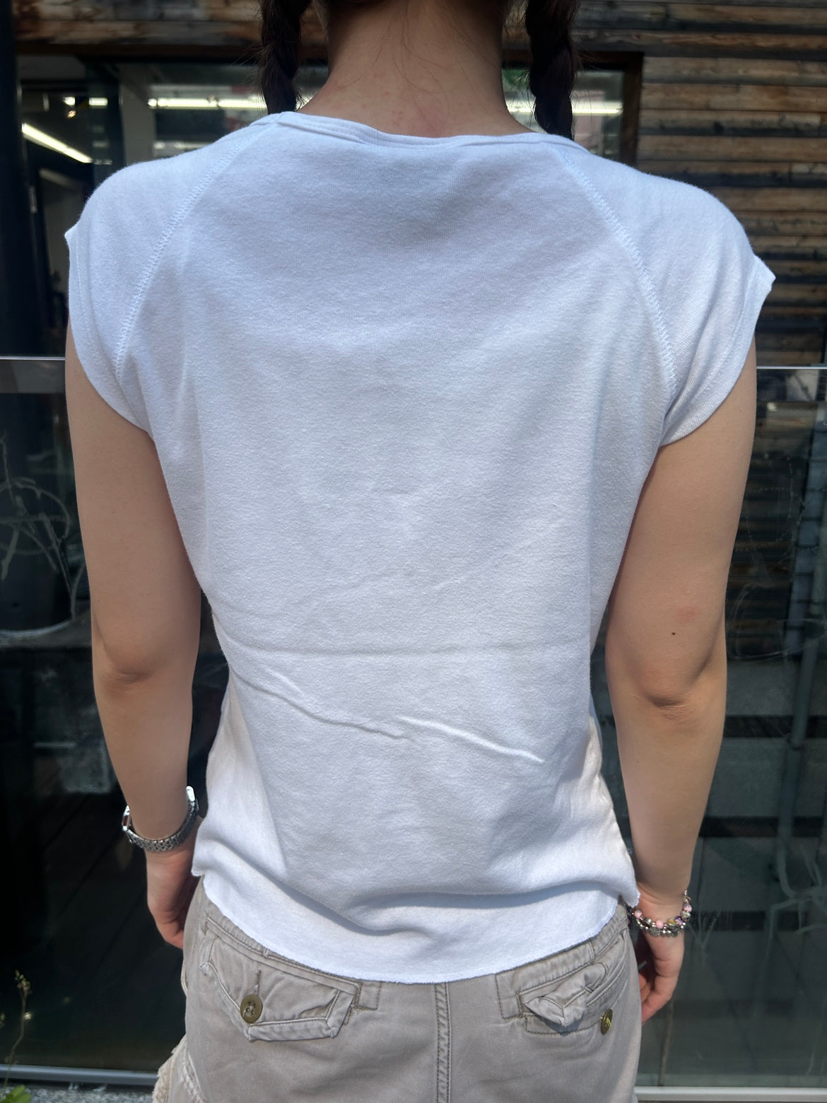 タイトなシルエットにキャップスリーブ、ややラウンドした裾のラインで、1枚でもフェミニンに着こなせるシルエット。