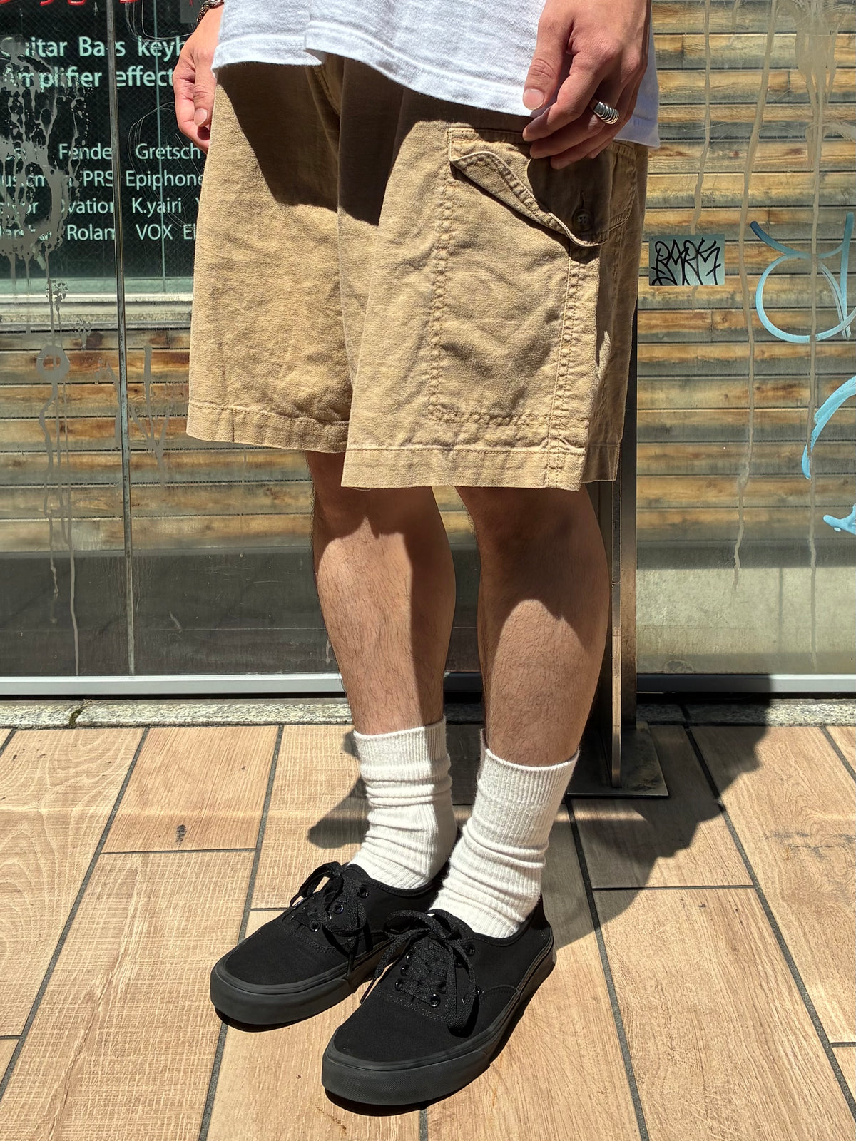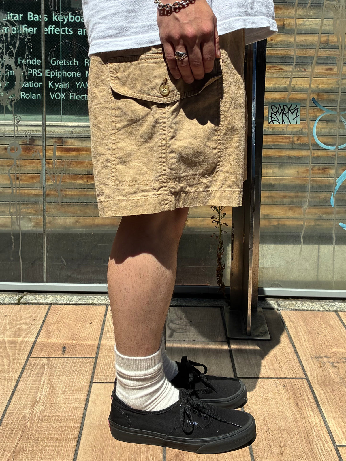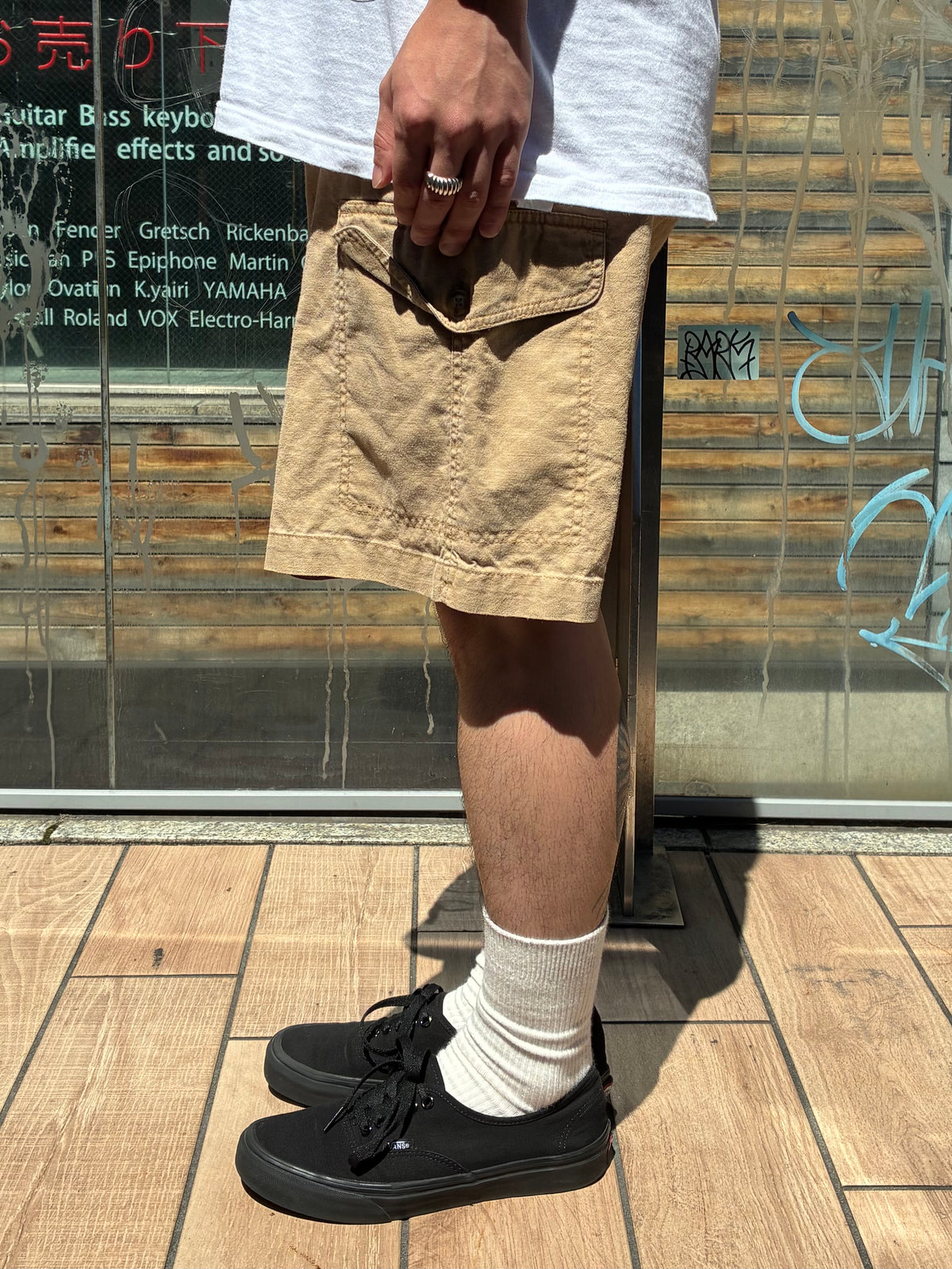 サイドのフラップポケットが程よい無骨さを演出し、Tシャツやタンクトップとの相性も抜群。