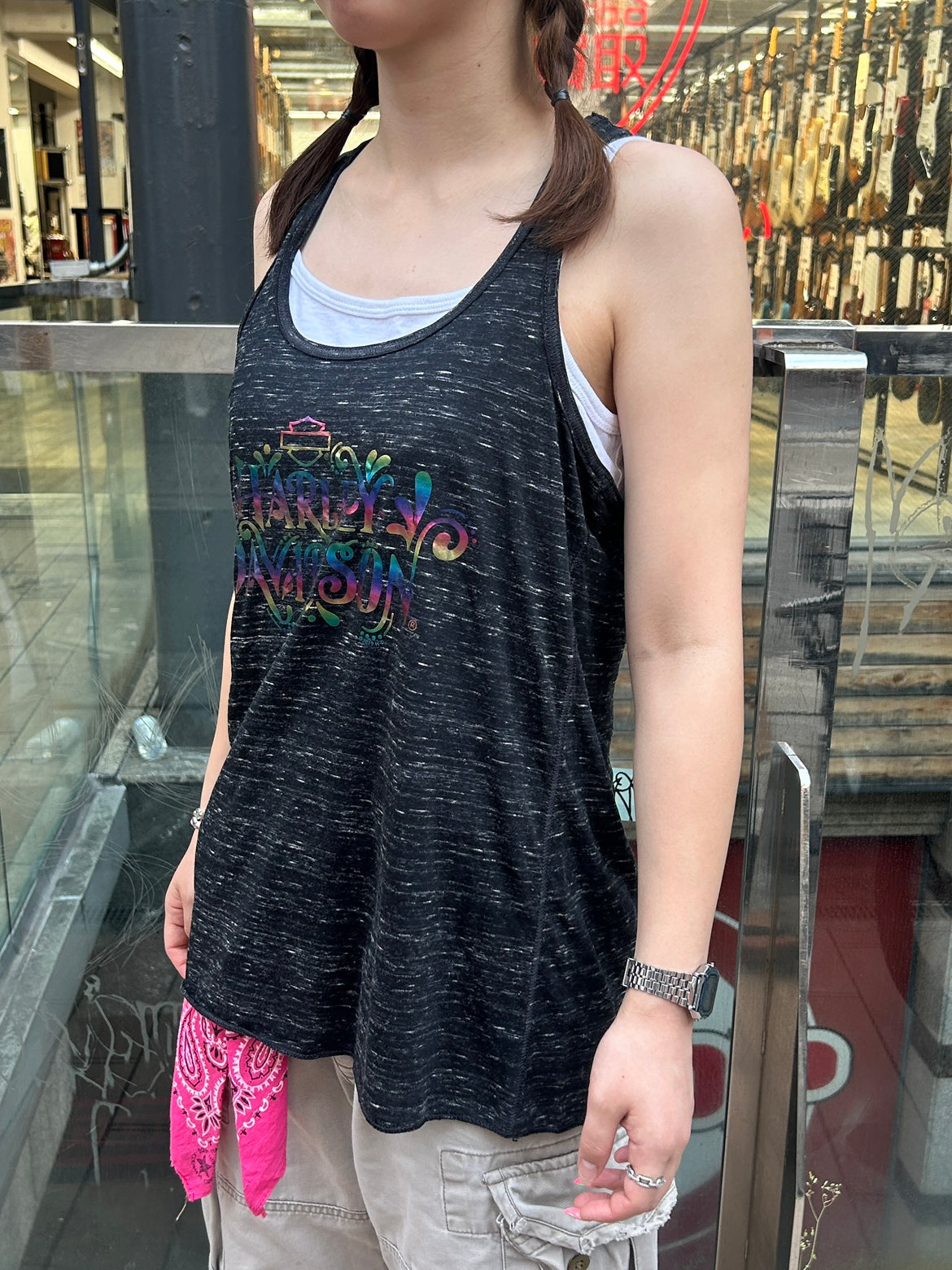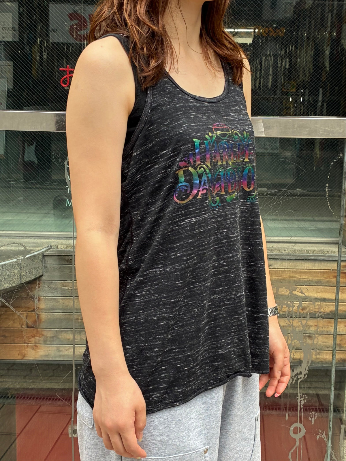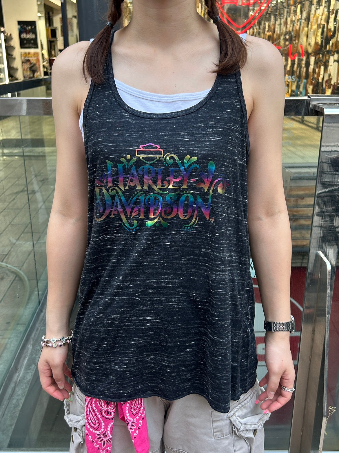 幻想的なホログラフィック調のロゴが印象的な、『Harley Davidson』のノースリーブタンクトップ。