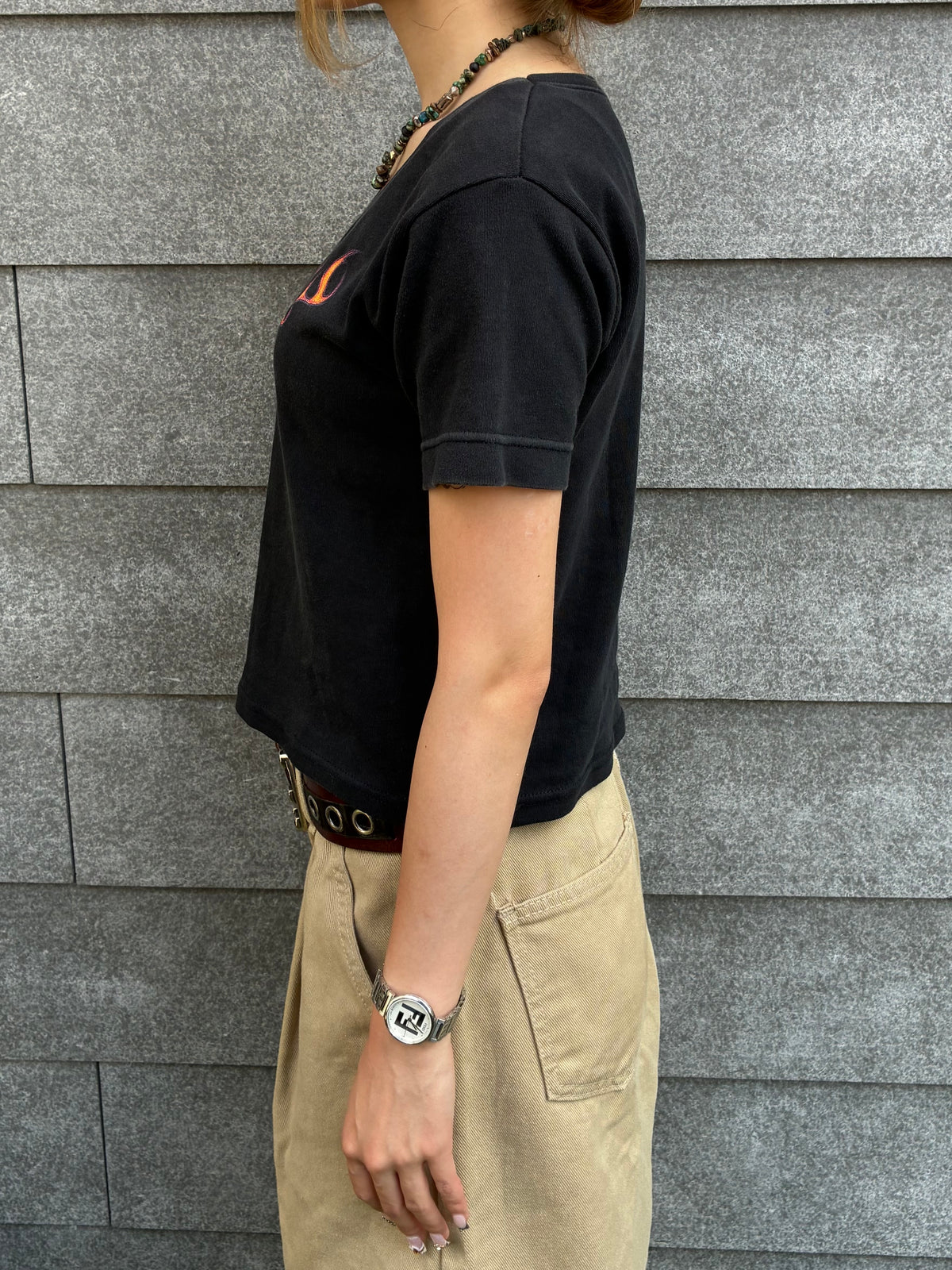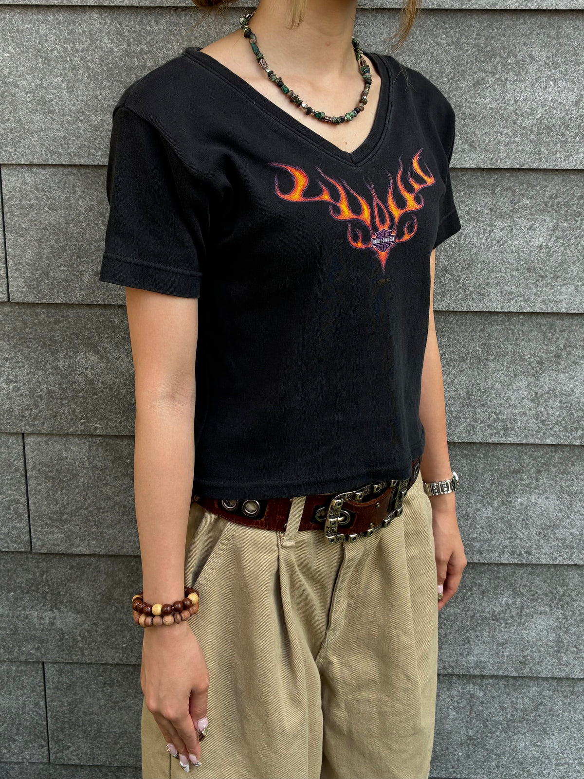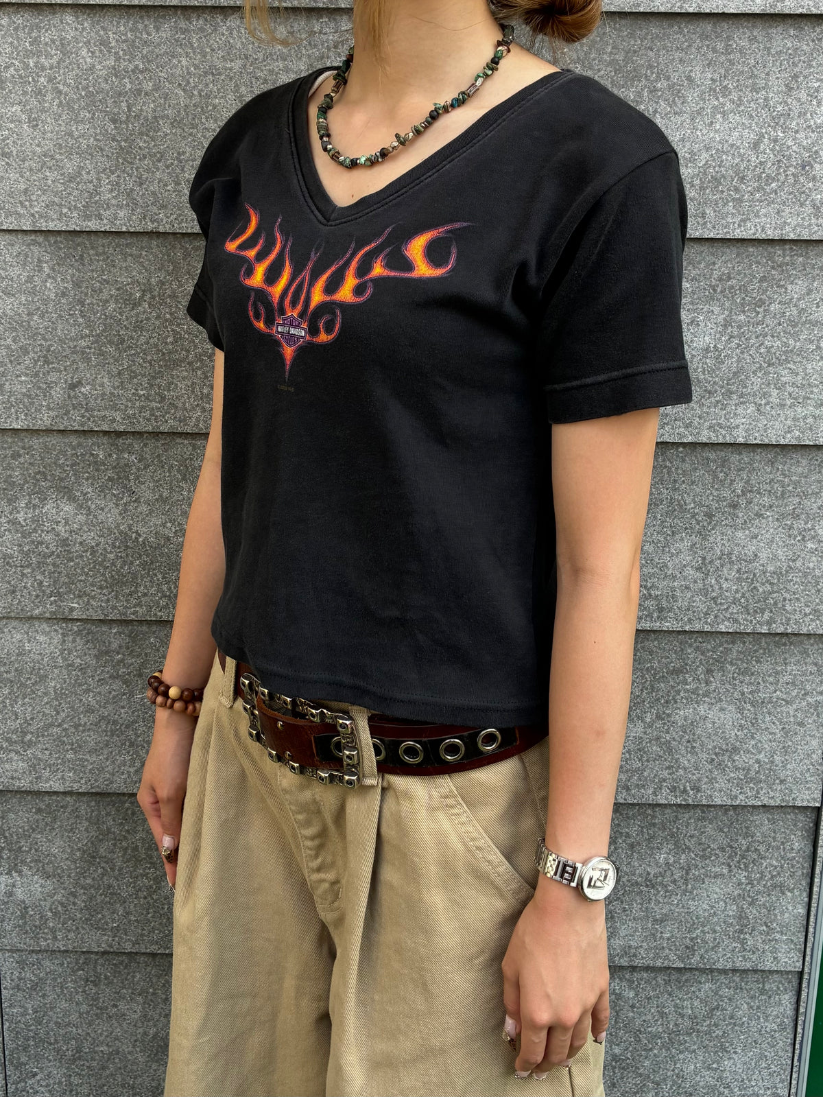 ショート丈&ややVネック型のリブ入りボディは当時の流行であり、プリントのファイアーパターンも2000年代特有の紫を使用した少し色気とクルーさを併せ持つ柄となっている。
