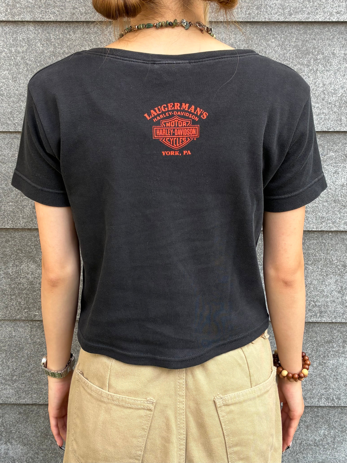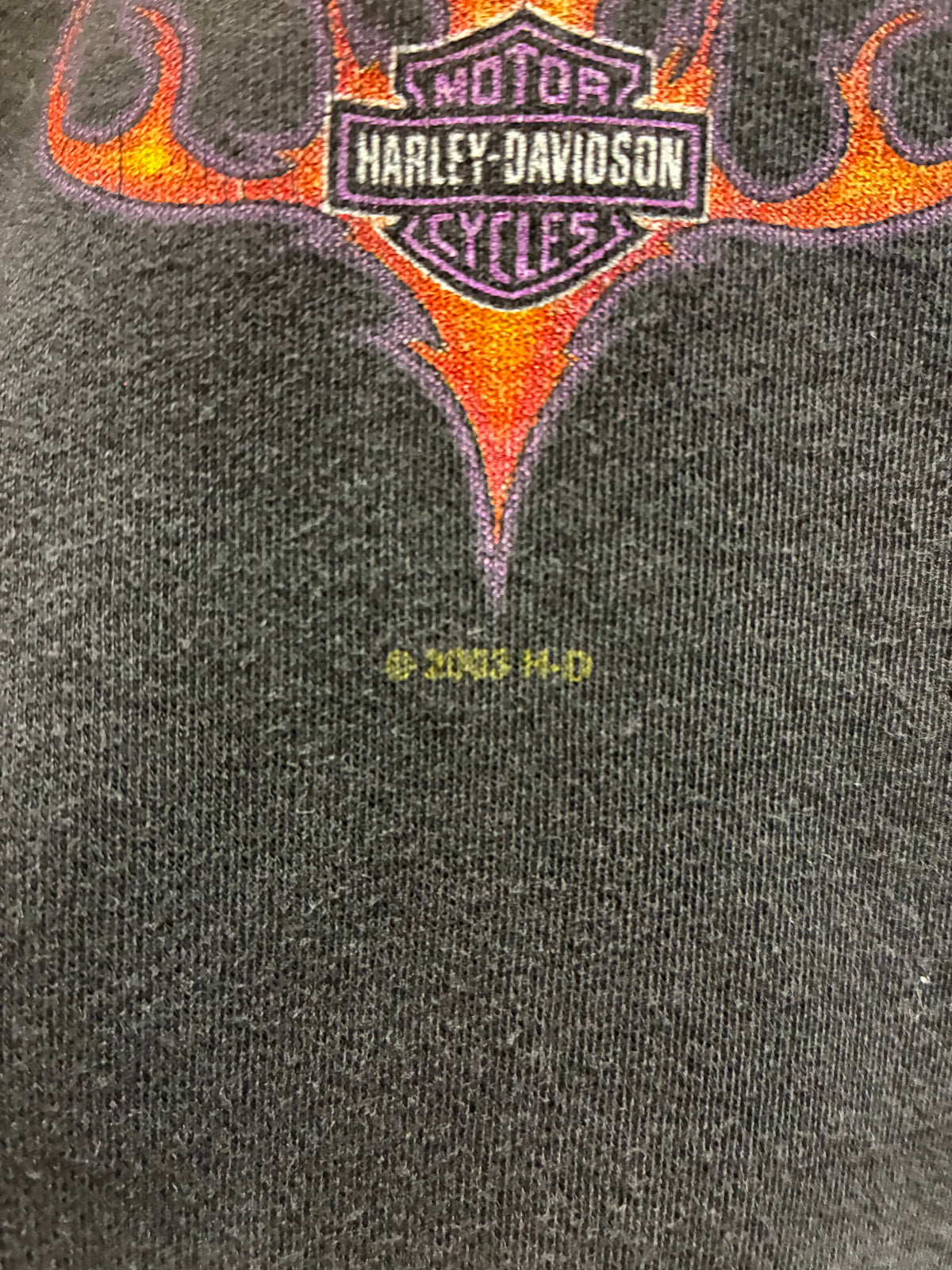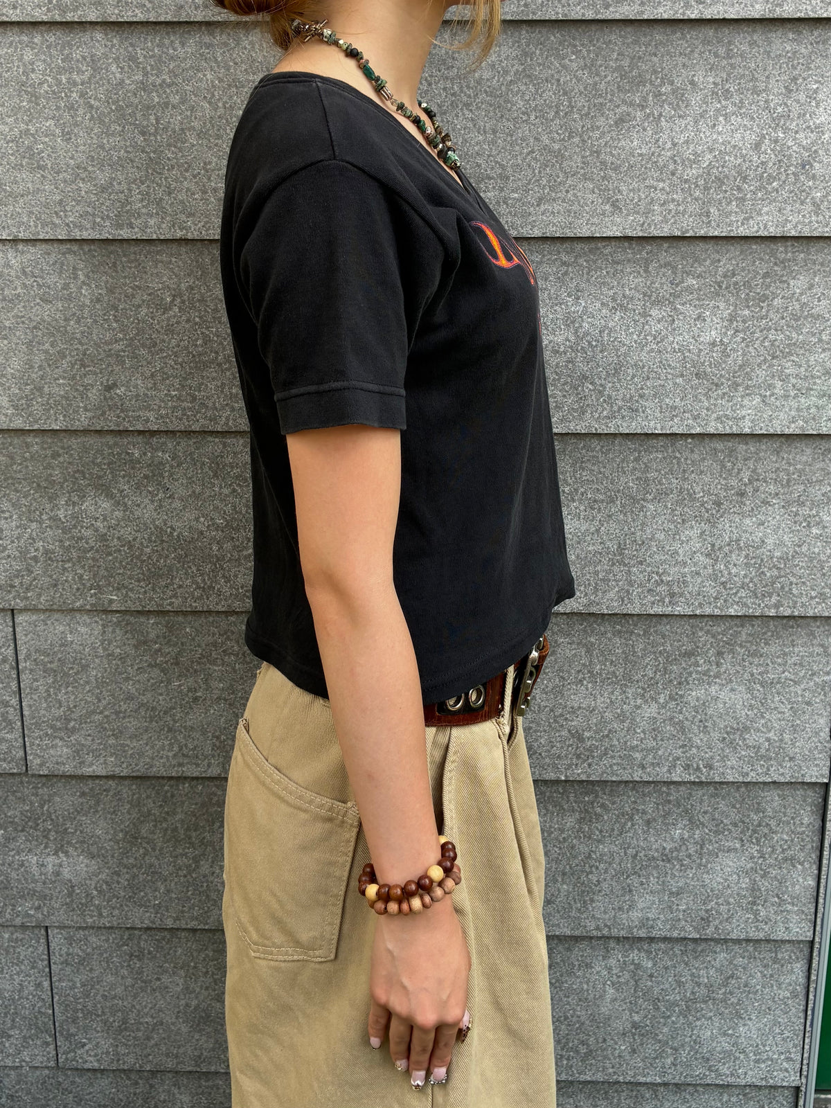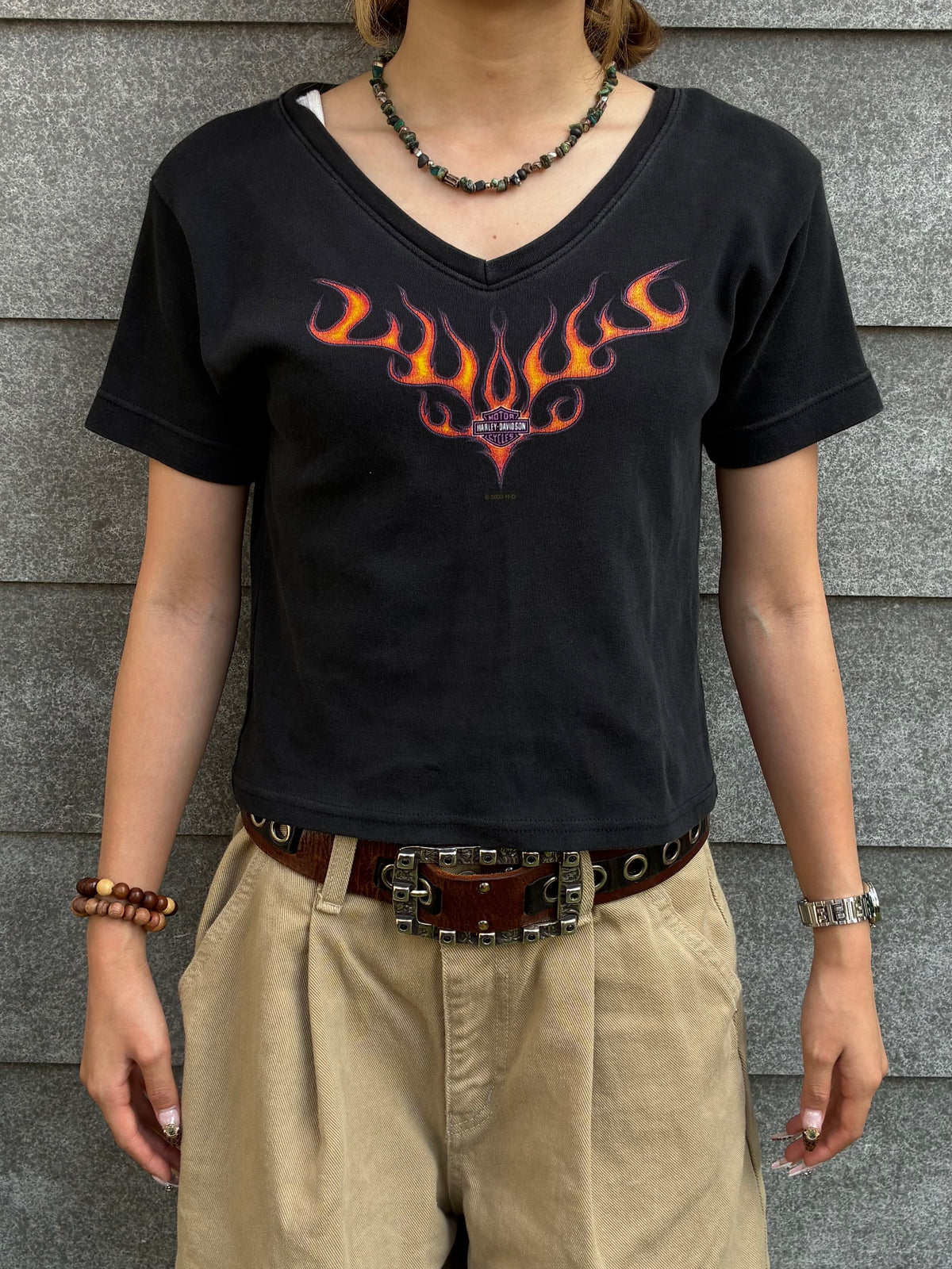 ショート丈&ややVネック型のリブ入りボディは当時の流行であり、プリントのファイアーパターンも2000年代特有の紫を使用した少し色気とクルーさを併せ持つ柄となっている。
