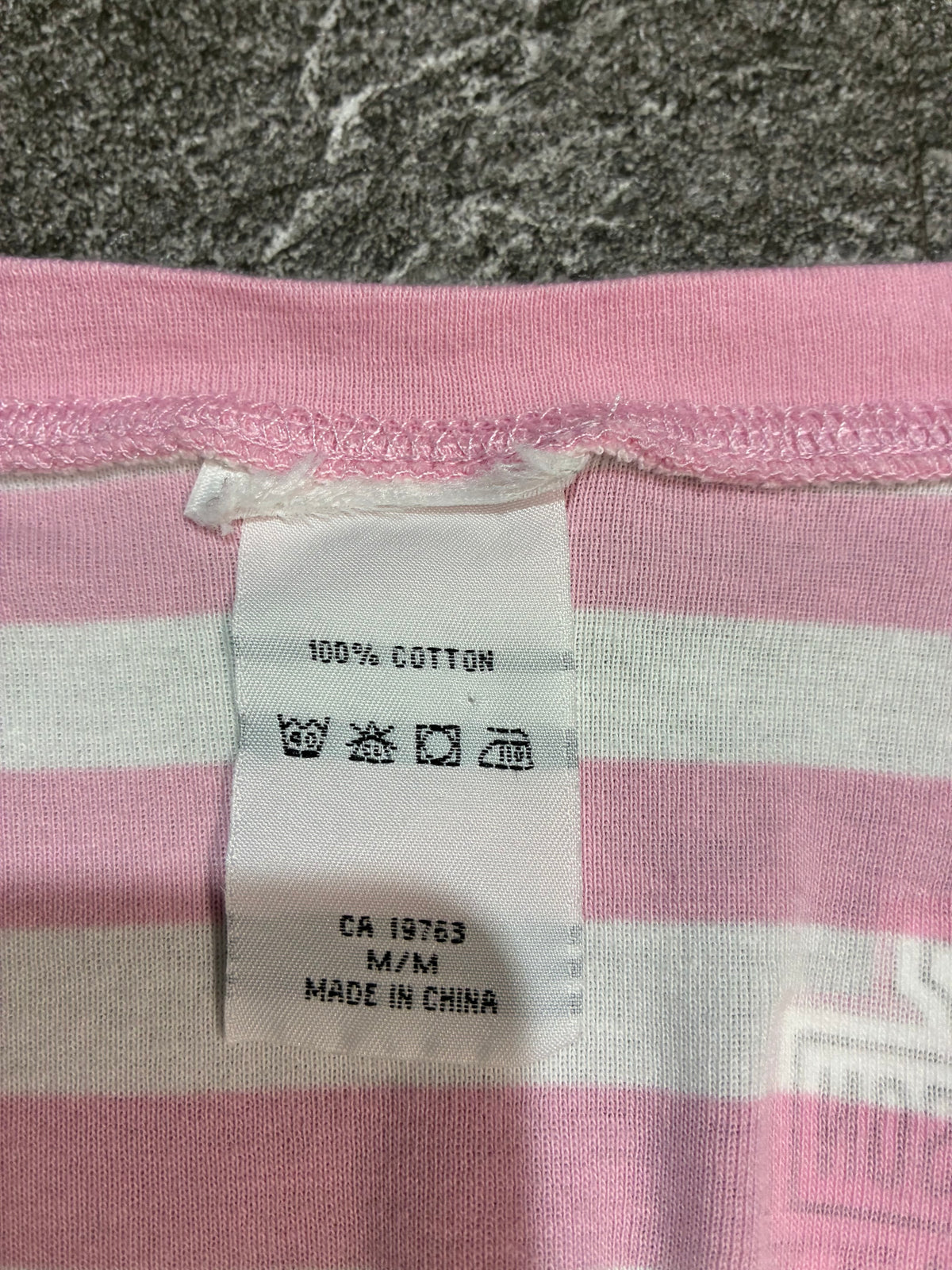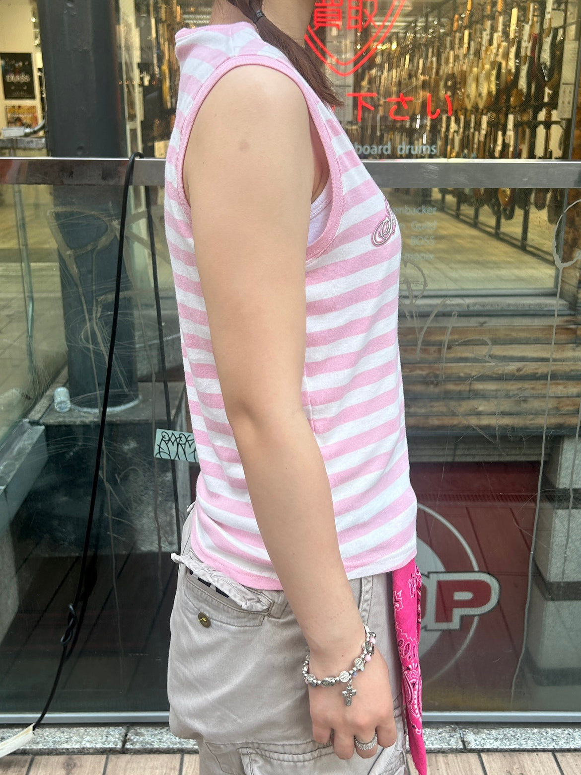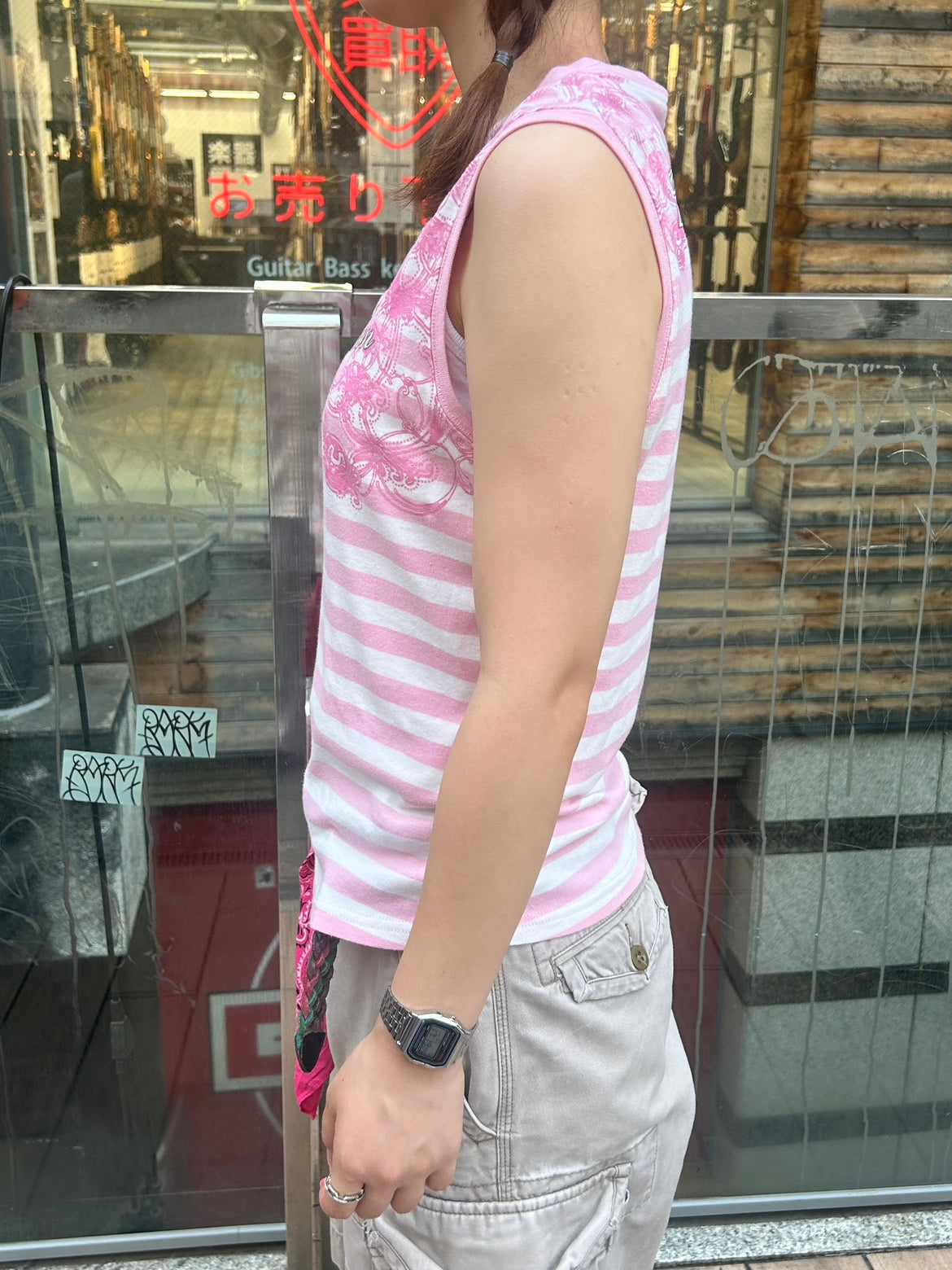 Y2K〜2000年代後半らしい、甘めのピンクとボーダー柄に、ロゴ&オーナメント柄のグラフィックが華やかな一枚。
