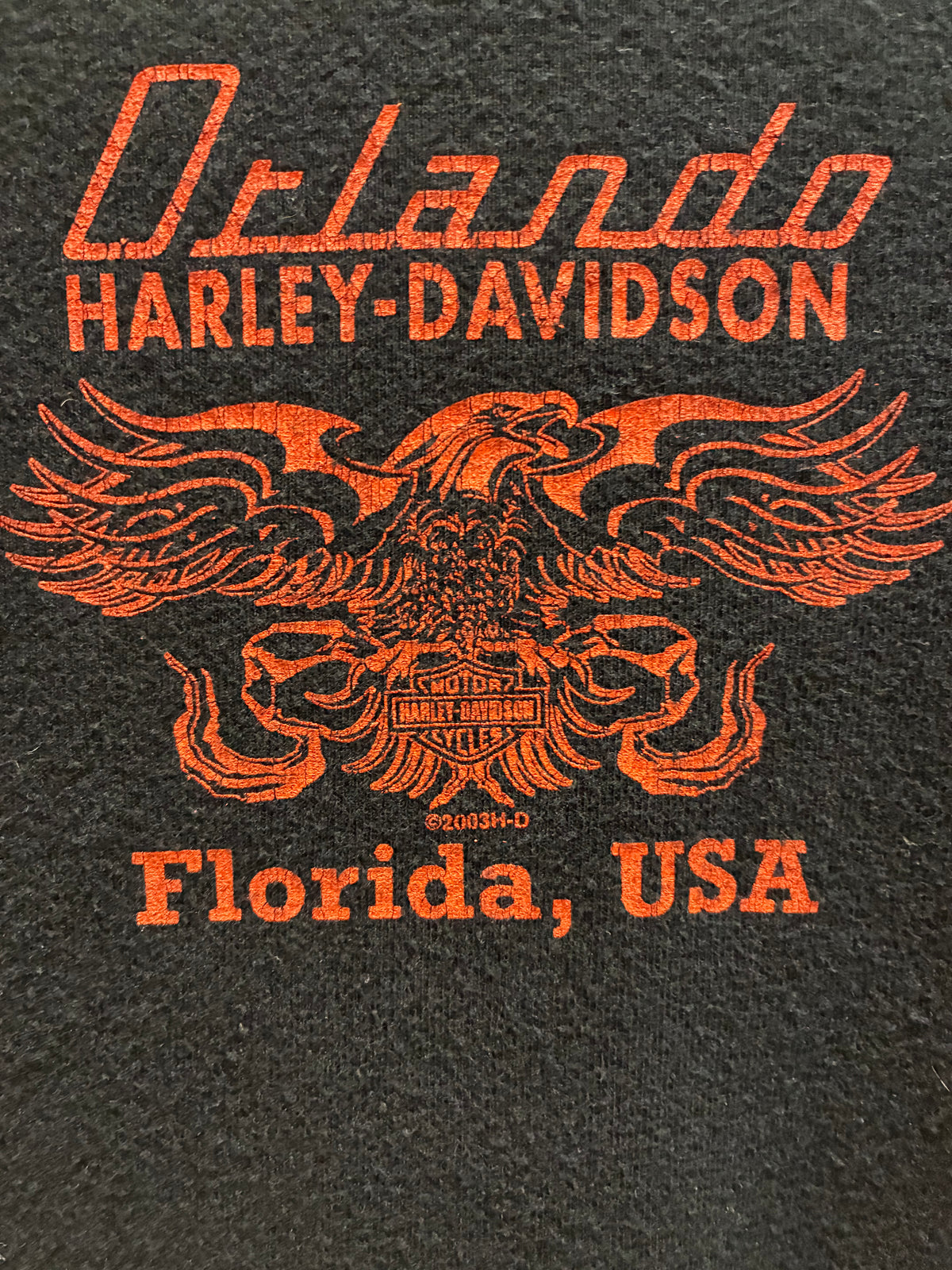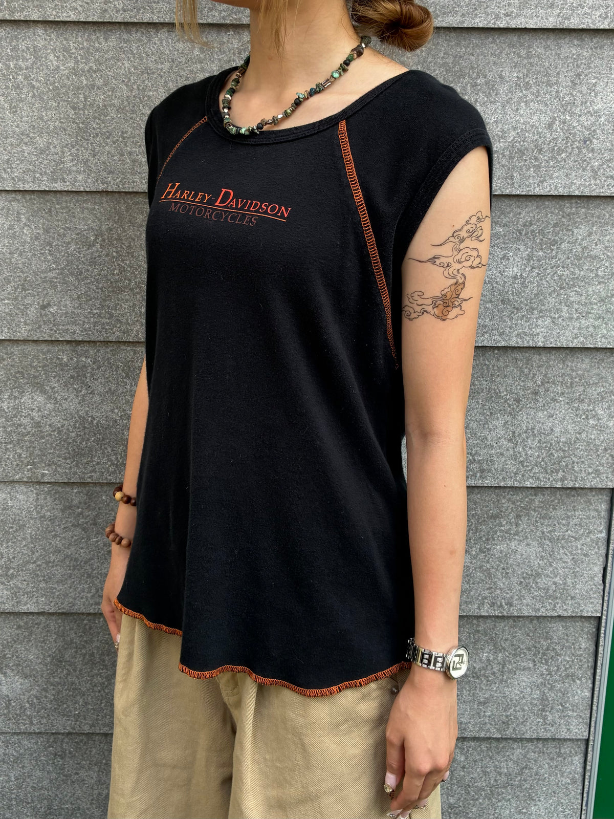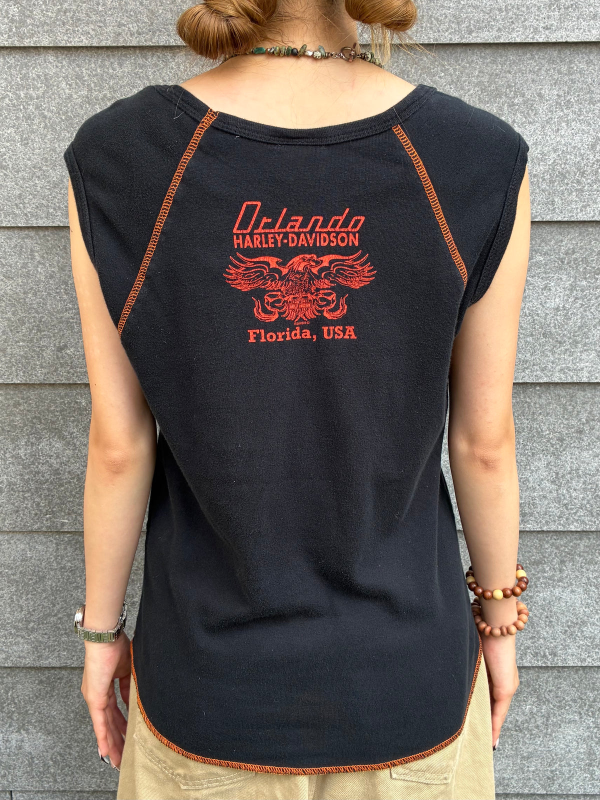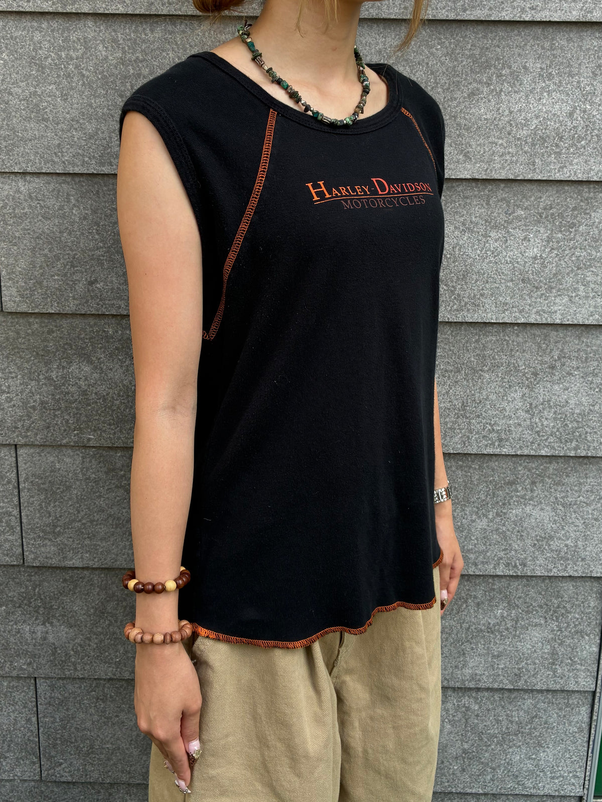 HOLOUBEK(ホロウベック)社製、Orlando(オーランド)のショップ限定のタンクトップ。ストレッチ素材ではなく、しっかりした100%コットンボディに黒ボディ × オレンジの配色ステッチの入ったHarleyらしいバイカーテイスト。