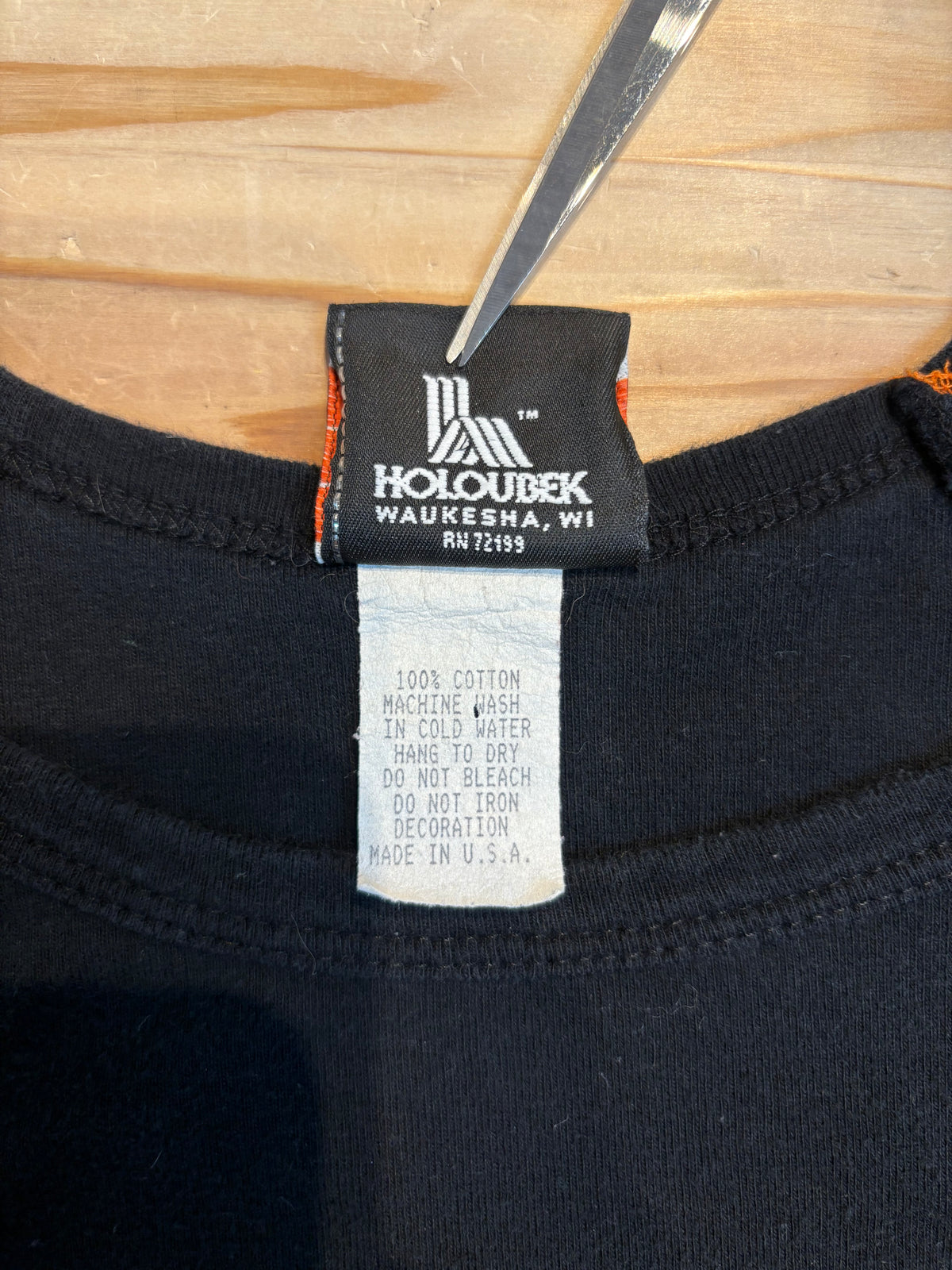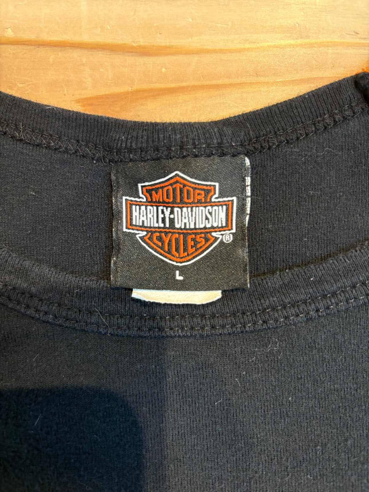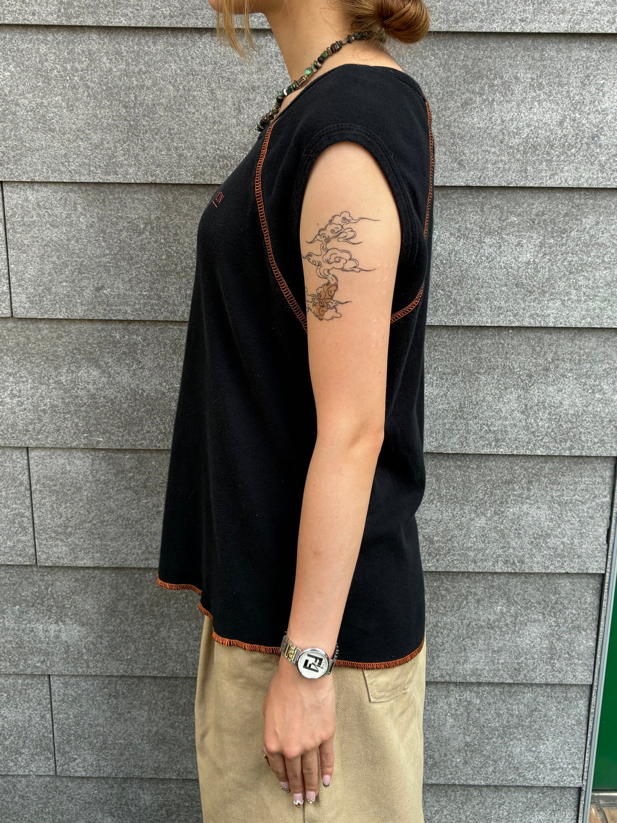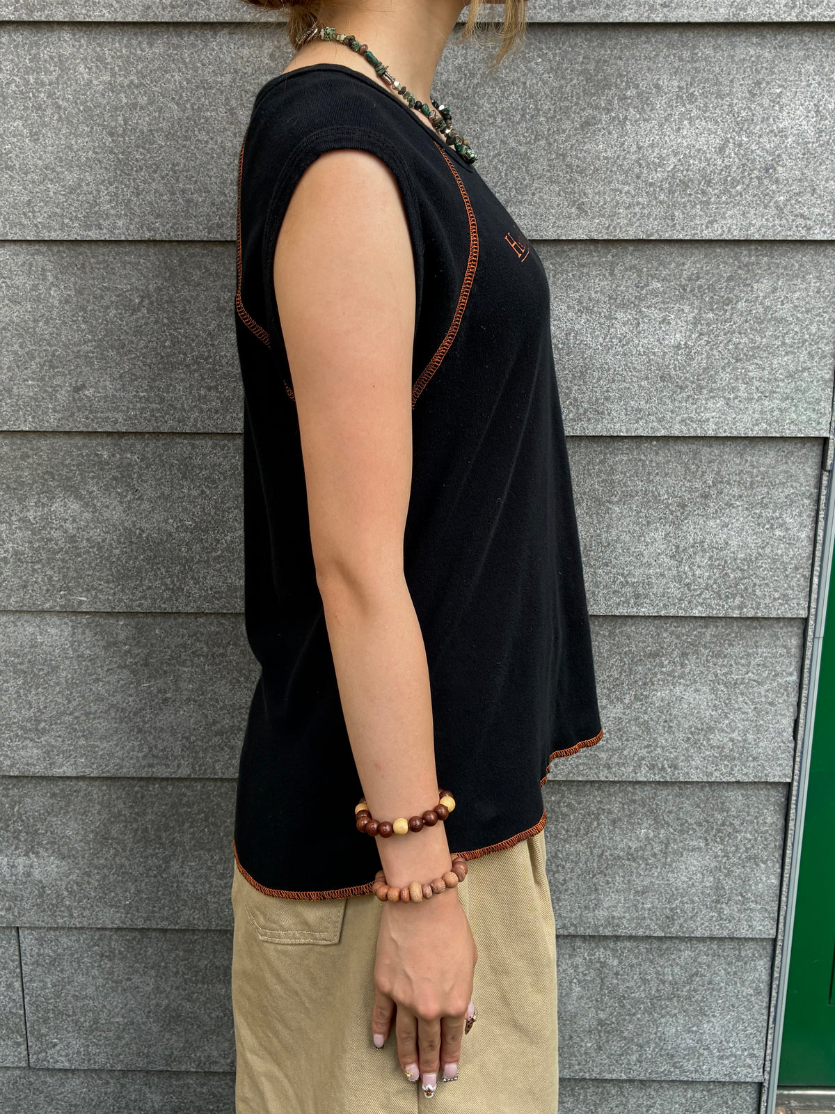HOLOUBEK(ホロウベック)社製、Orlando(オーランド)のショップ限定のタンクトップ。ストレッチ素材ではなく、しっかりした100%コットンボディに黒ボディ × オレンジの配色ステッチの入ったHarleyらしいバイカーテイスト。
