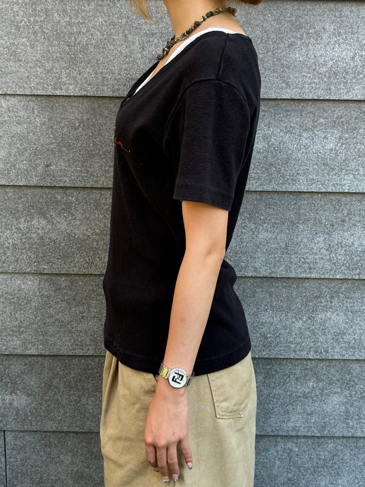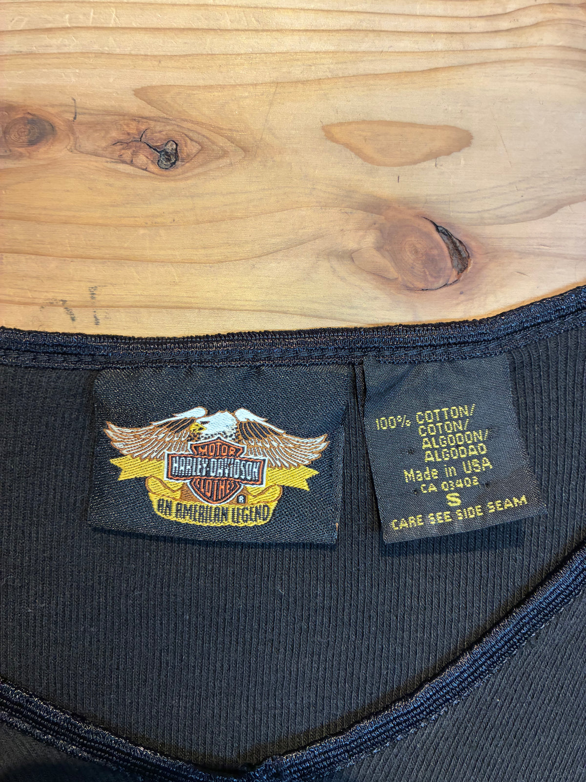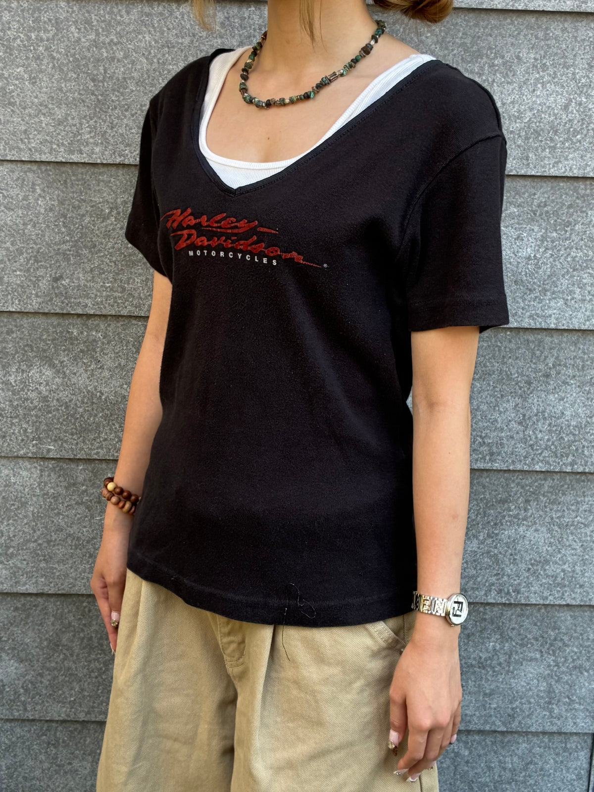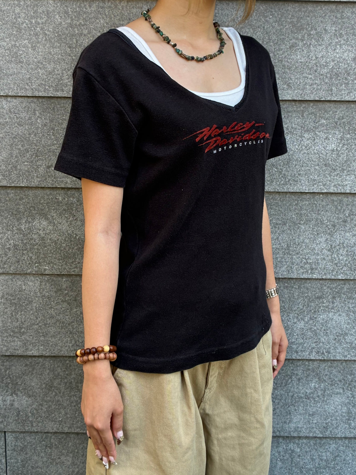 ヴィンテージ感たっぷりのブラックボディに、筆記体ロゴが映えるHarley-Davidson VネックTシャツ。