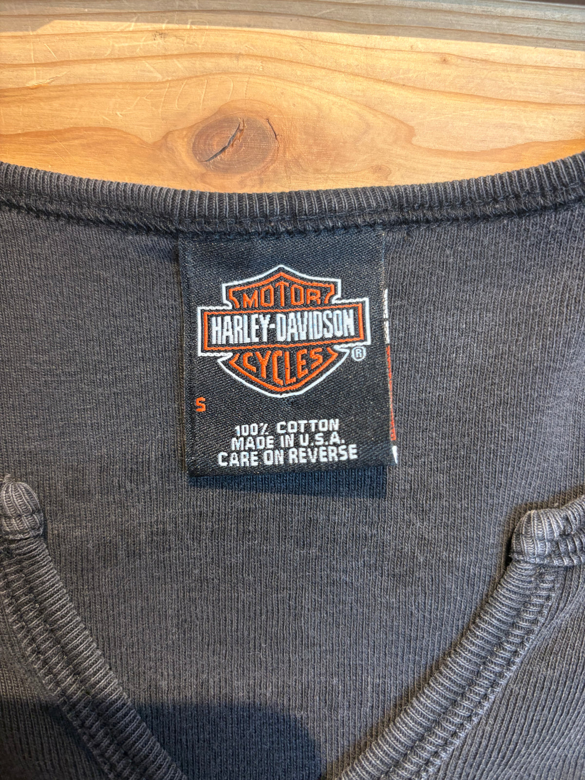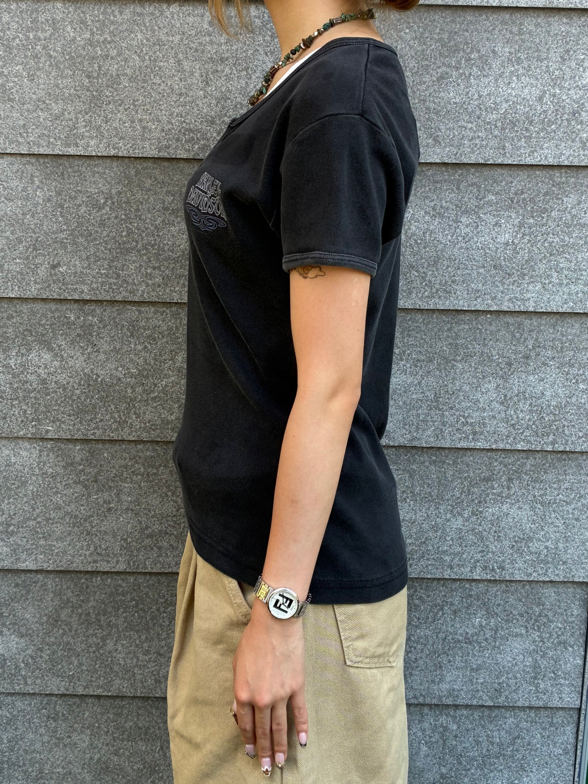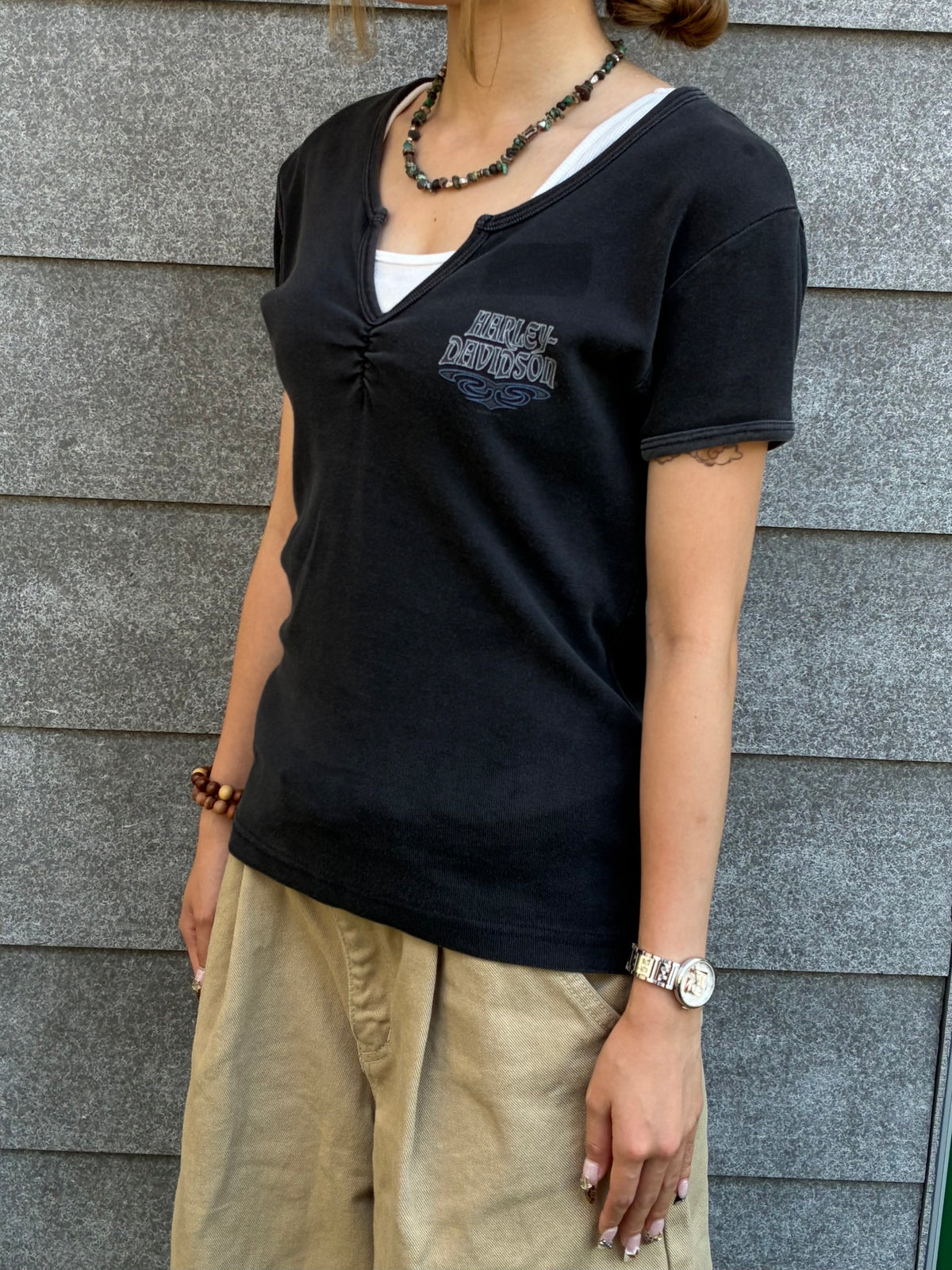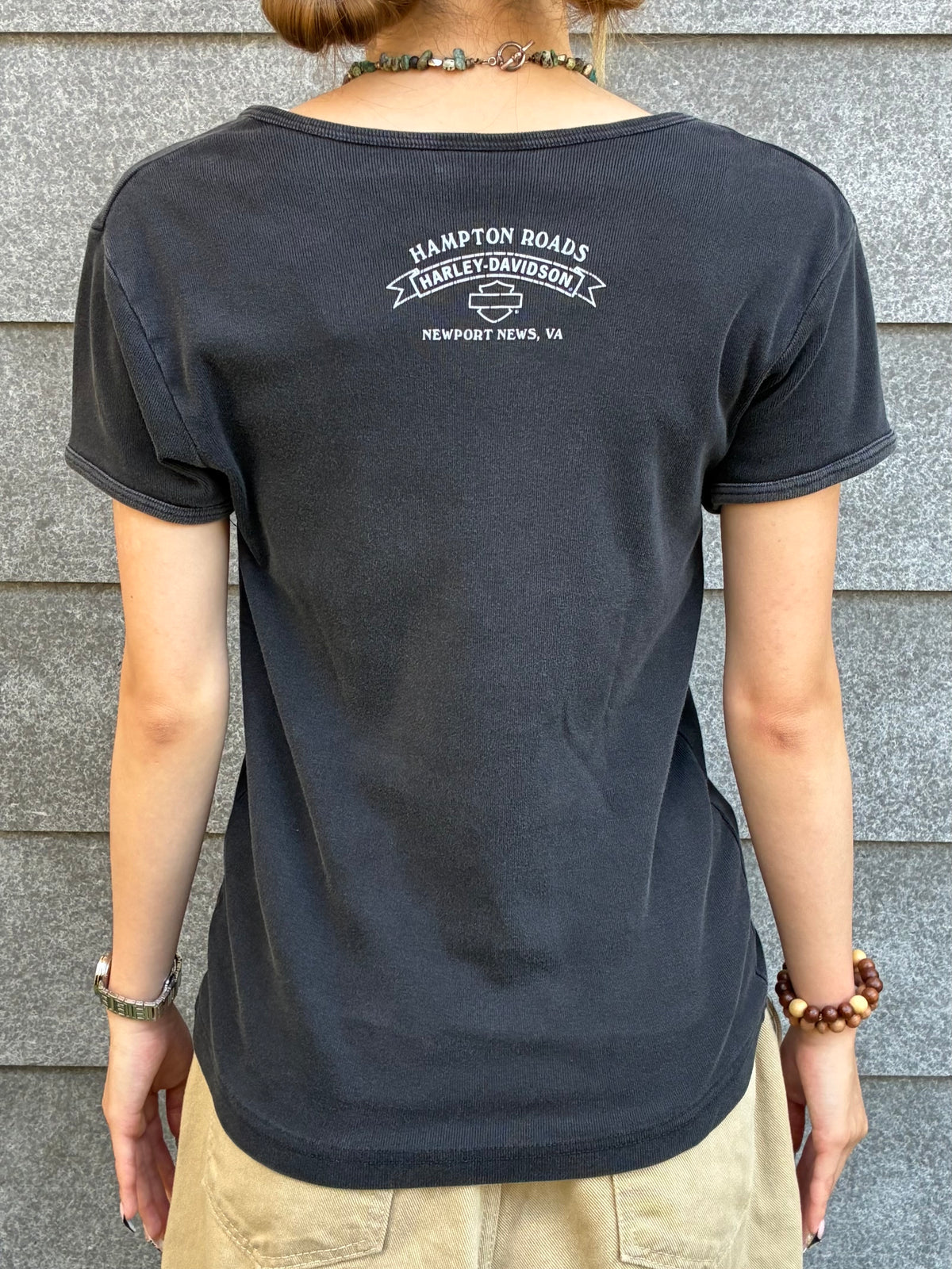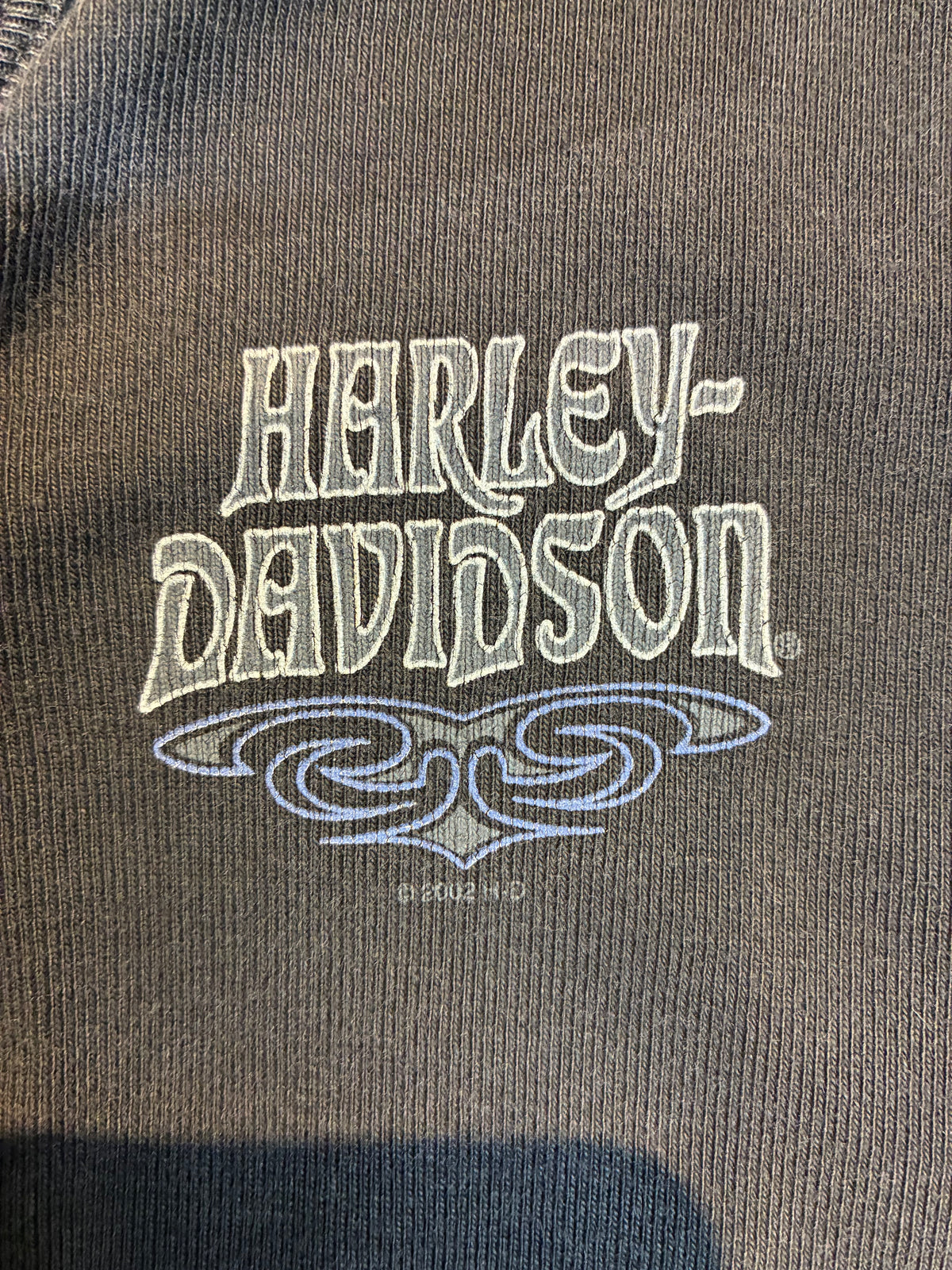 2002年コピーライト入り、Harley-Davidsonのトライバルロゴが目を引くレディースVネックTシャツ。