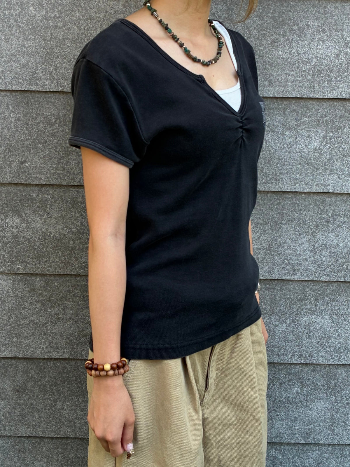 中央にはギャザー入りのVネックカットで、さりげなく女性らしさを引き立ててくれます。