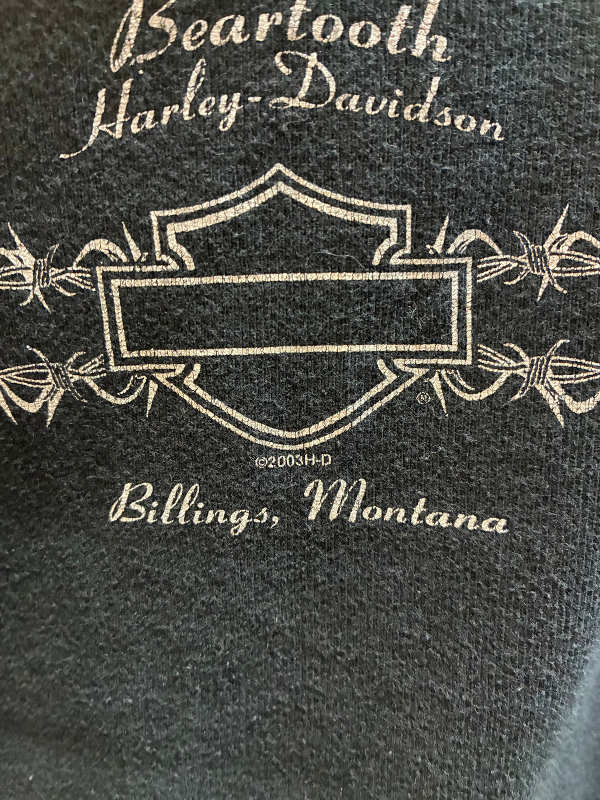 フロントには3スターの「PROPERTY OF」ロゴ、バックには「Beartooth Harley-Davidson」(モンタナ州ビリングス)のプリントが入った両面デザイン。