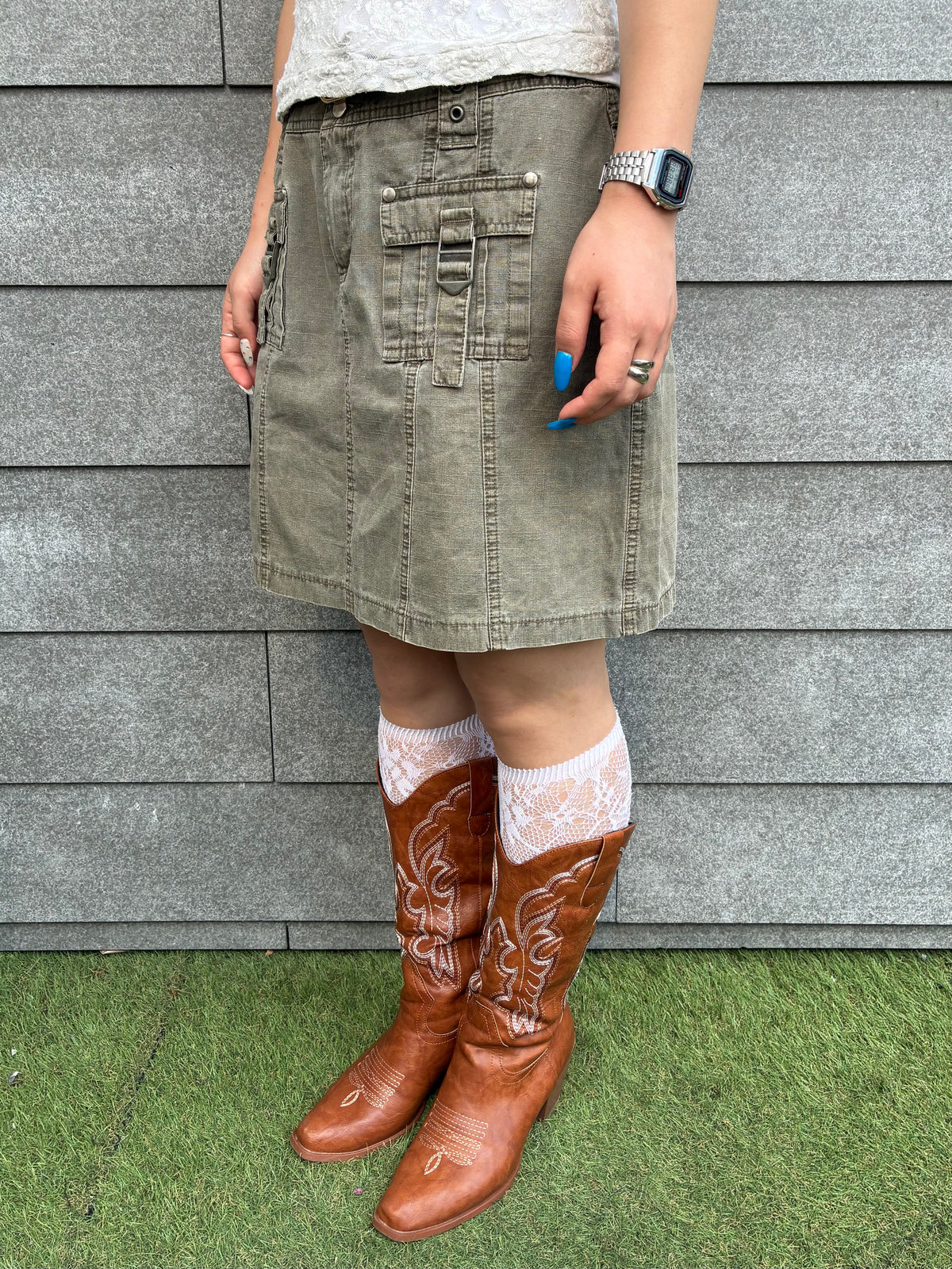 フロントのカーゴポケットとDカン付きベルトデザインが特徴的な、皮がスカート。