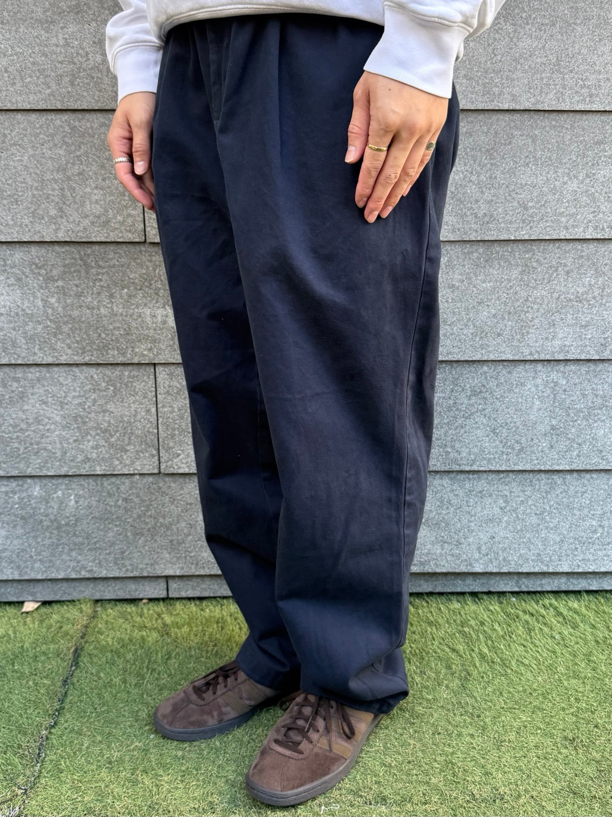 ネイビーカラーの上品なツイルコットン生地を使用し、自然な光沢としなやかな風合いが特徴。