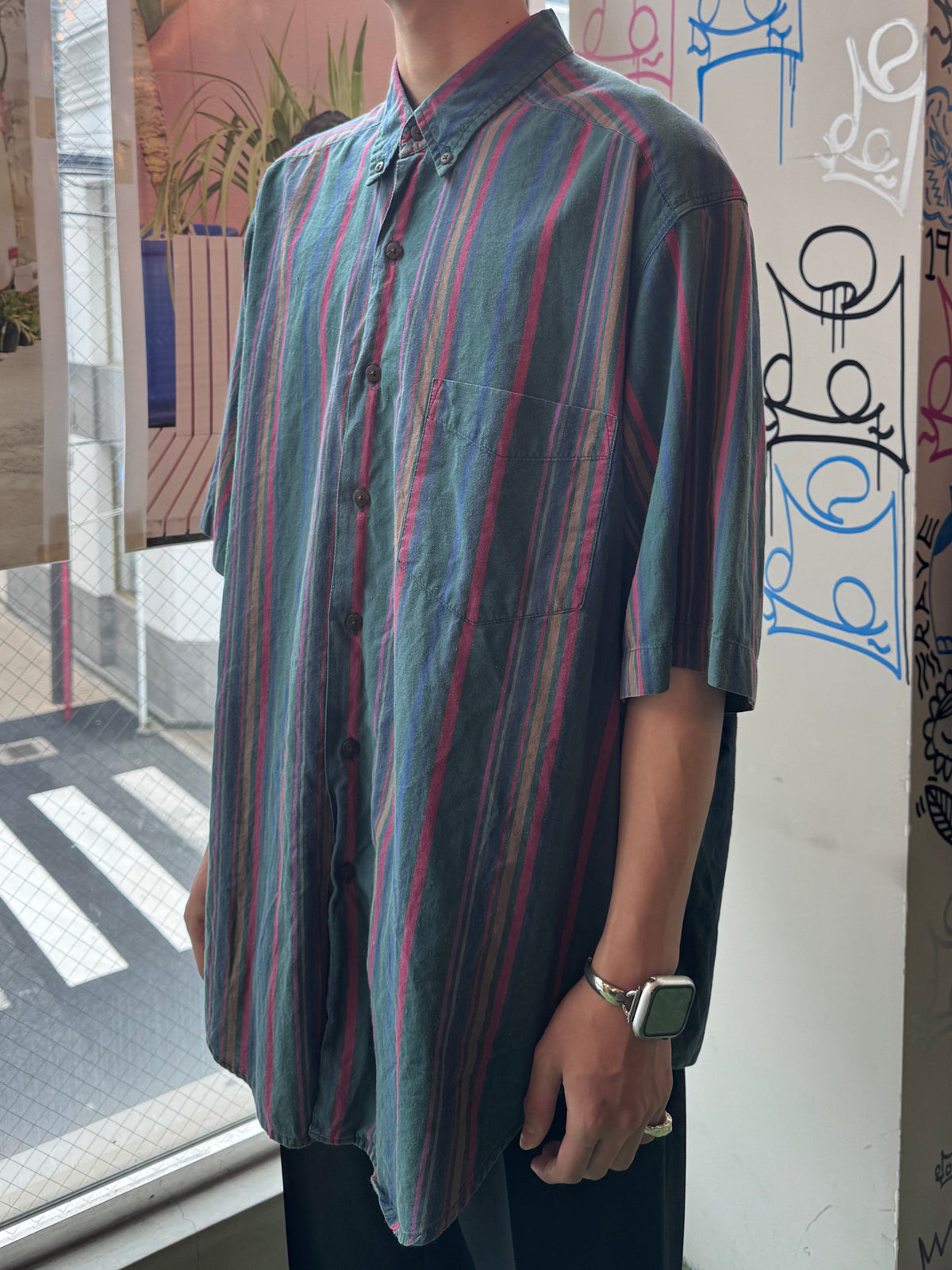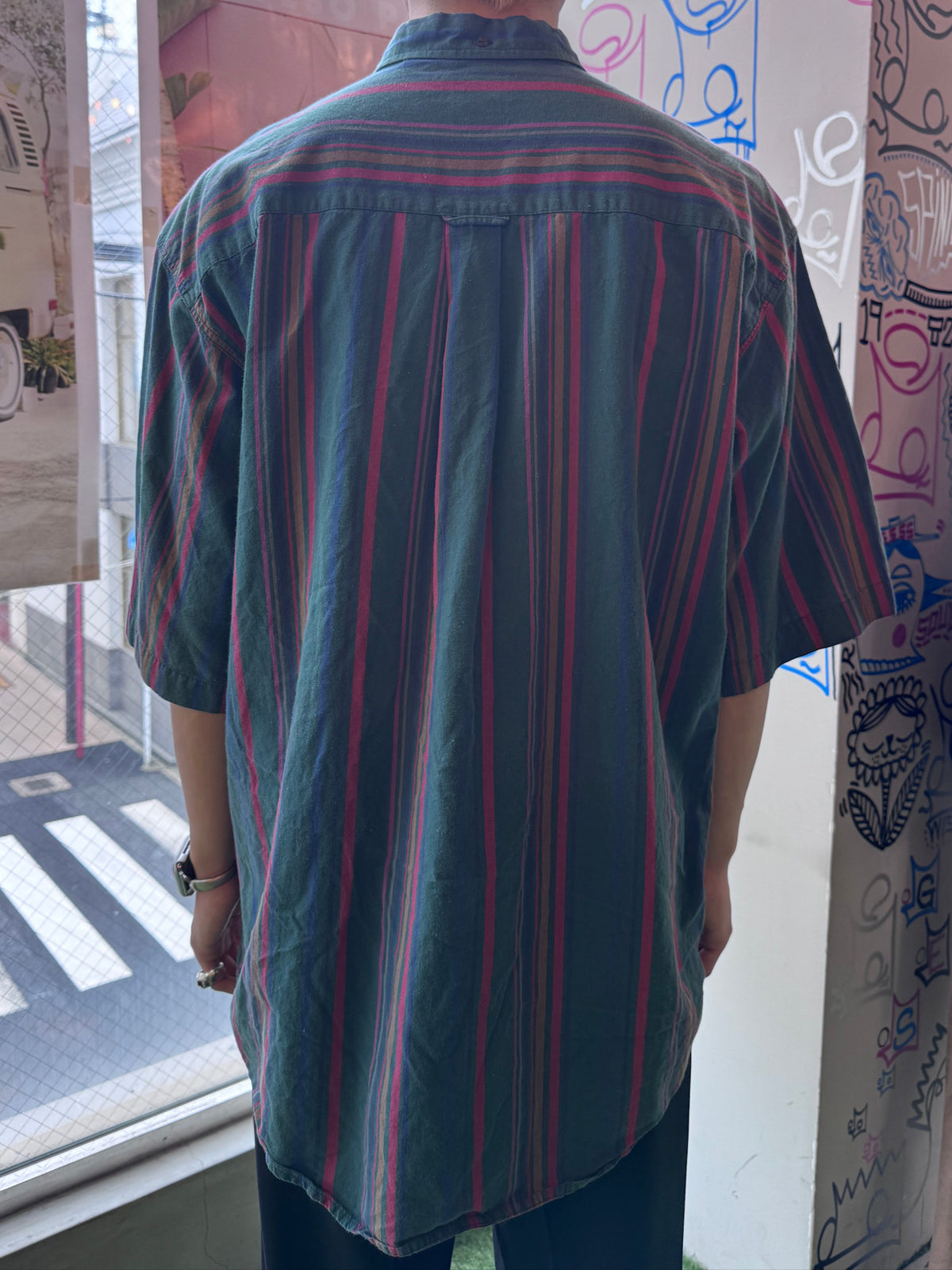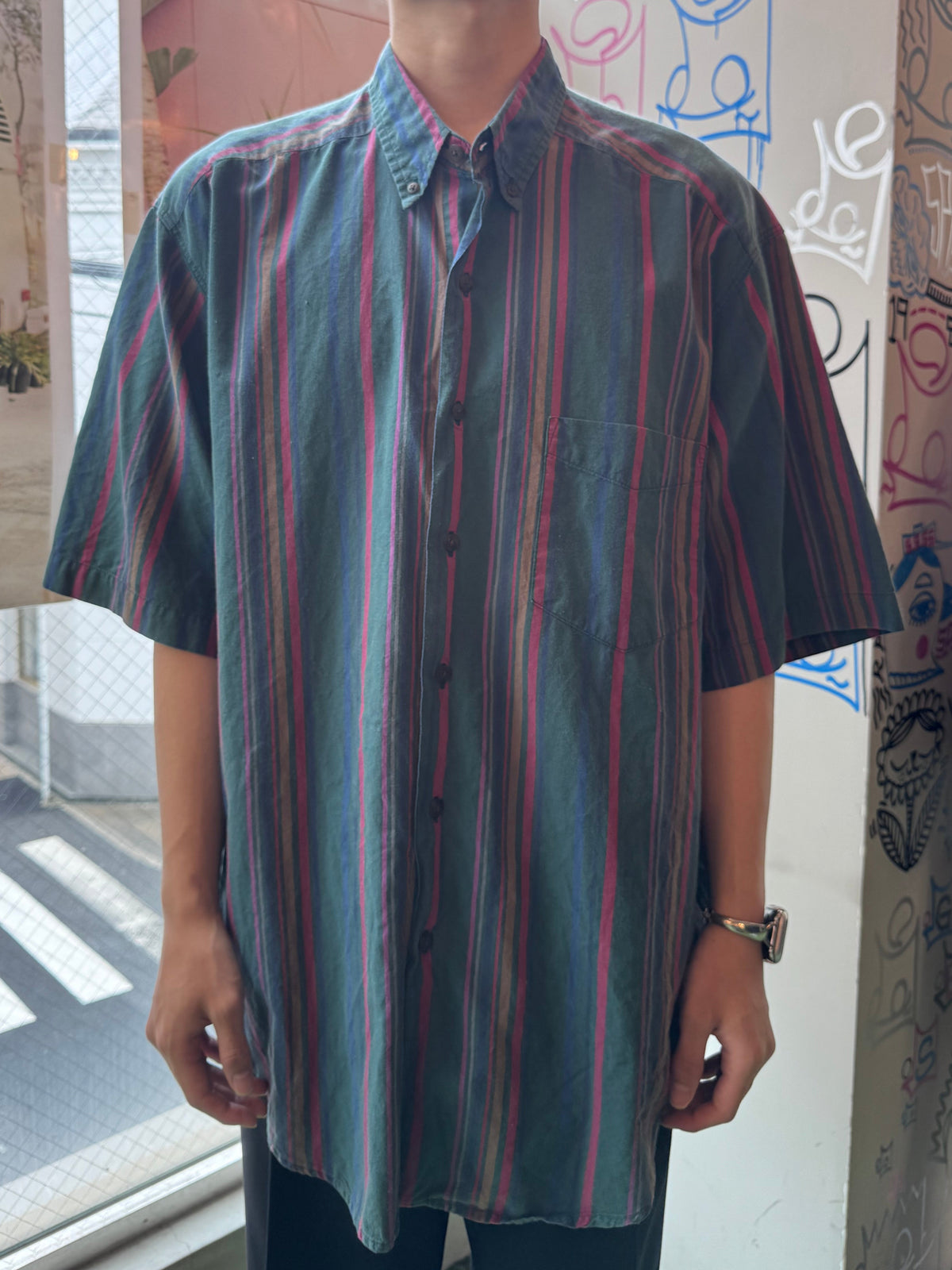 深めのグリーンをベースに、ピンク、ブルー、パープルなどのマルチストライプが印象的な一枚。