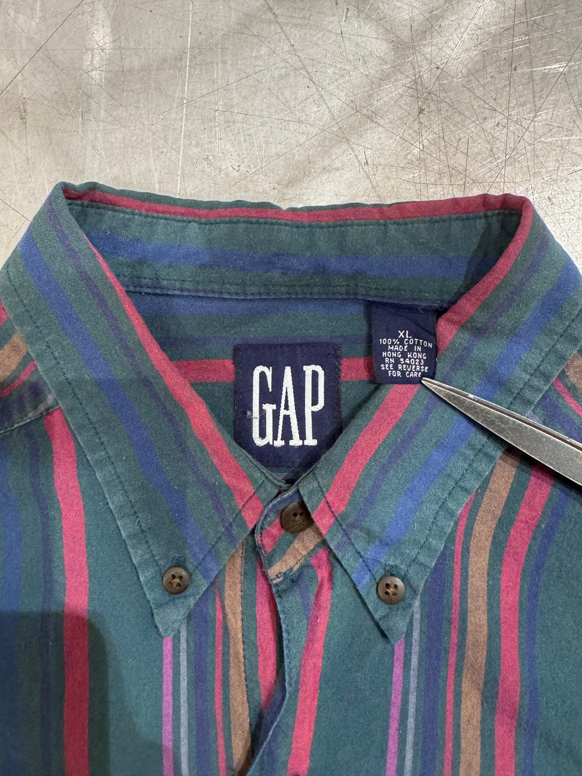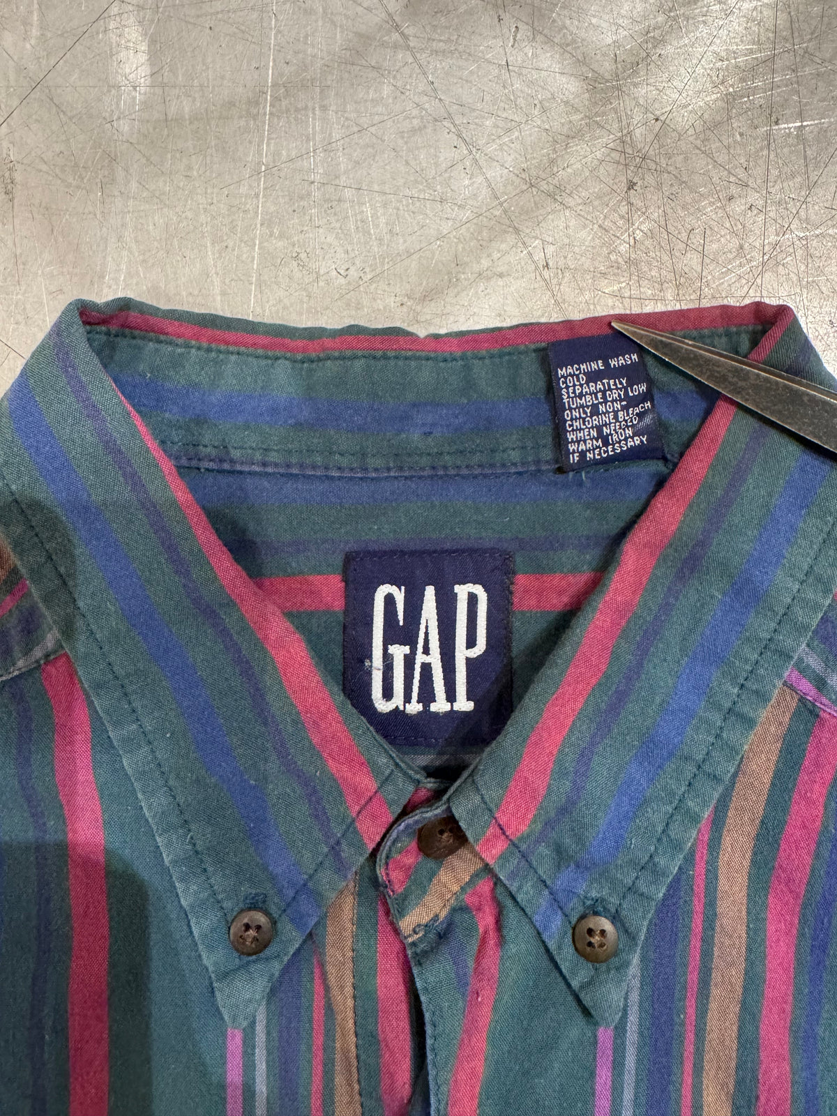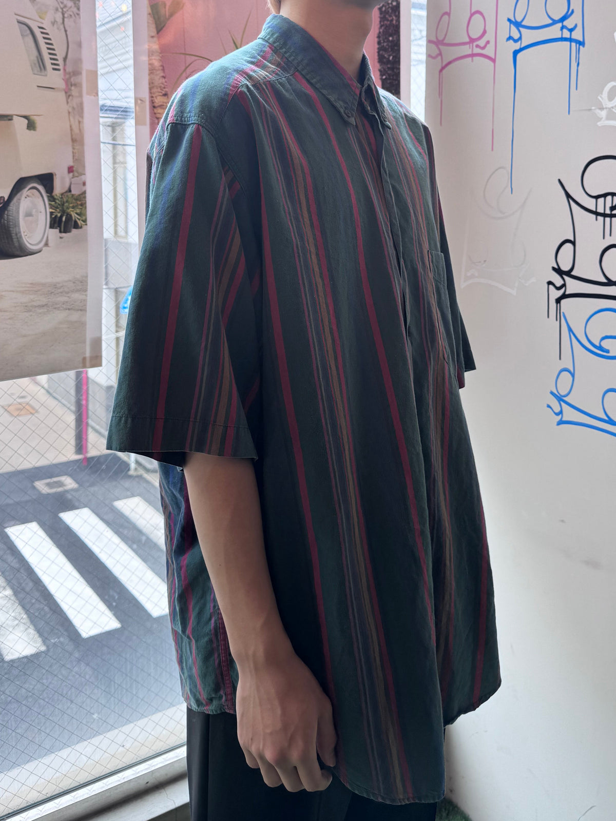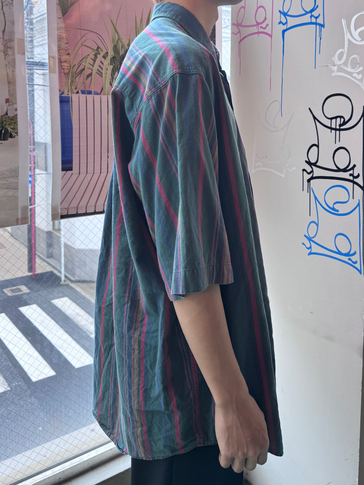 深めのグリーンをベースに、ピンク、ブルー、パープルなどのマルチストライプが印象的な一枚。
