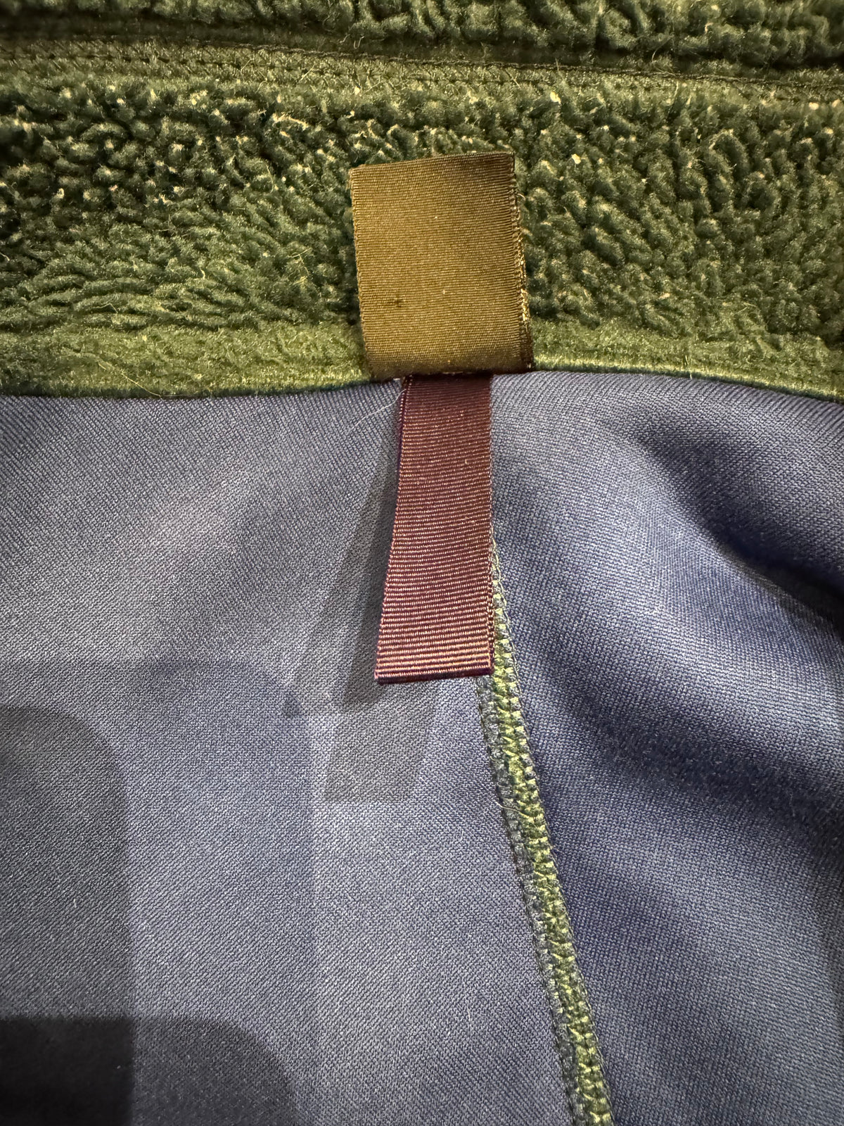 毛足の長い肉厚パイルフリース素材に防風効果のあるポリエステルの裏地を施し、