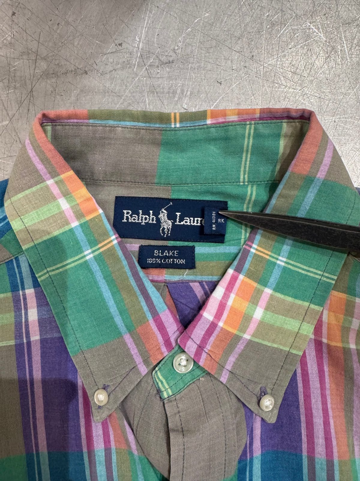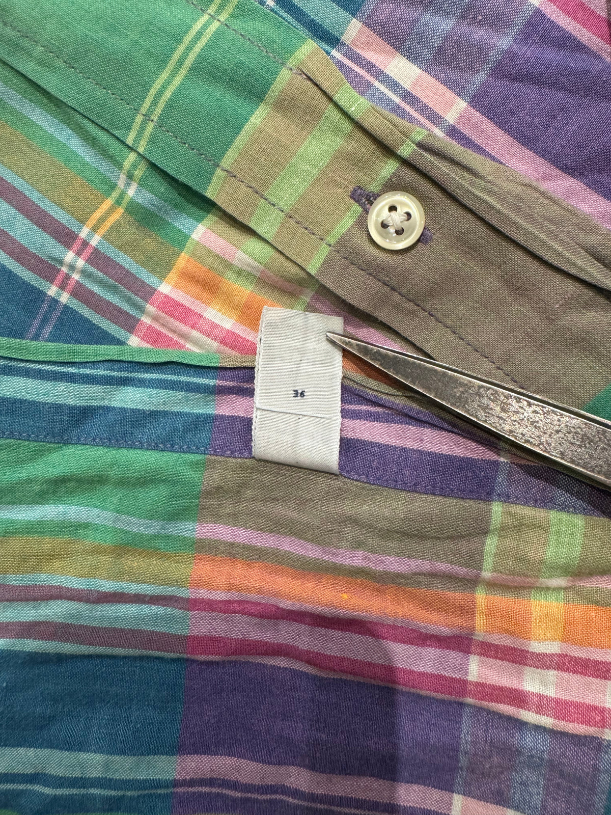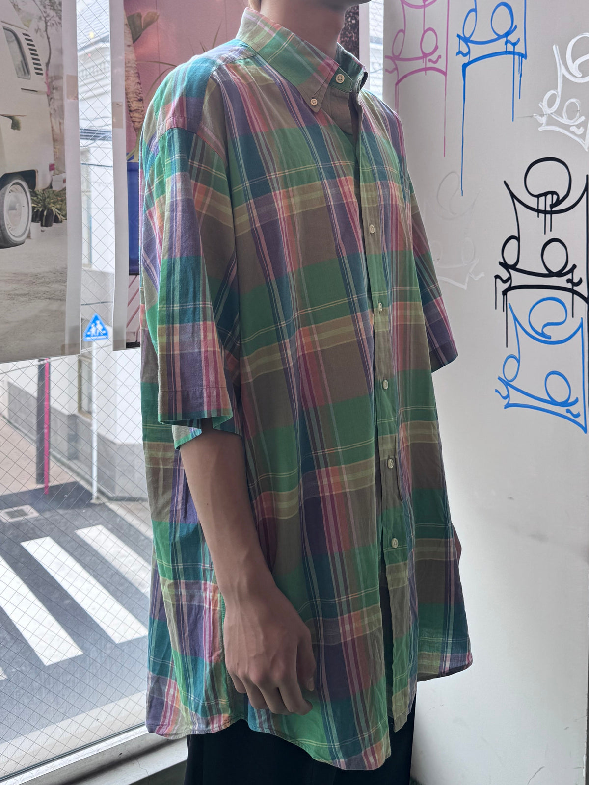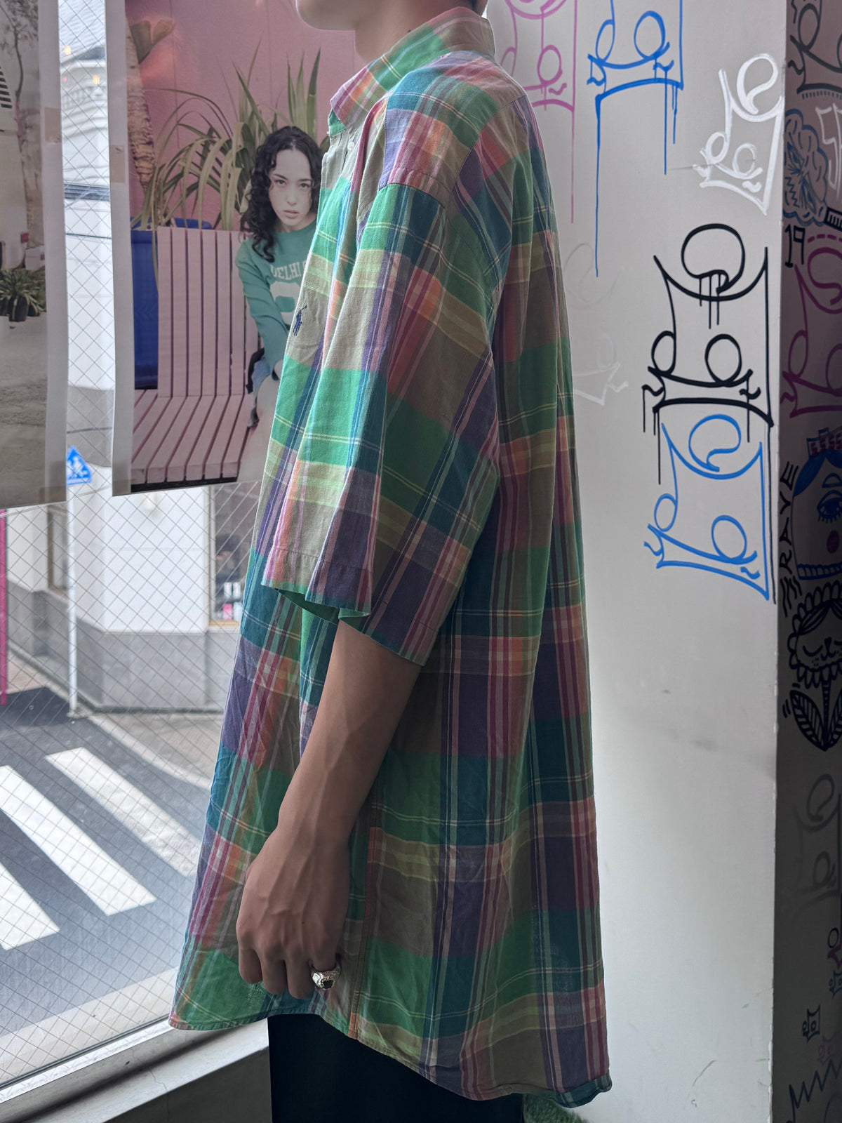 鮮やかなグリーン・パープル・ピンク・ブルーなどのマルチカラーで構成されたマドラスチェック柄が、ラルフらしいクラシックな中にも遊び心を感じさせる一着。