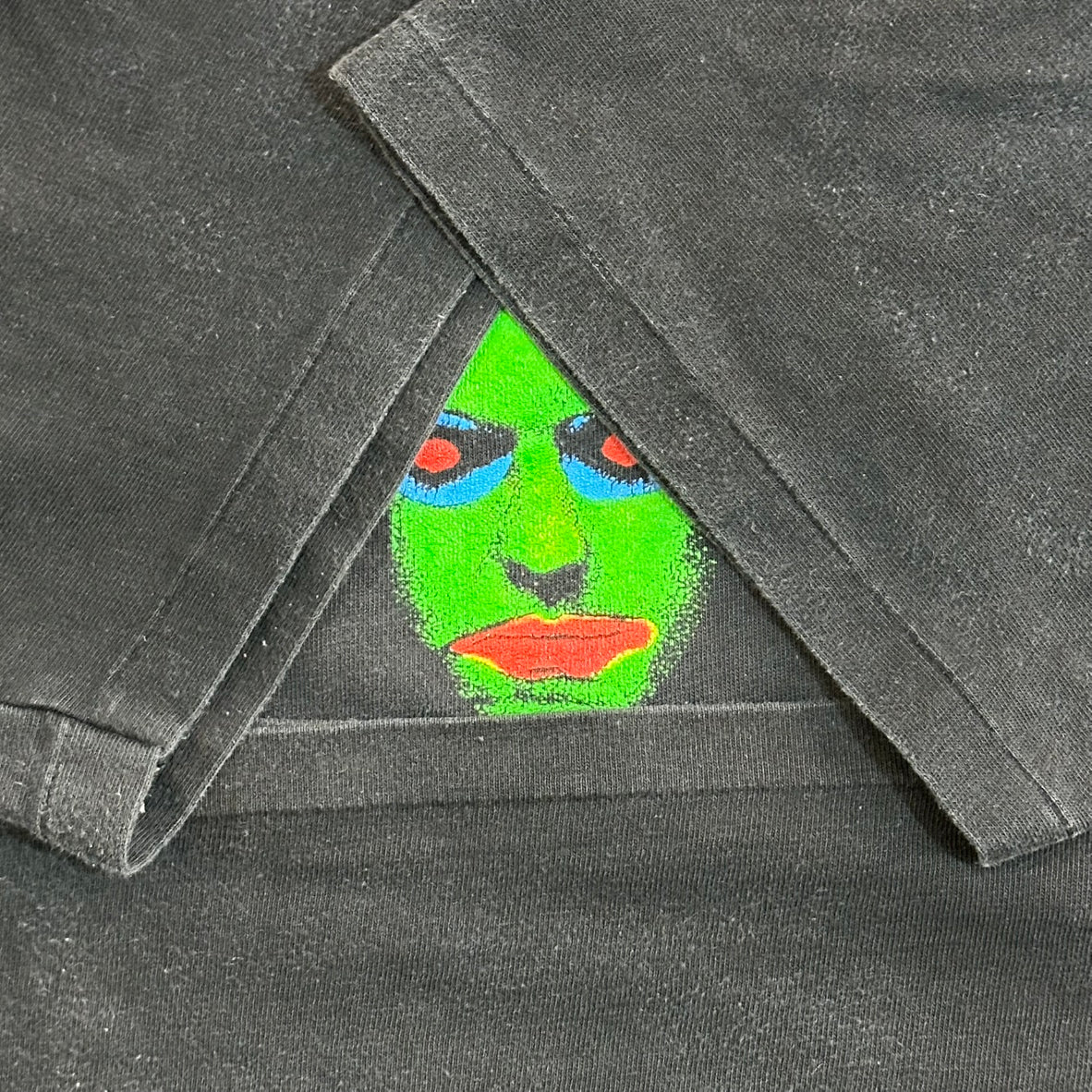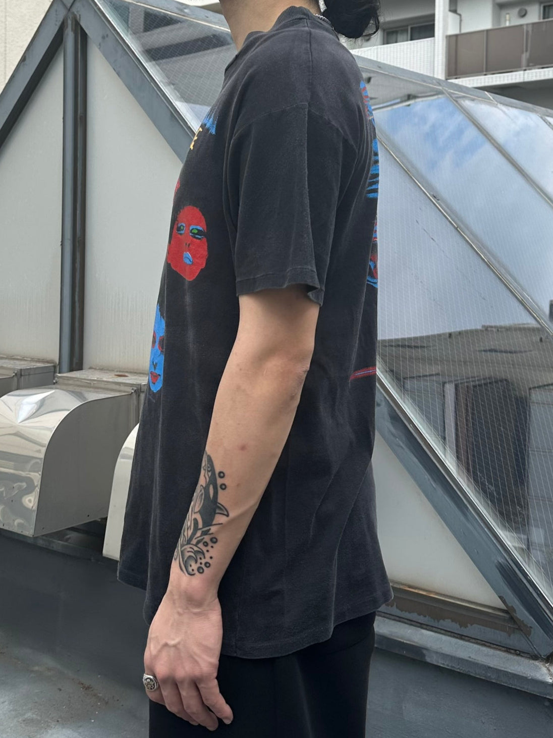 The Cureの「In Between Days」のTシャツです。このTシャツは、バンドのメンバーの顔写真が特徴的にデザインされており、黒地にメンバーの顔がカラフルにプリントされています。