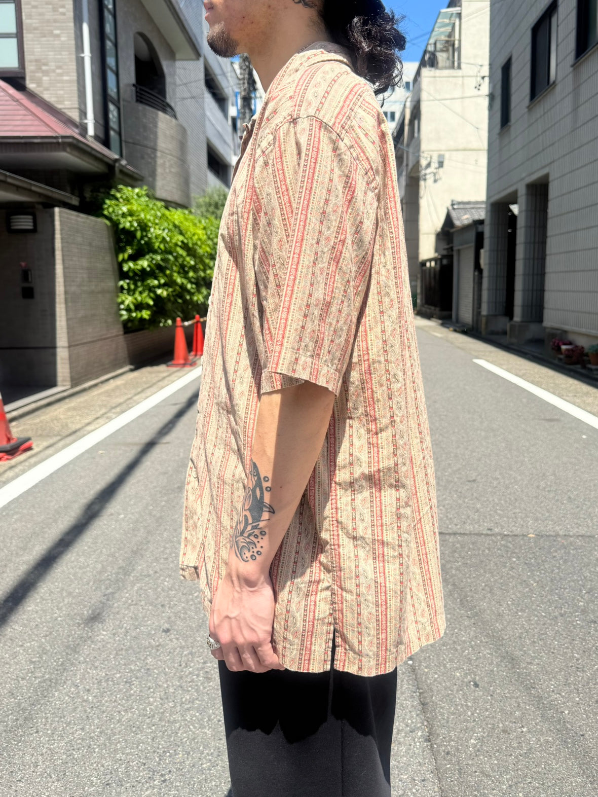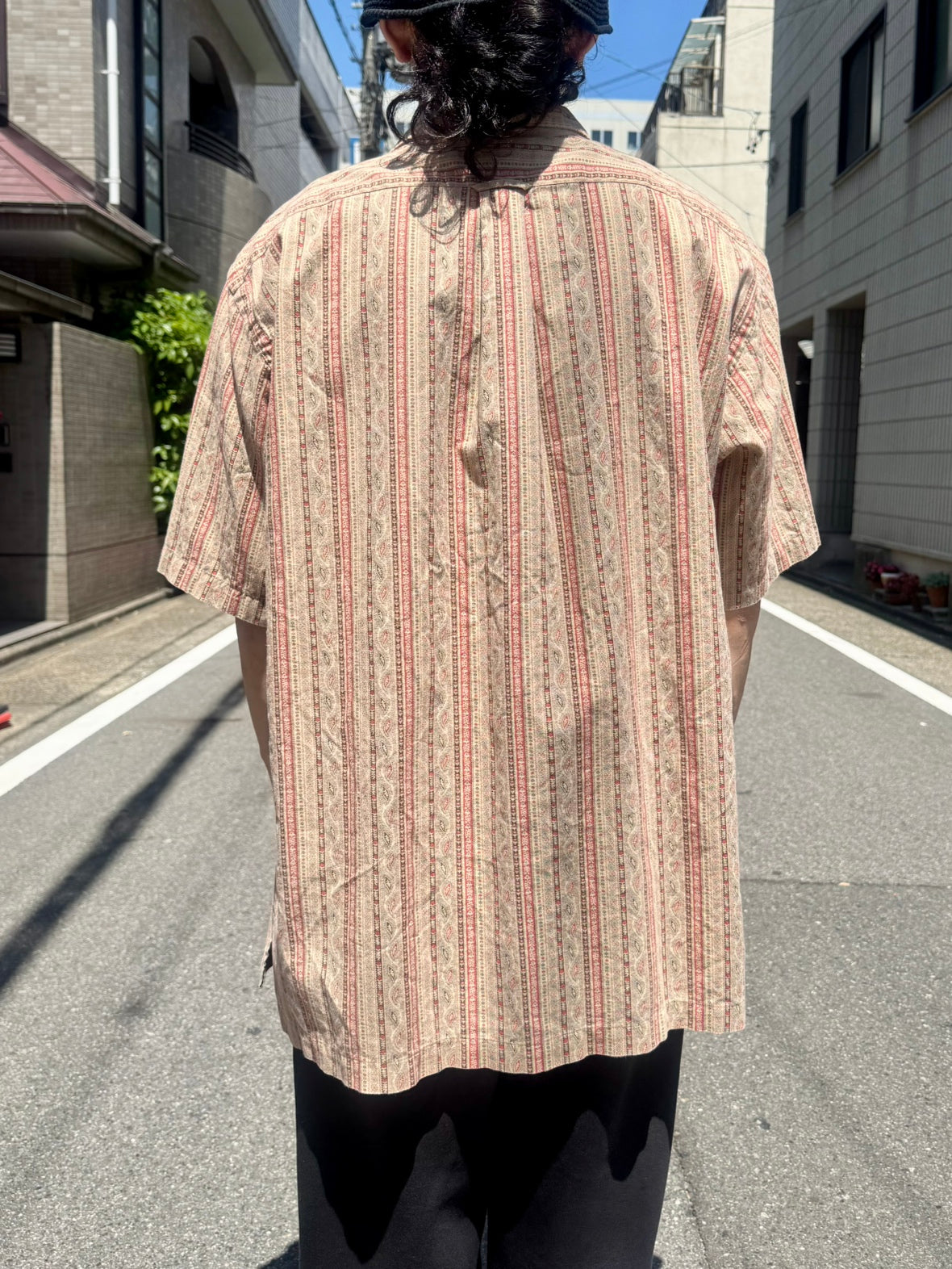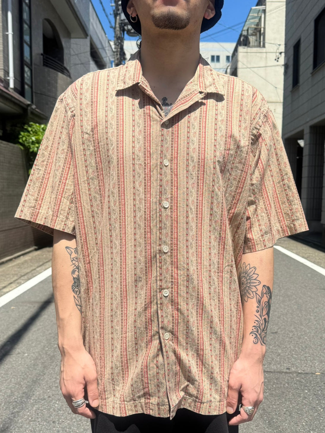 ベージュベースのボディーにストライプの総柄がプリントされています。