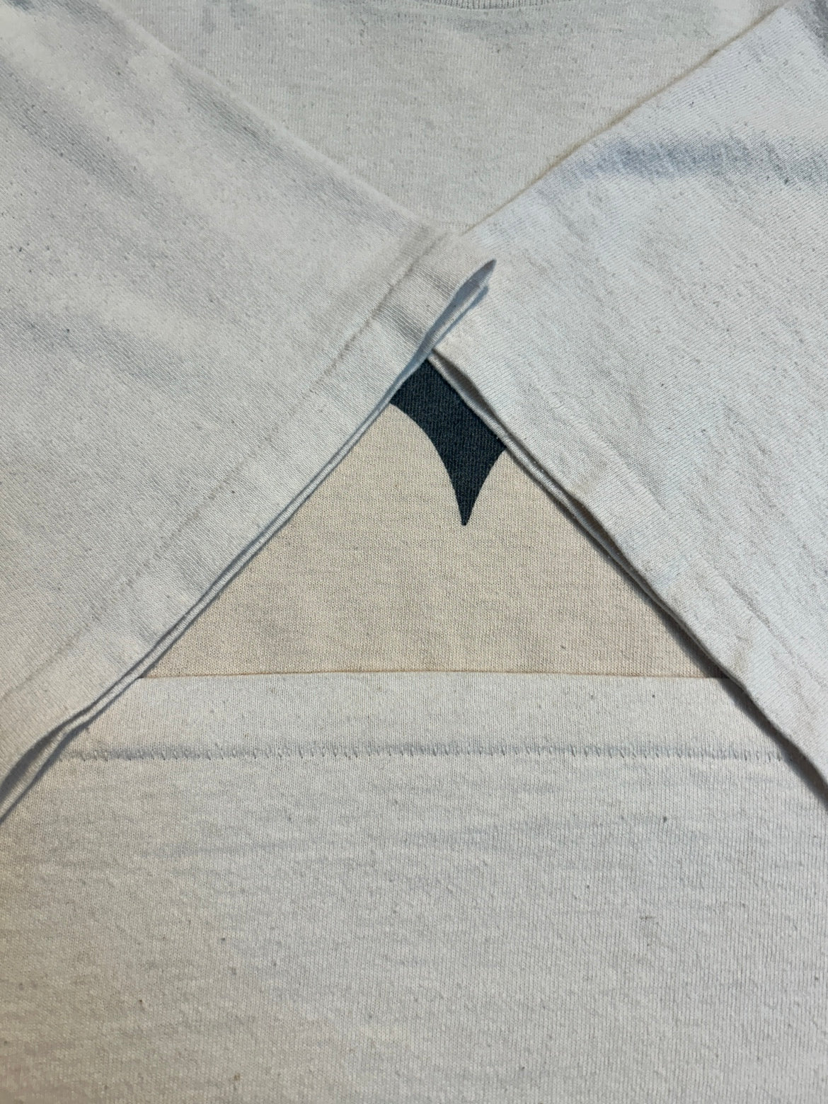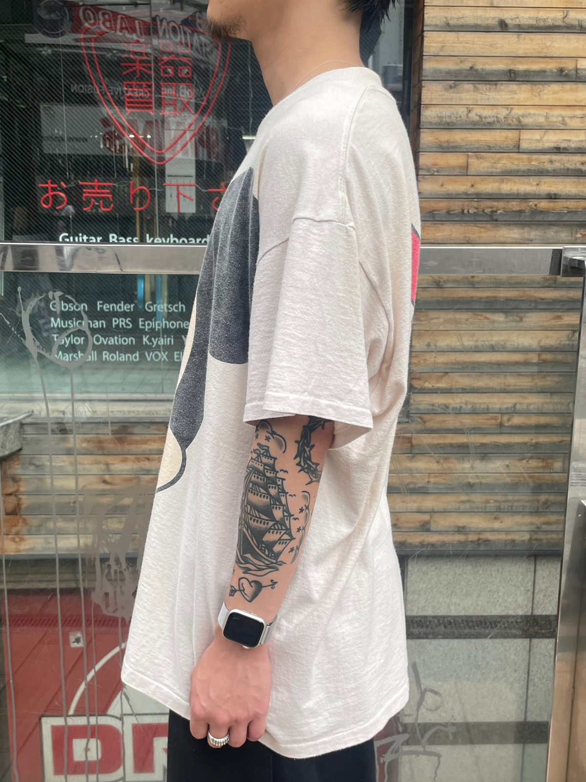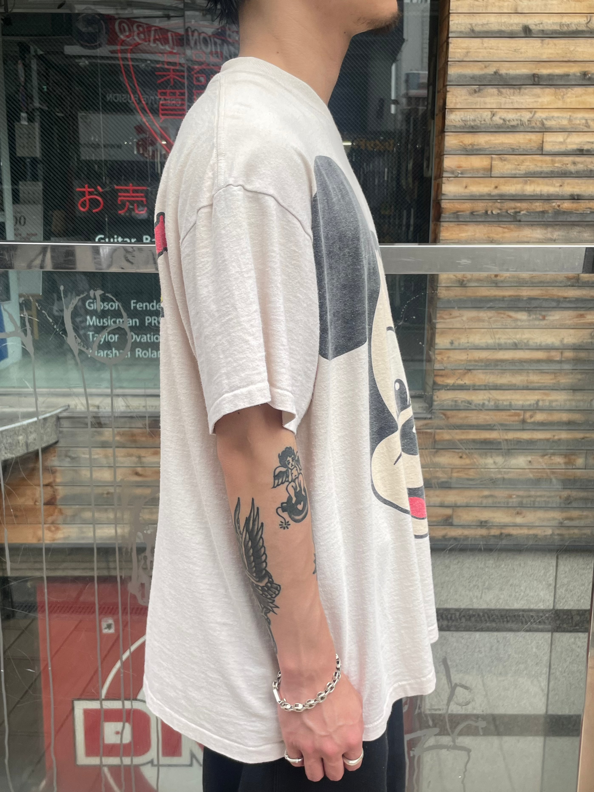 ベージュに近いナチュラルカラーのボディに、シンプルながら存在感のあるグラフィックが映える一枚です。