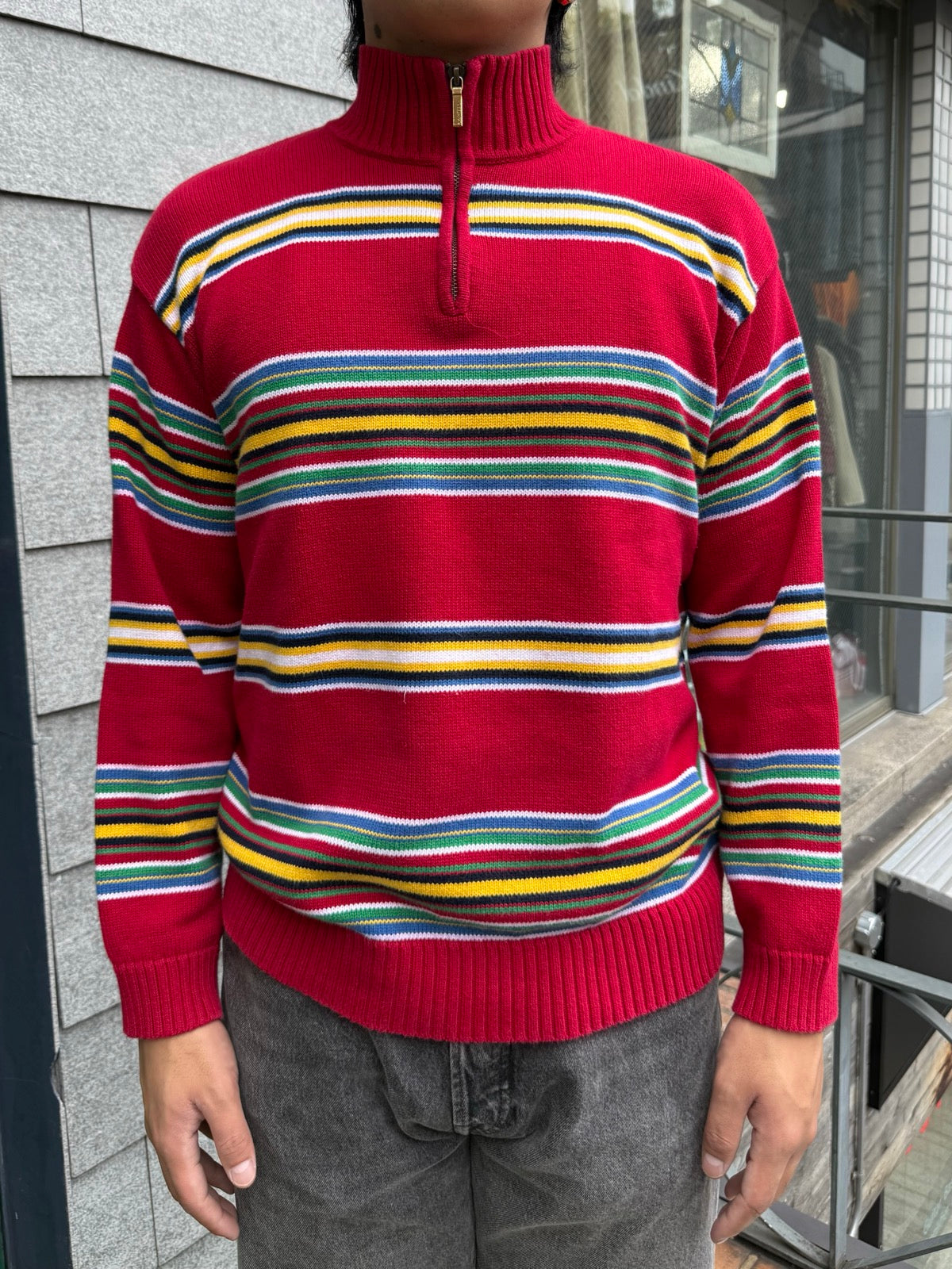 鮮やかなレッドをベースに、イエロー・グリーン・ブルー・ホワイトのマルチボーダーが映える、『Lauren Ralph Lauren』のハーフジップセーター。