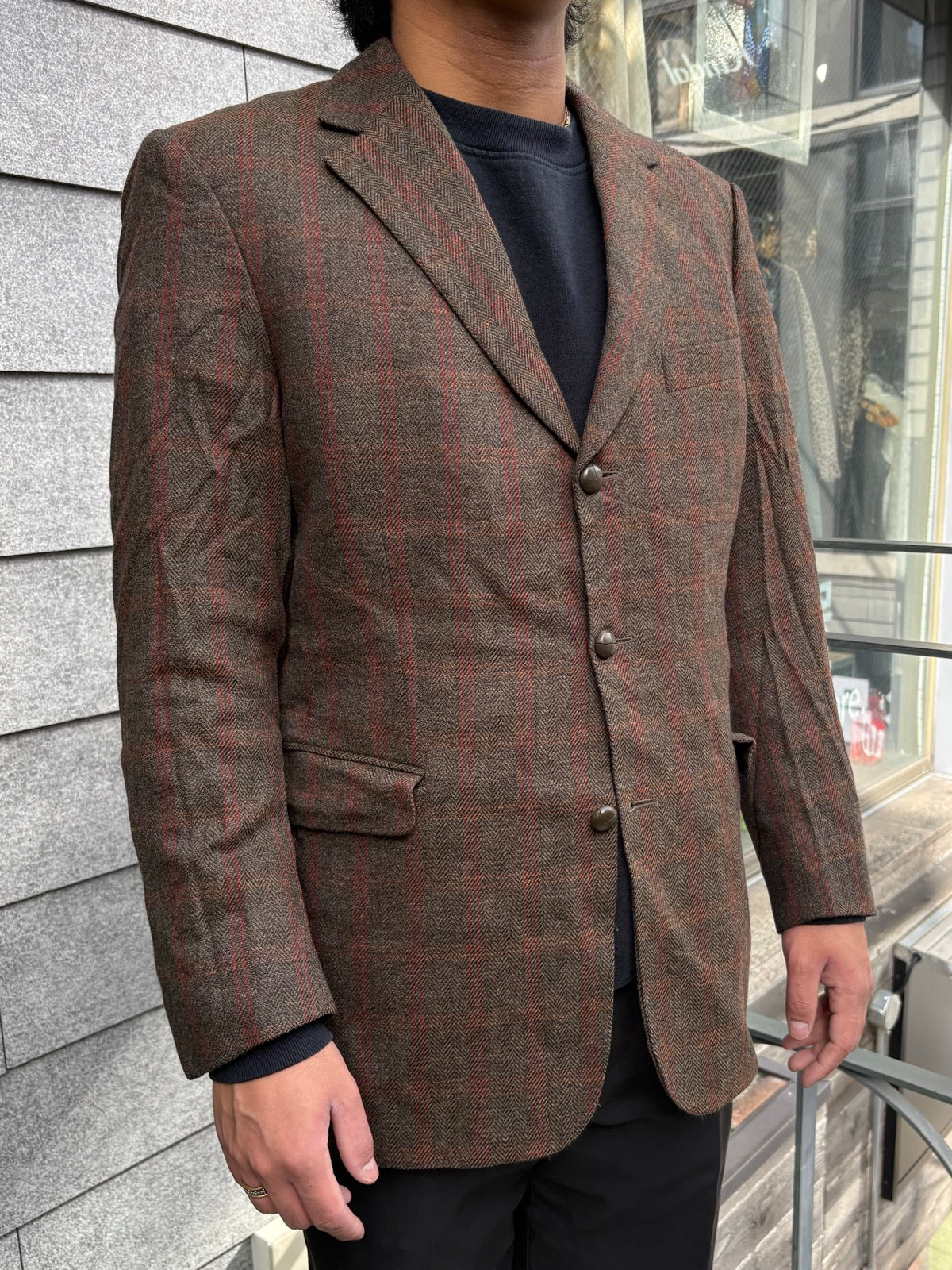ヘリンボーンに赤の細いチェックが入ったクラシックなツイード調の生地で、上品さと程よい存在感を兼ね備えた一着です。
