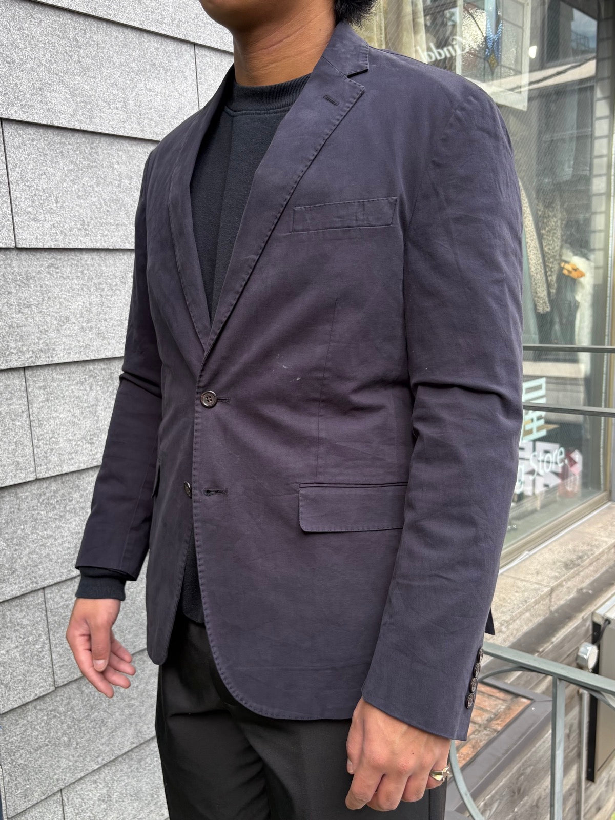 2ボタン構成のクラシックなディテールに、柔らかいネイビーの色味が上品な印象。