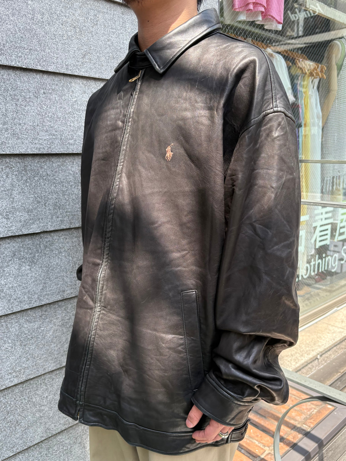 フロントは「POLO」刻印入りの真鍮調メタルジッパーを使用。襟元にはチンストラップを備え、機能性とデザイン性を両立しています。