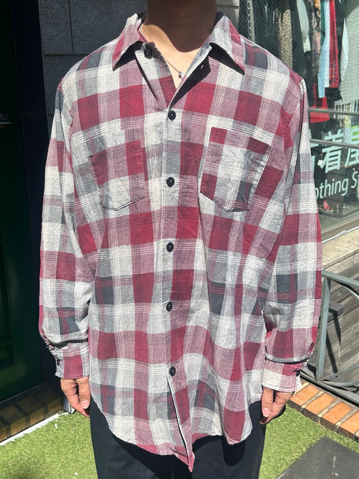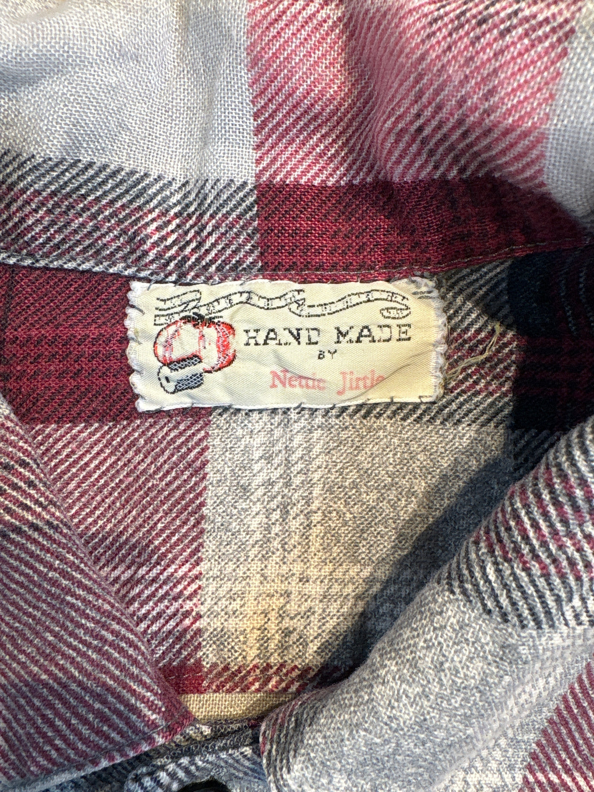 個性的なハンドメイドネルシャツ「Hand Made by Nettie Jird」、ワインレッドとグレーを基調としたブロックチェックが目を引く一枚です。