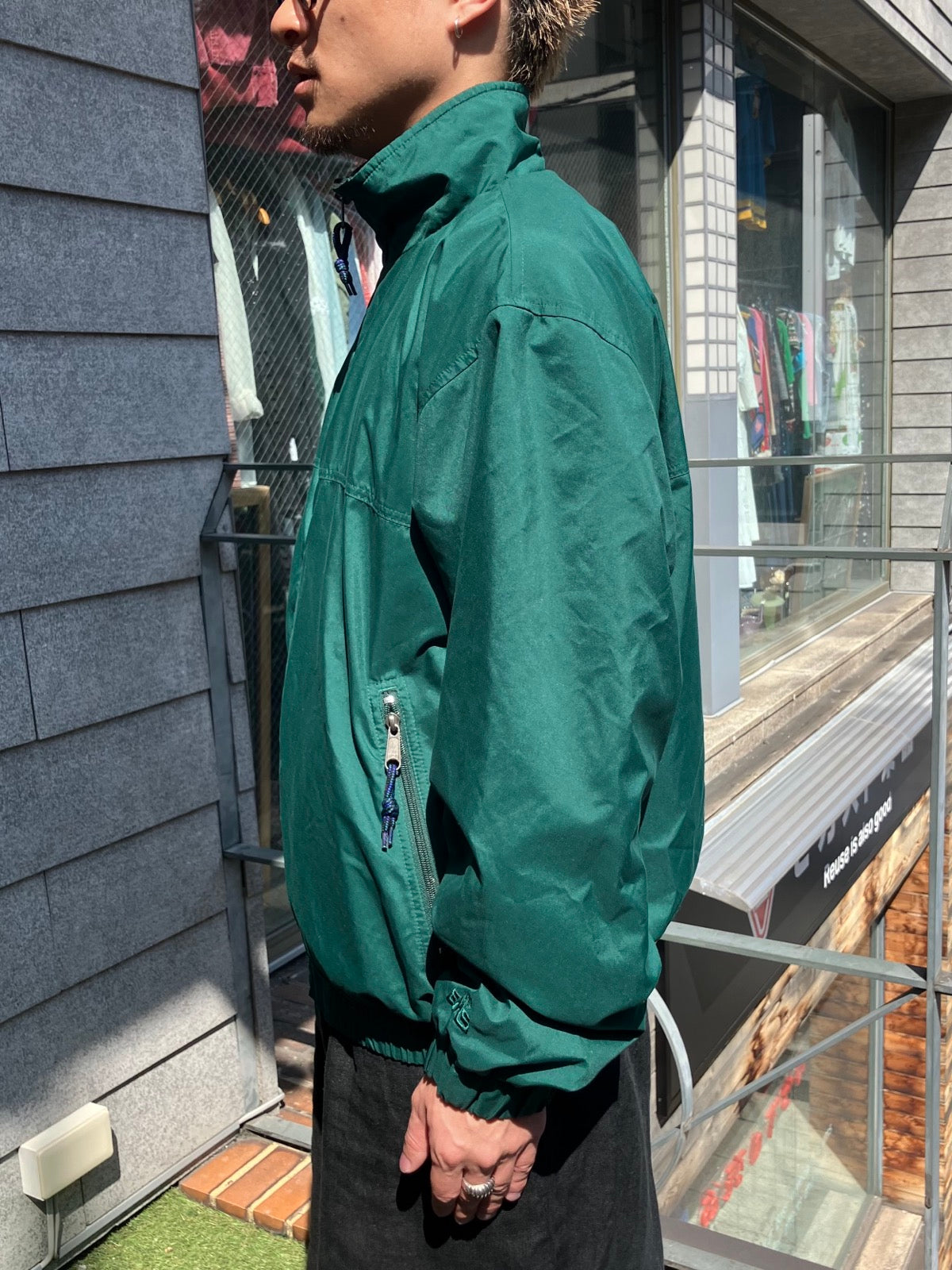 グリーンカラーがスタイリングのアクセントになる一着です。
