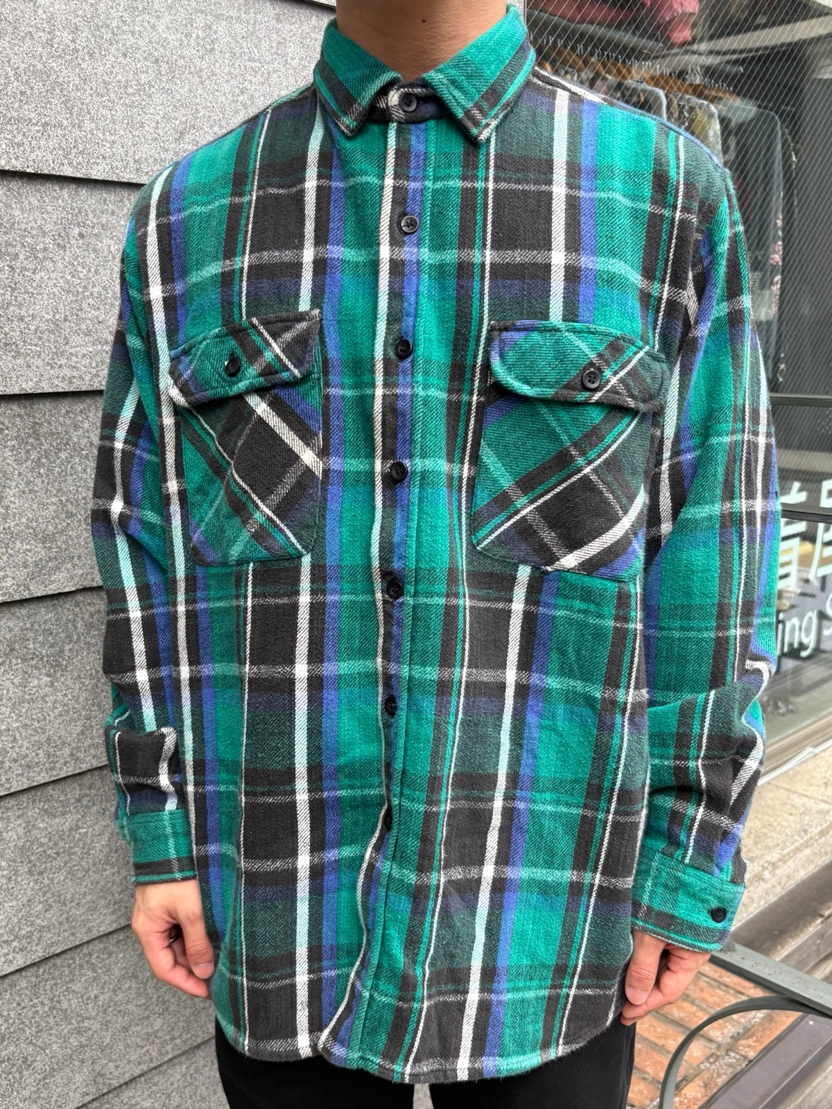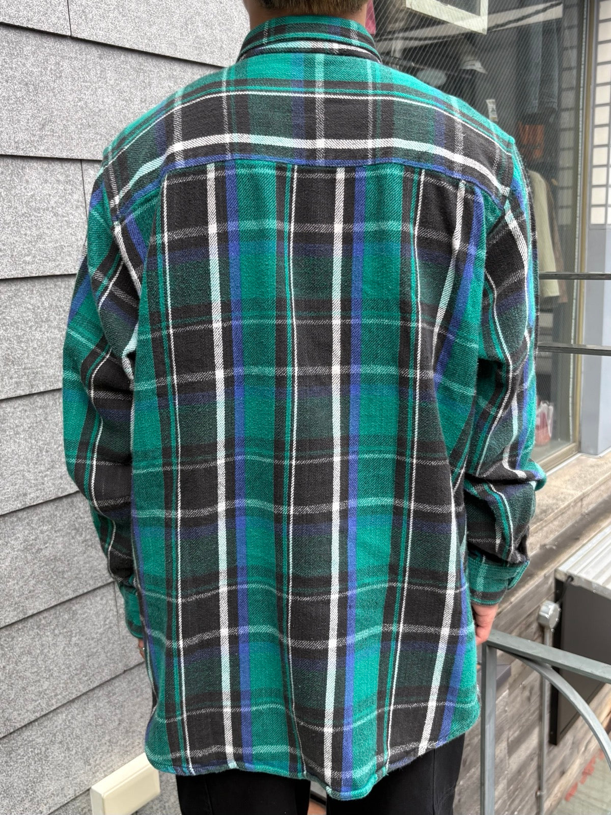 肉厚で柔らかなコットンネル生地に、グリーン×ブラック×ブルーのチェックが際立つ一枚。
