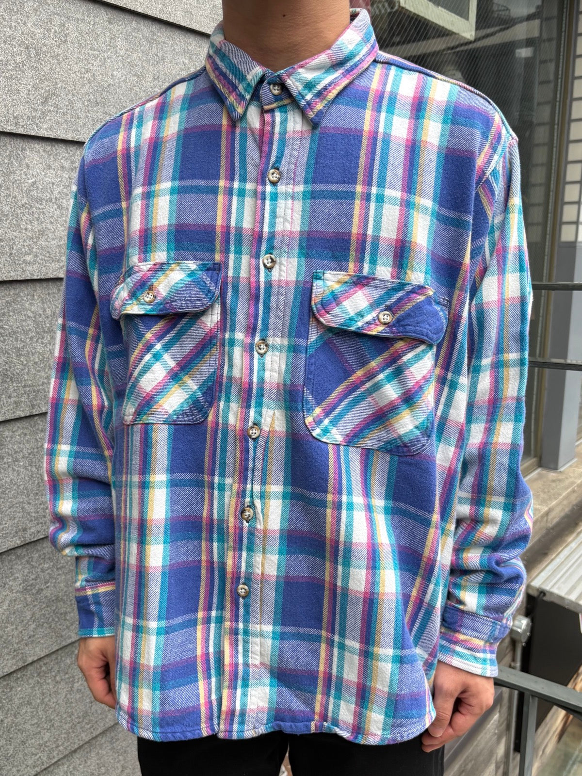 柔らかなコットンネルに、発色の良いパープル×ピンク×イエローのチェックが映える一枚。