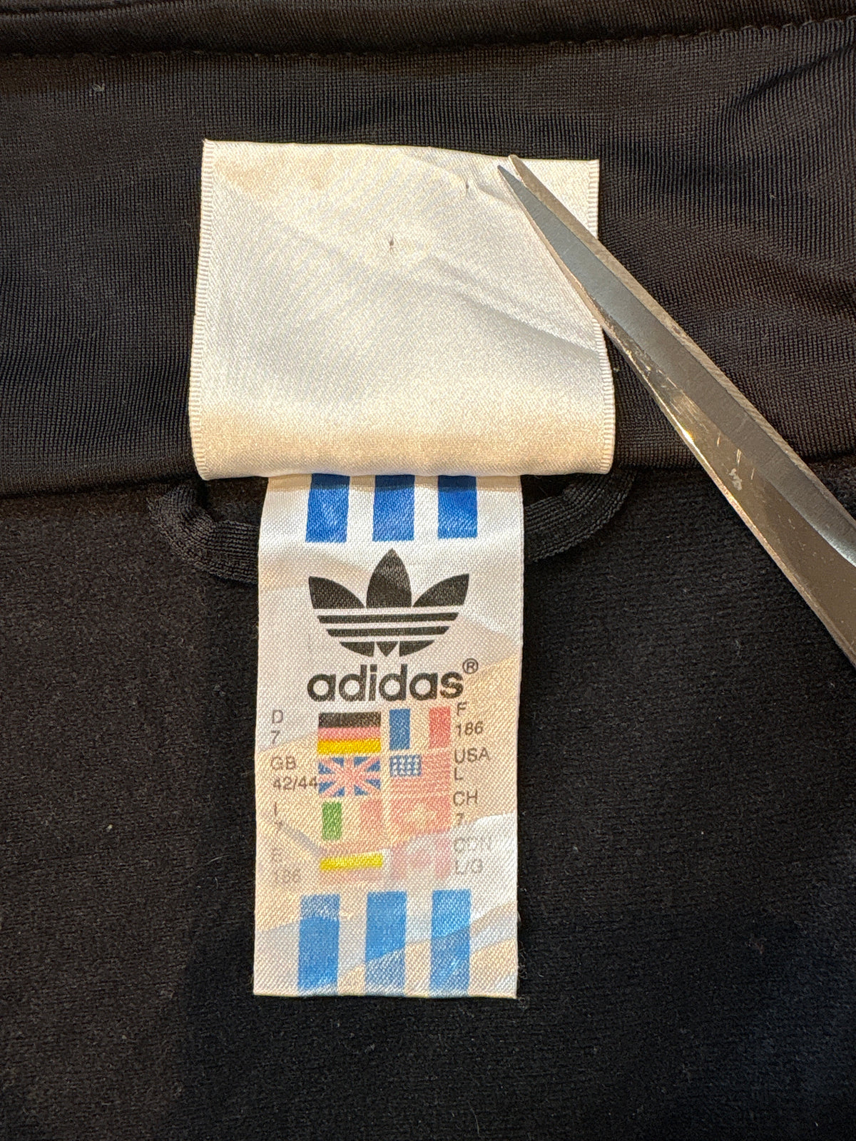 胸元のトレフォイルロゴ、スリーストライプが映えるクラシックな1着です。