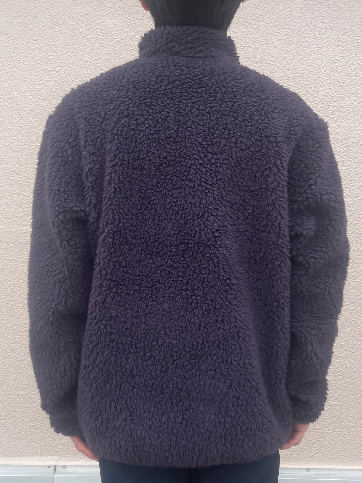 ボアのように毛足の長いポリエステルフリースを使用し、裏地には防風性の高いナイロンメッシュを採用。
