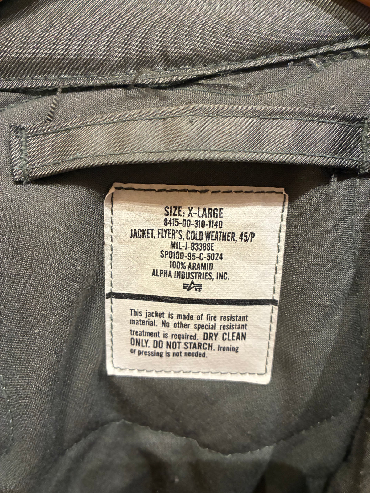 こちらは軍へ正式に納入していたALPHA INDUSTRIES社製の実物で、タグのコントラクトNO.「SPO100-95-C-5024」から1995年度製造のミリタリーオリジナルと判別できる一着です。