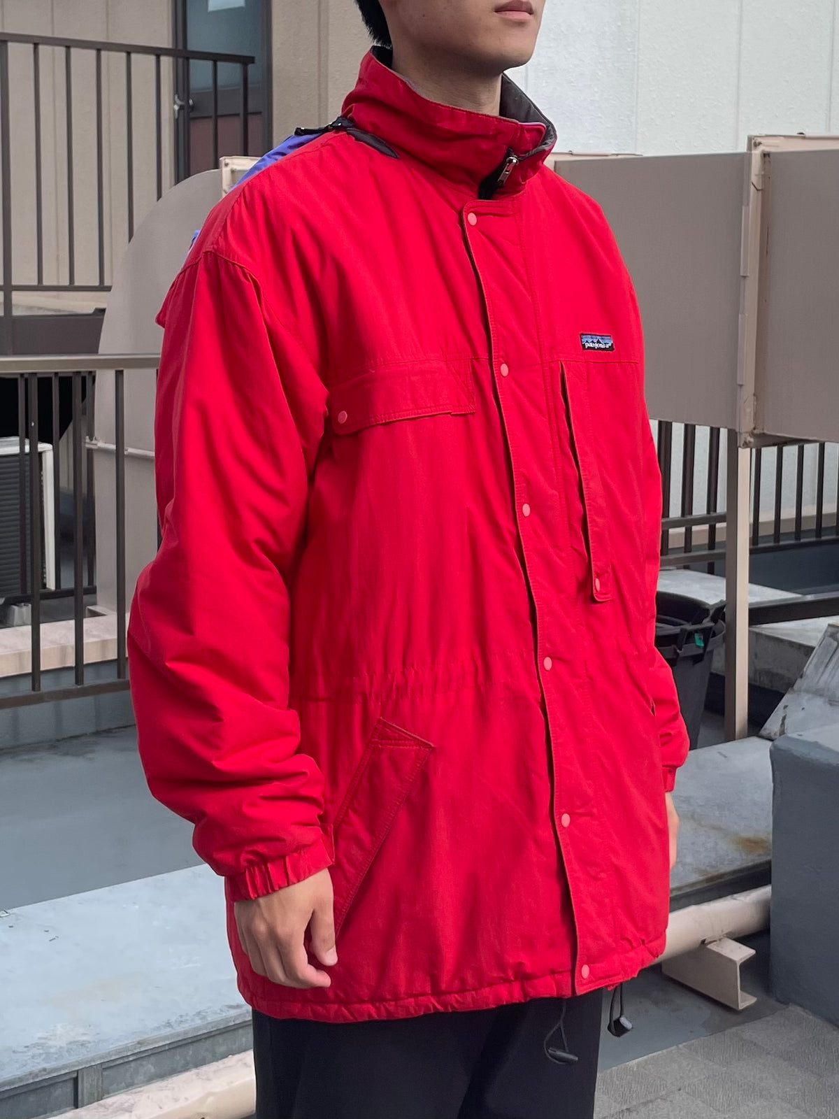 鮮やかな赤が目を引く、パタゴニアのパテッドナイロンジャケット。