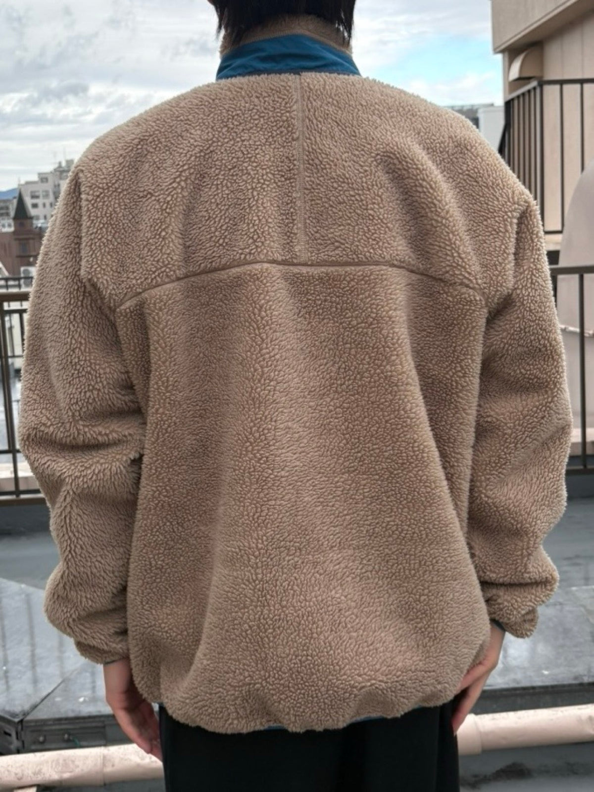 外側はふんわりとしたボアフリース、内側には防風メッシュを採用し、冷たい風をしっかり遮断。