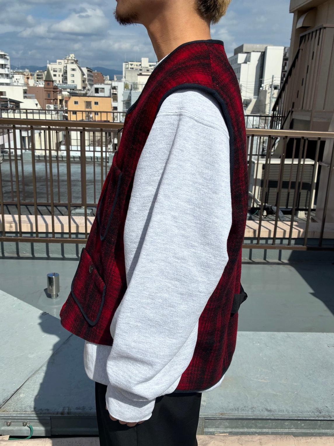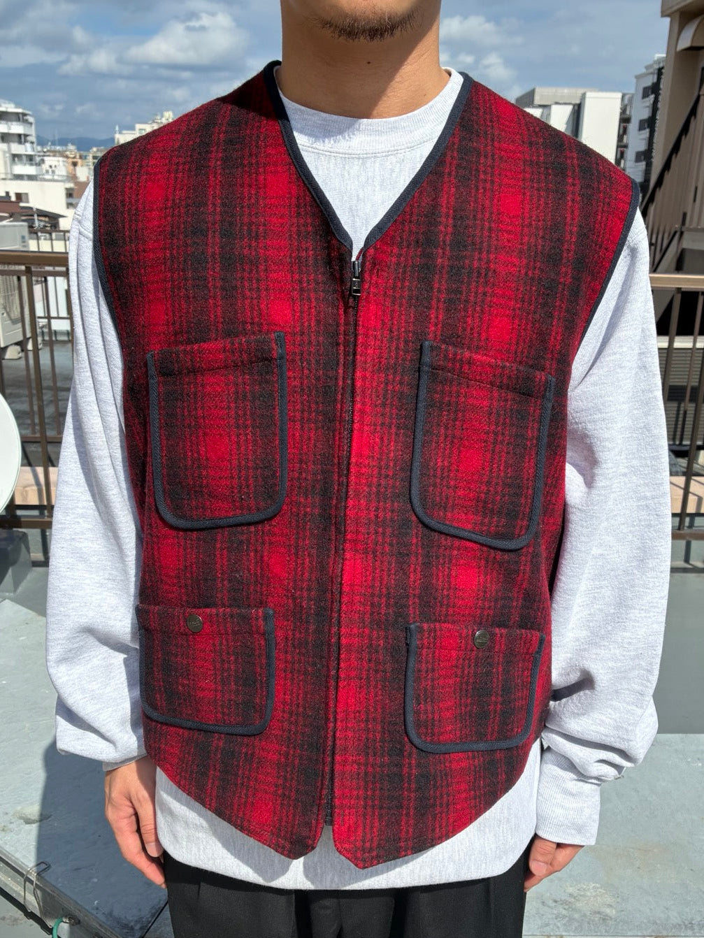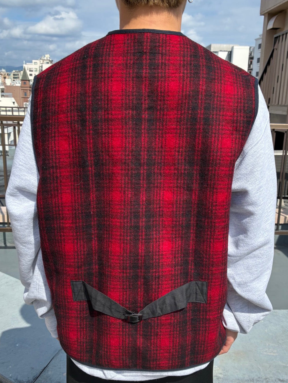 クラシックな赤×黒バッファローチェックが目を引くウールベスト。