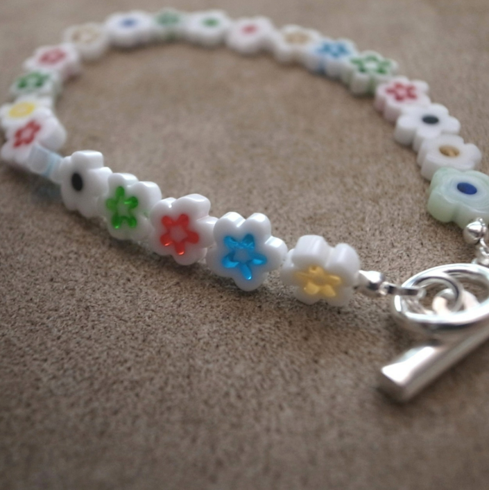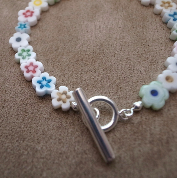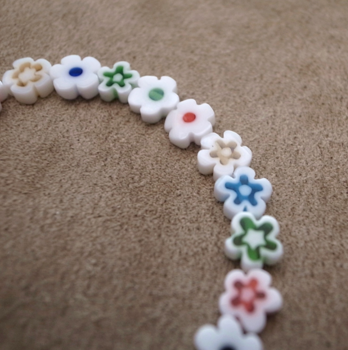 ミッレフィオーリ ビーズ ブレスレット- ホワイト マルチ フラワー