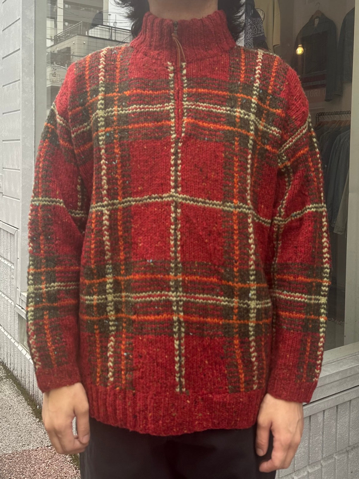 タータンチェック柄のハーフジップニット。