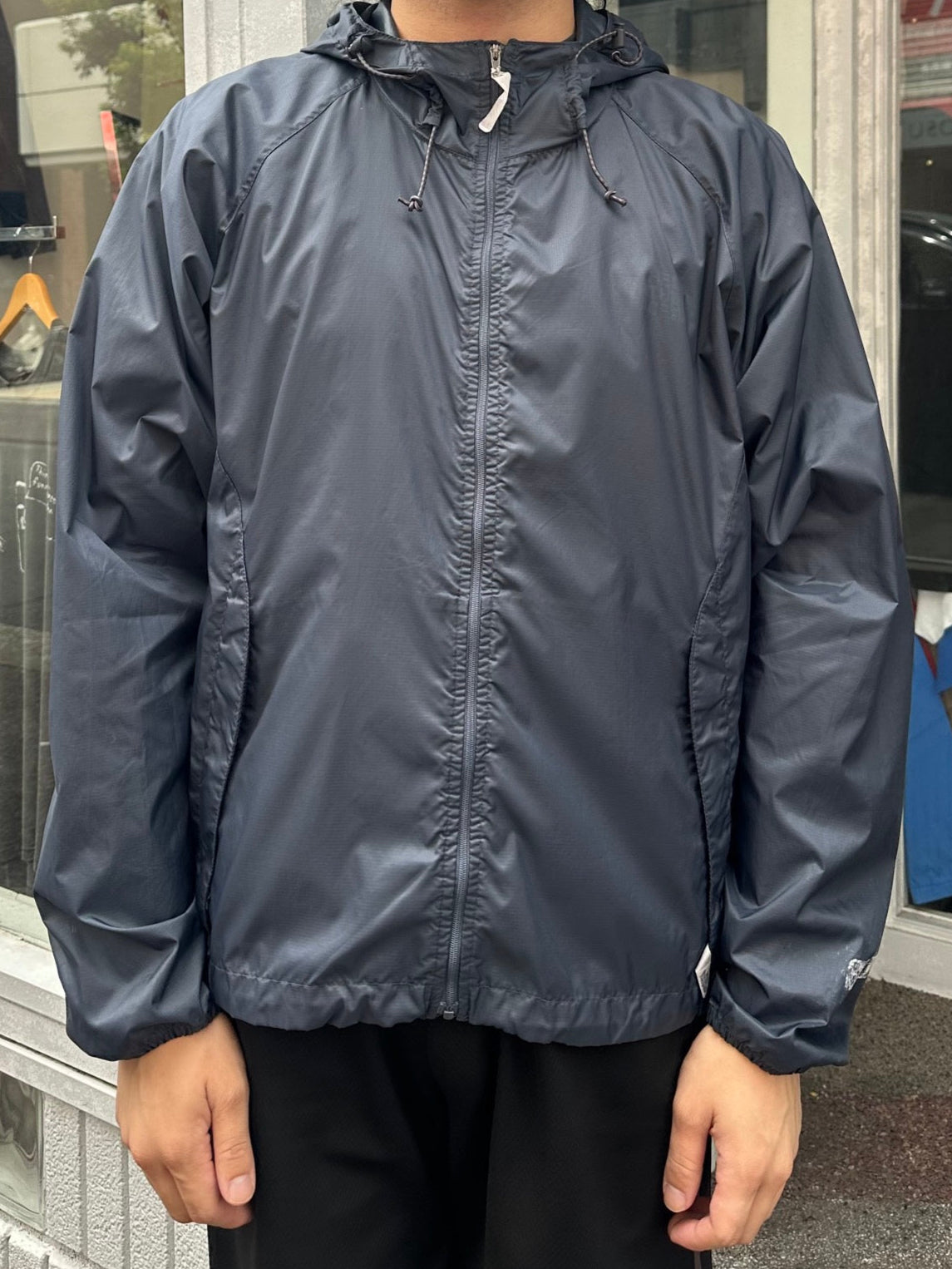 レインパーカーのような風合いでブラックのパンツ、ブルーデニムや