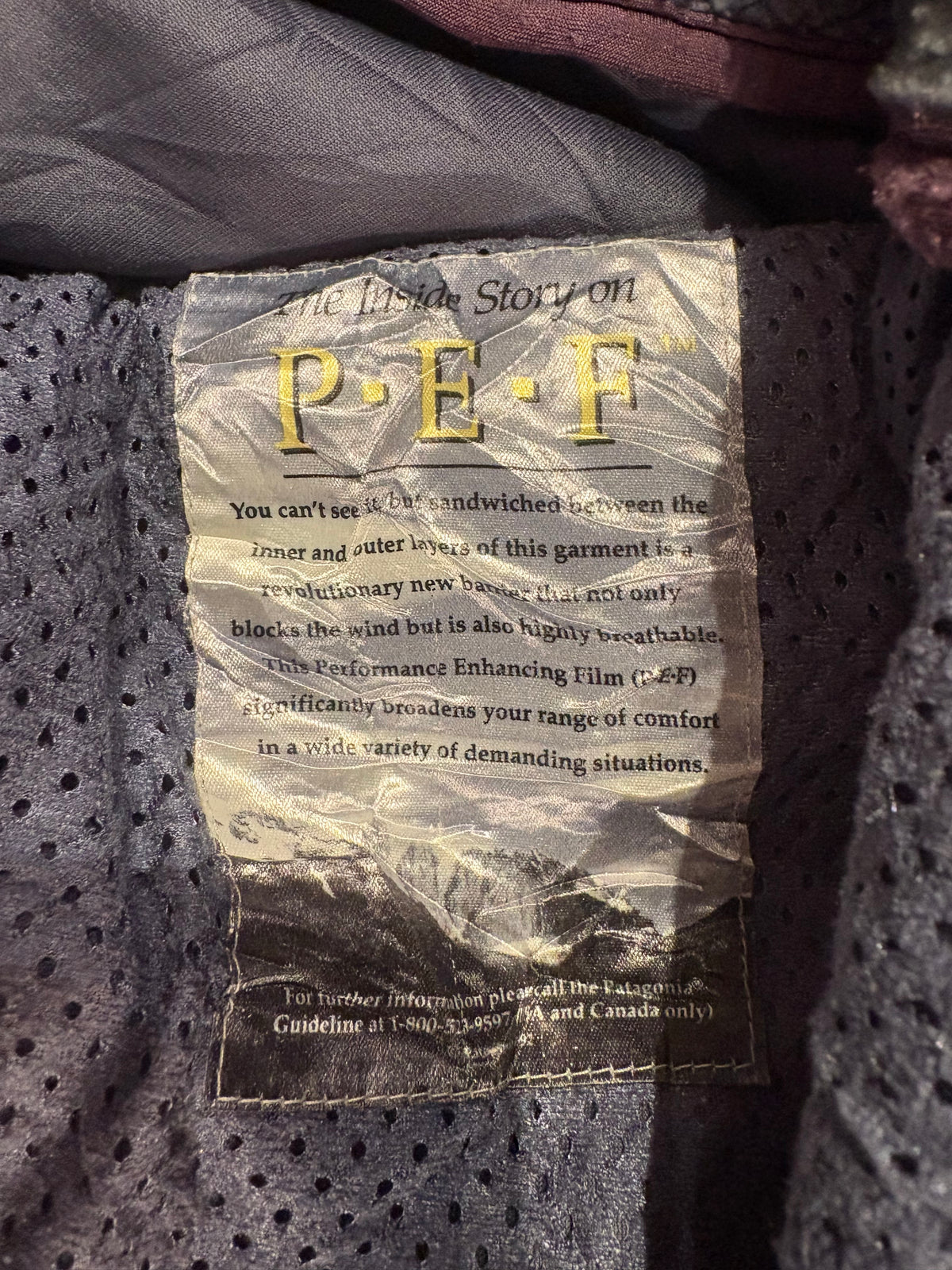 内側についているPEFは性能強化フィルム(Performance Enhancing Film)の事であり、1990年代のPatagonia製品に採用されていた、防風性・透湿性を高めるための特殊フィルムや技術を指します。
