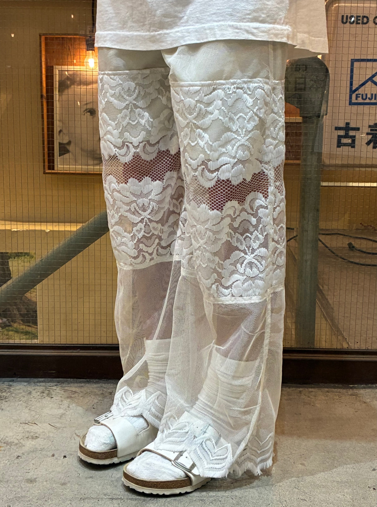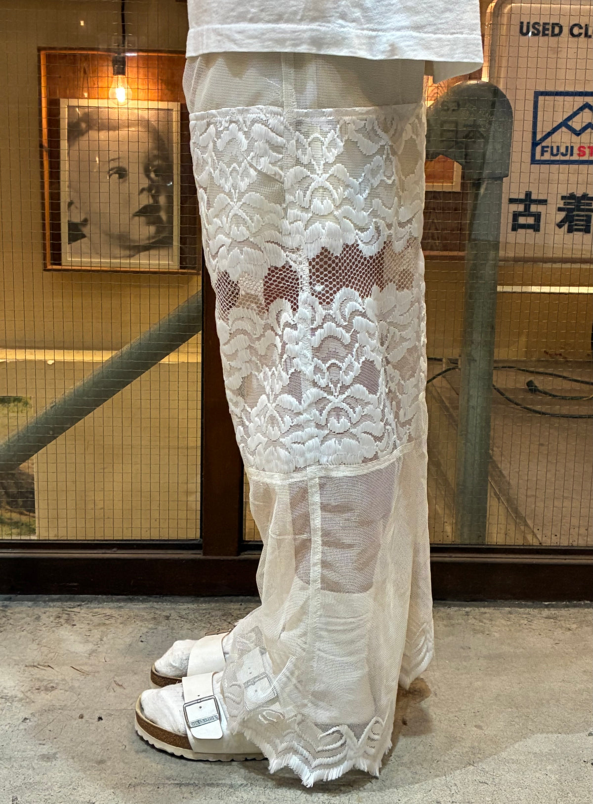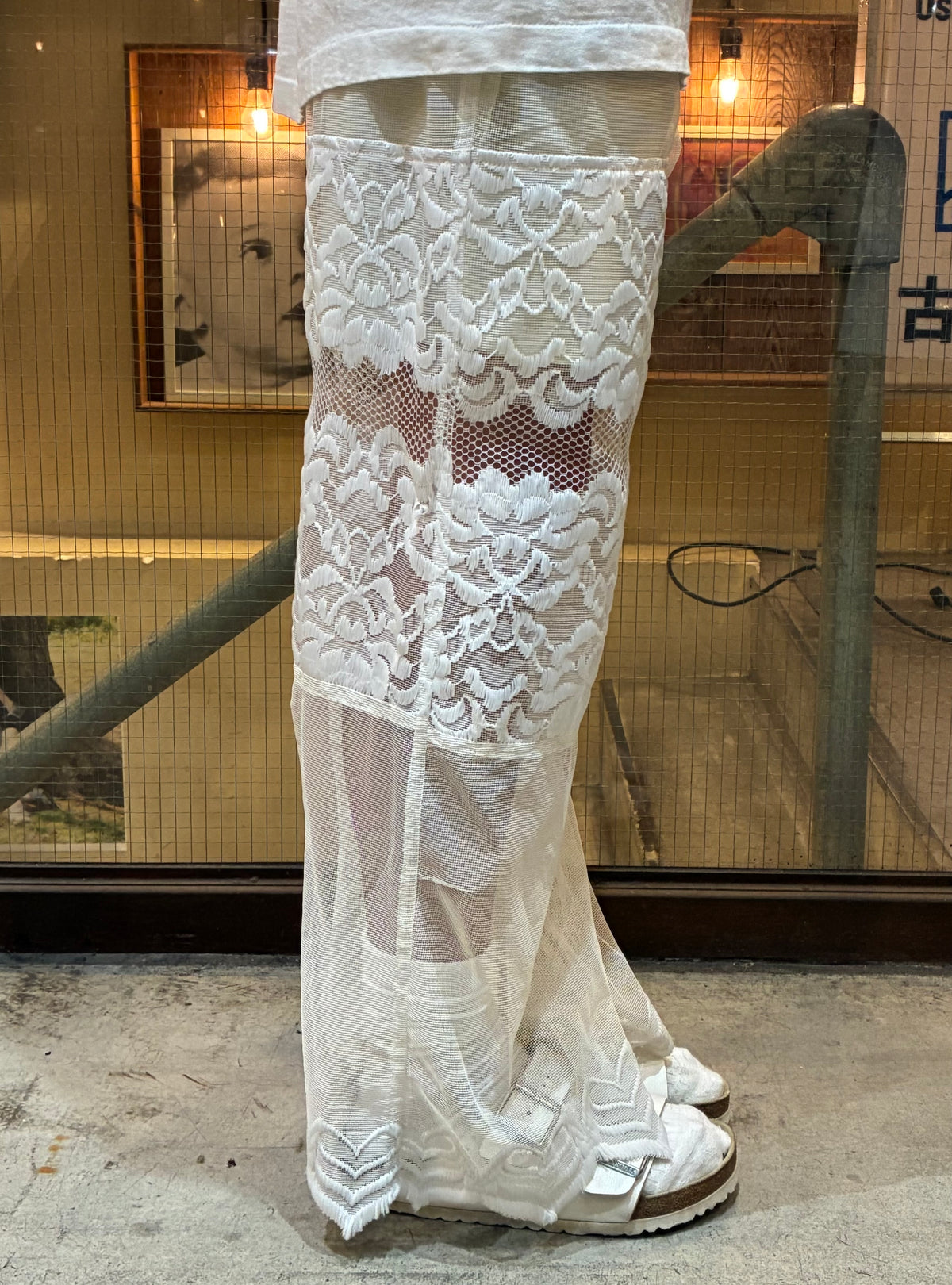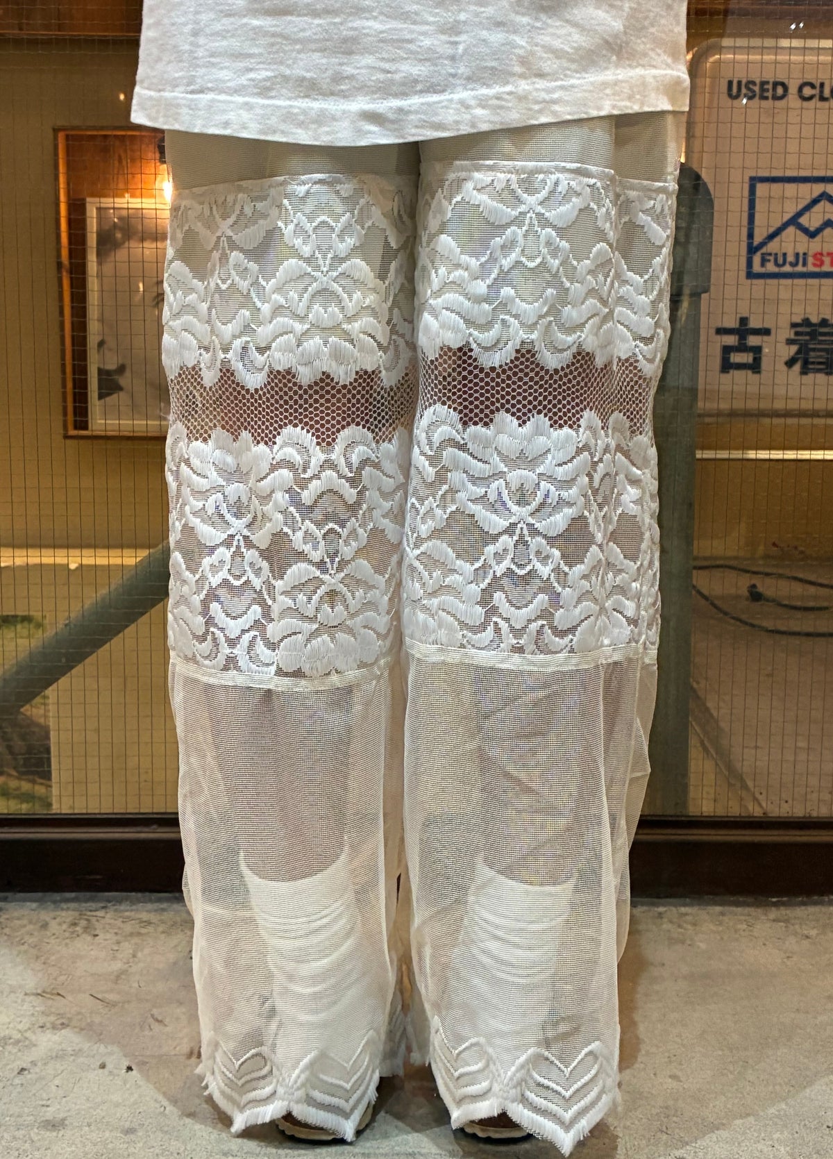 vintageのレース生地を使ったリメイクのロングパンツです。
